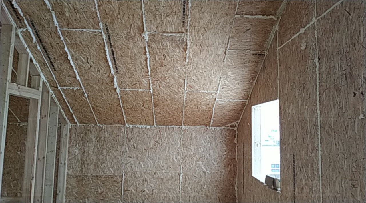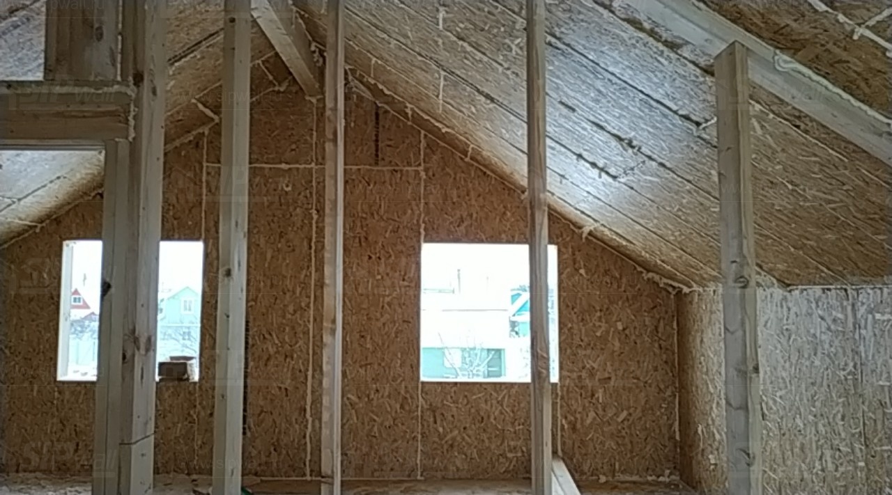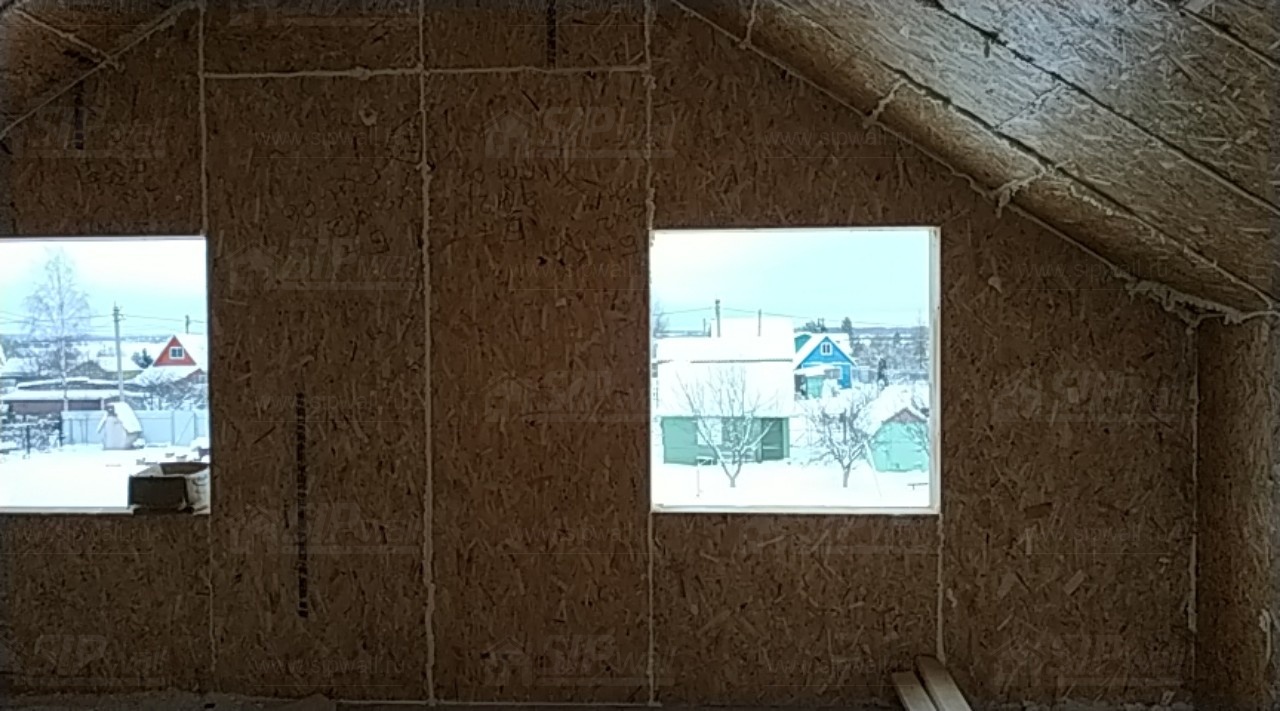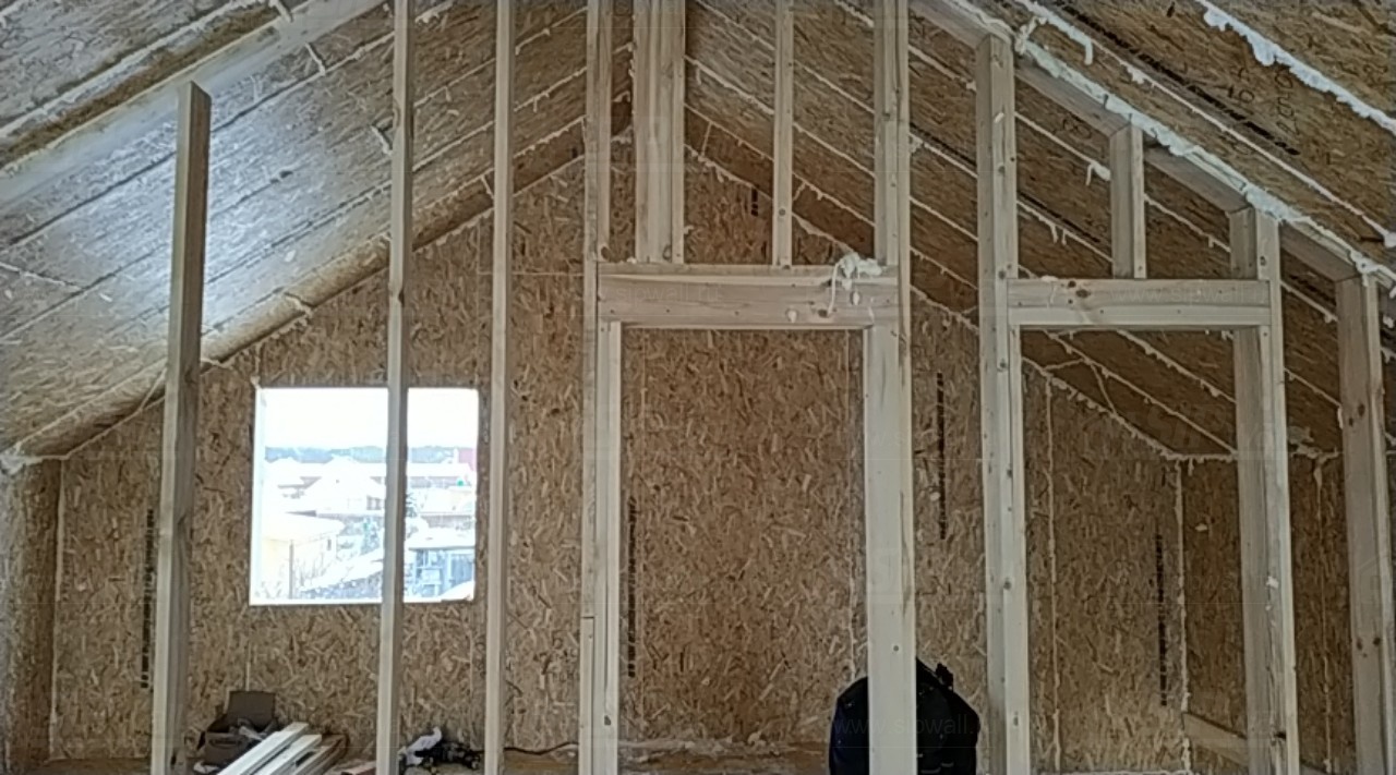 Все СИП панели SIPwall толщиной 224/174/124 мм (плиты OSB-3 толщиной 12 мм "Калевала" Россия и фасадный пенополистирол ПСБ-С 25Ф по ТУ 22.21.41.110−004 – 44755395 −2017 толщиной 200/150/100 мм производства завода "PolarPlast", Россия) нарезаны и обрусованы сухим строганным брусом камерной сушки в соответствии с проектной документацией.