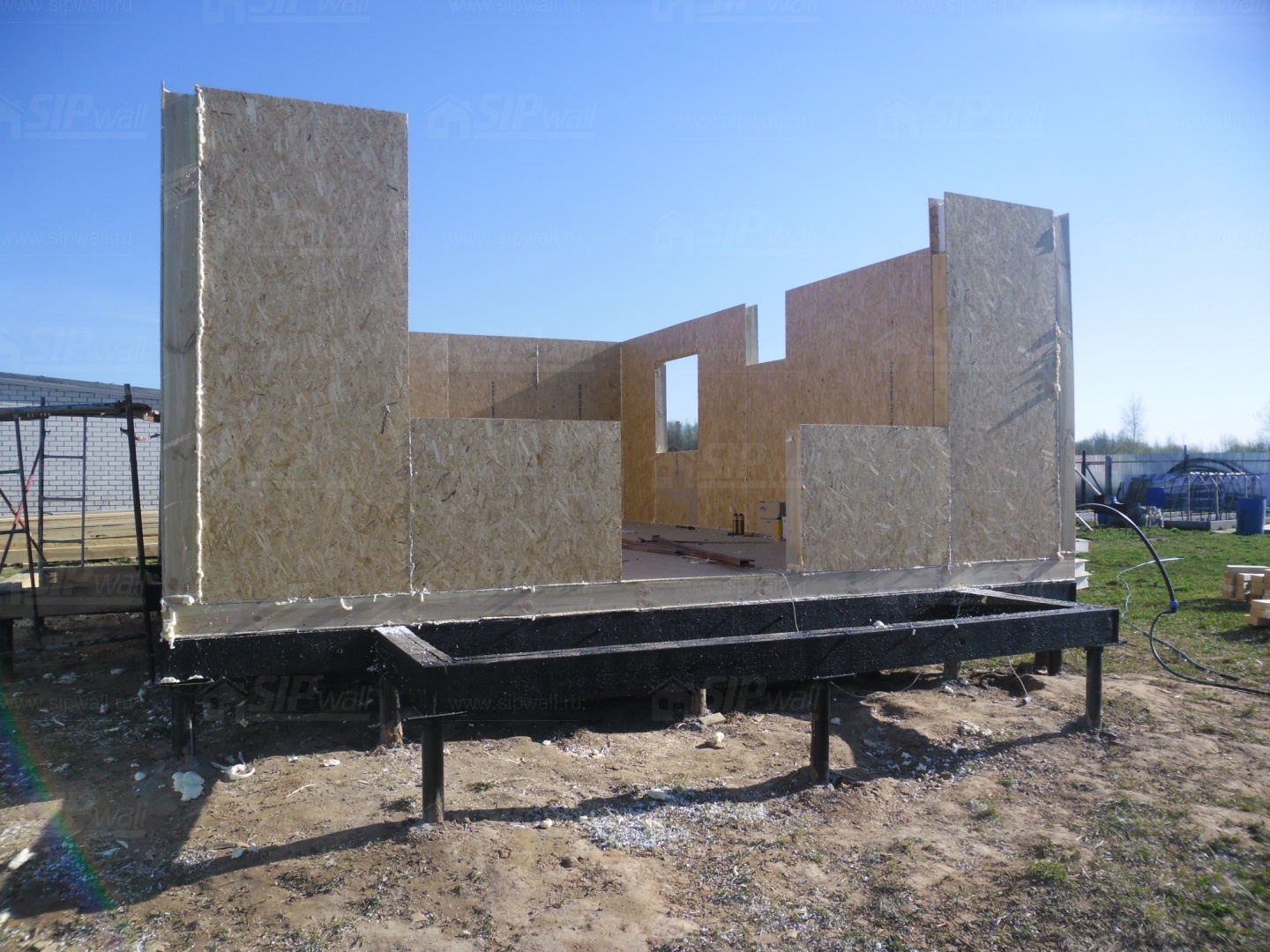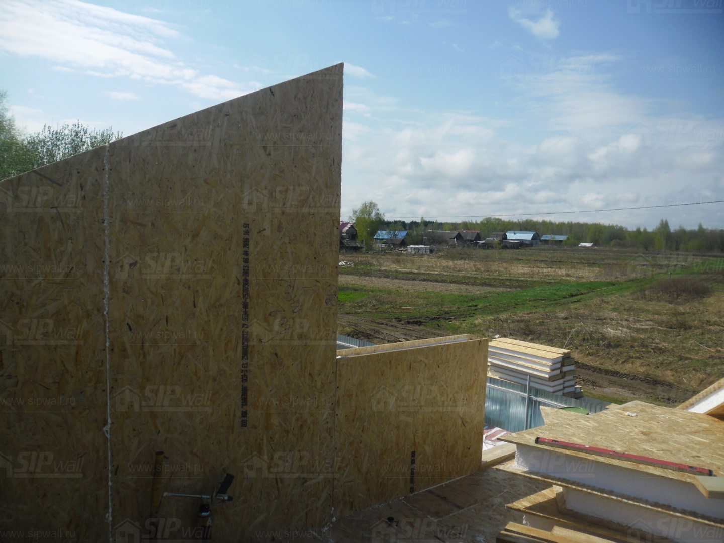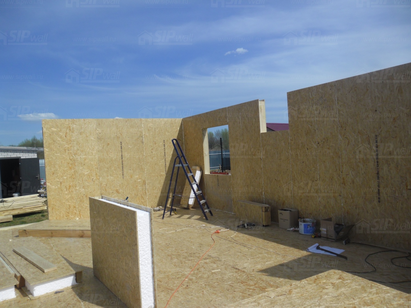 Все СИП панели SIPwall толщиной 224/174/124 мм (плиты OSB-3 толщиной 12 мм "Калевала" Россия и фасадный пенополистирол ПСБ-С 25 по ГОСТ 15588-14 толщиной 200/150/100 мм производства завода "PolarPlast", Россия) нарезаны и обрусованы сухим строганным брусом в соответствии с проектной документацией.