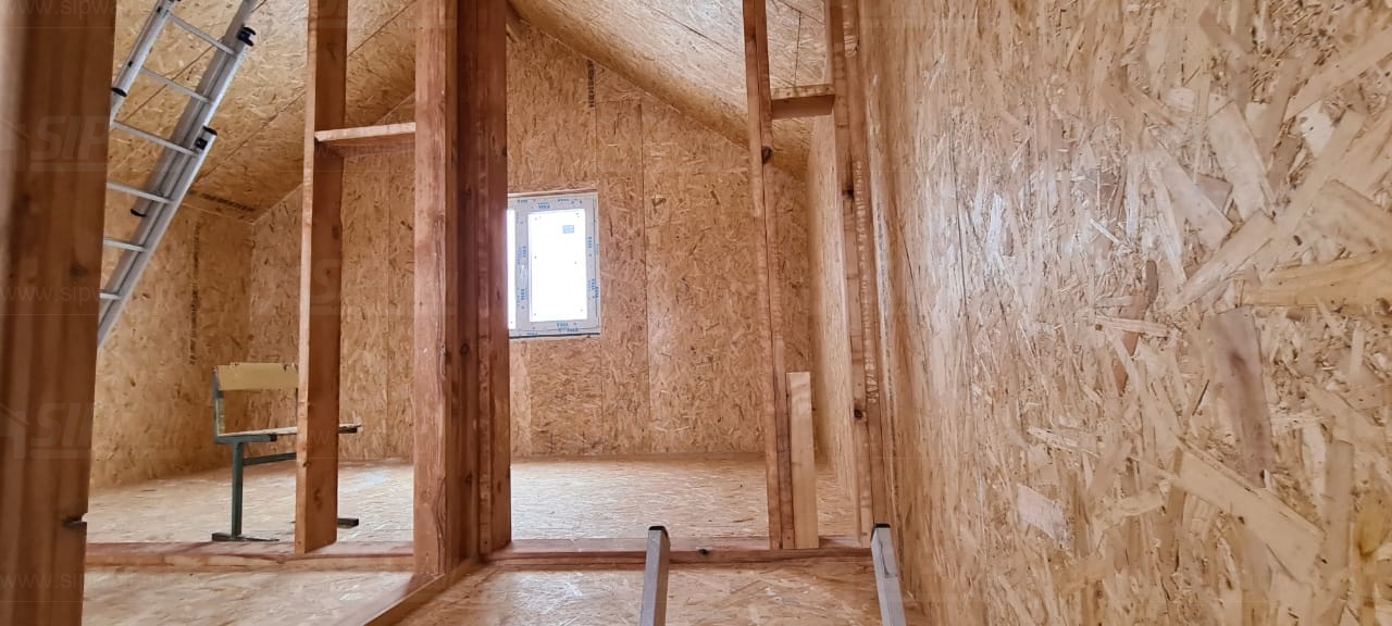 Все СИП панели SIPwall толщиной 224/174/124 мм (плиты OSB-3 толщиной 12 мм "Калевала" Россия и фасадный пенополистирол ППС-14 толщиной 200/150/100 мм производства, Россия) нарезаны и обрусованы сухим строганным брусом камерной сушки в соответствии с проектной документацией.