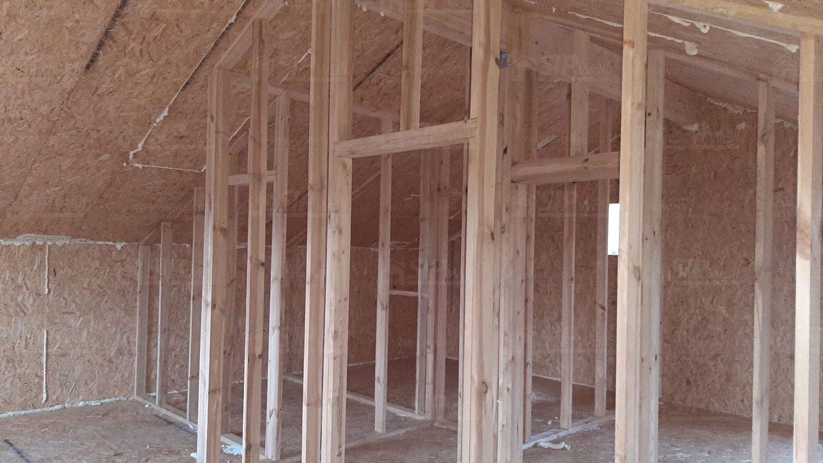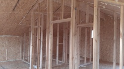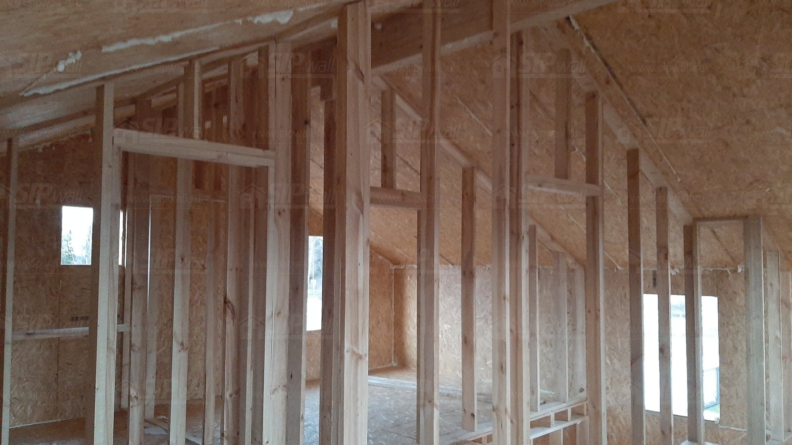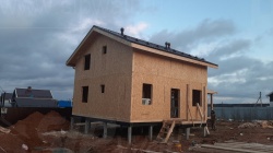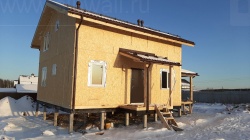 Комплектация домокомплекта: перекрытие на отметке +0.000 - СИП - 174У мм., несущие стены дома выполнены из СИП панелей 174 мм., внутренние несущие стены и внутренние не несущие перегородки выполнены по каркасной технологии. Межэтажное перекрытие - лаги с настилом ОСБ 22 мм, Кровля - СИП - 174У мм.