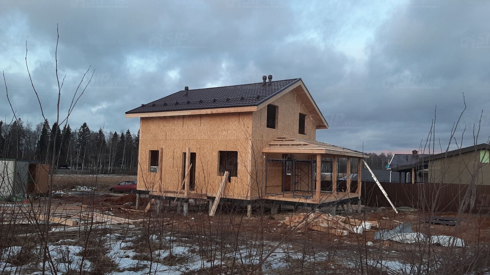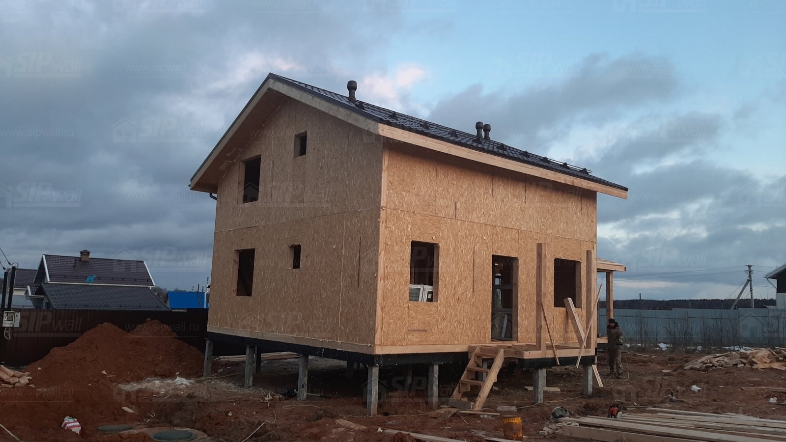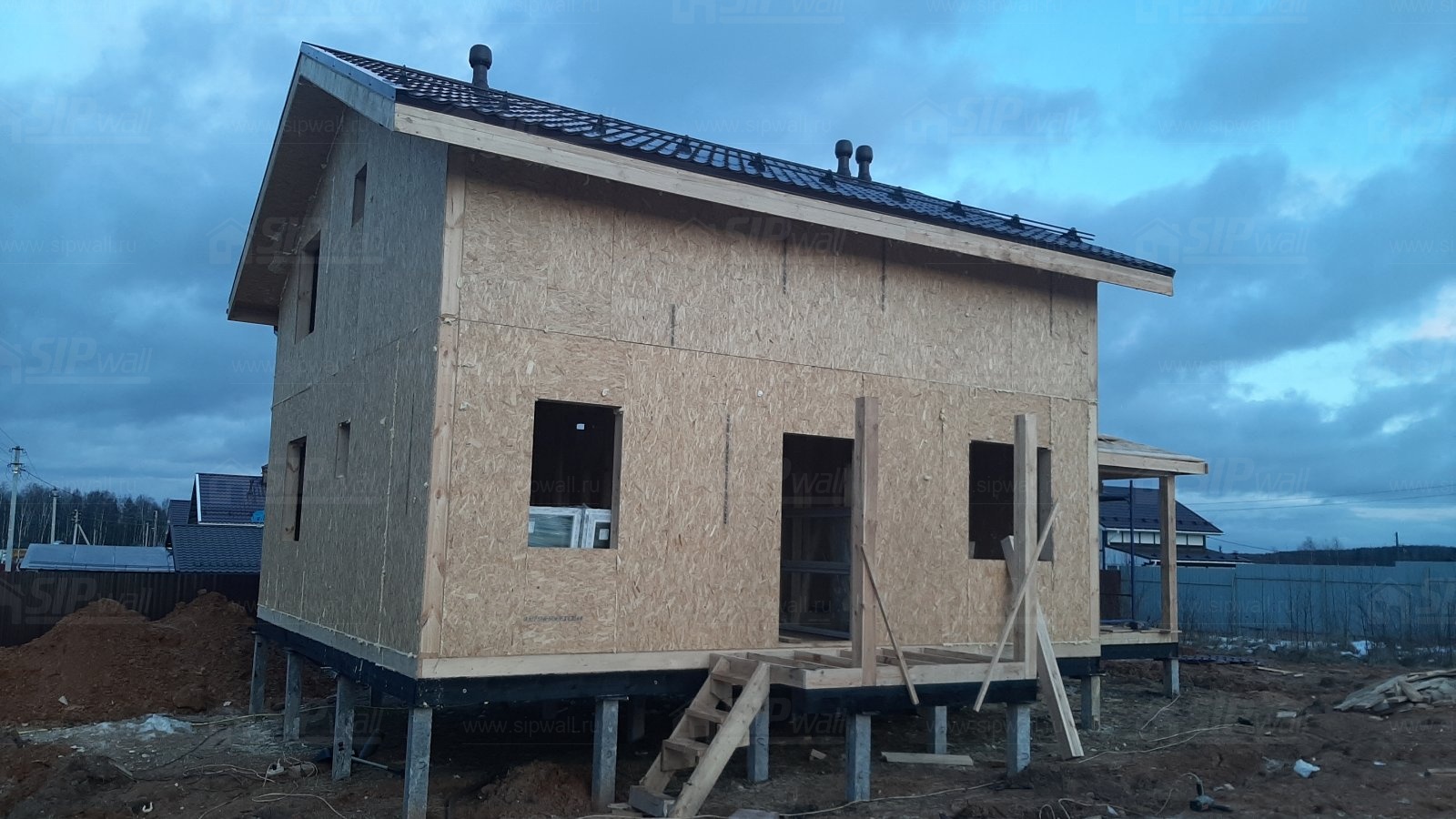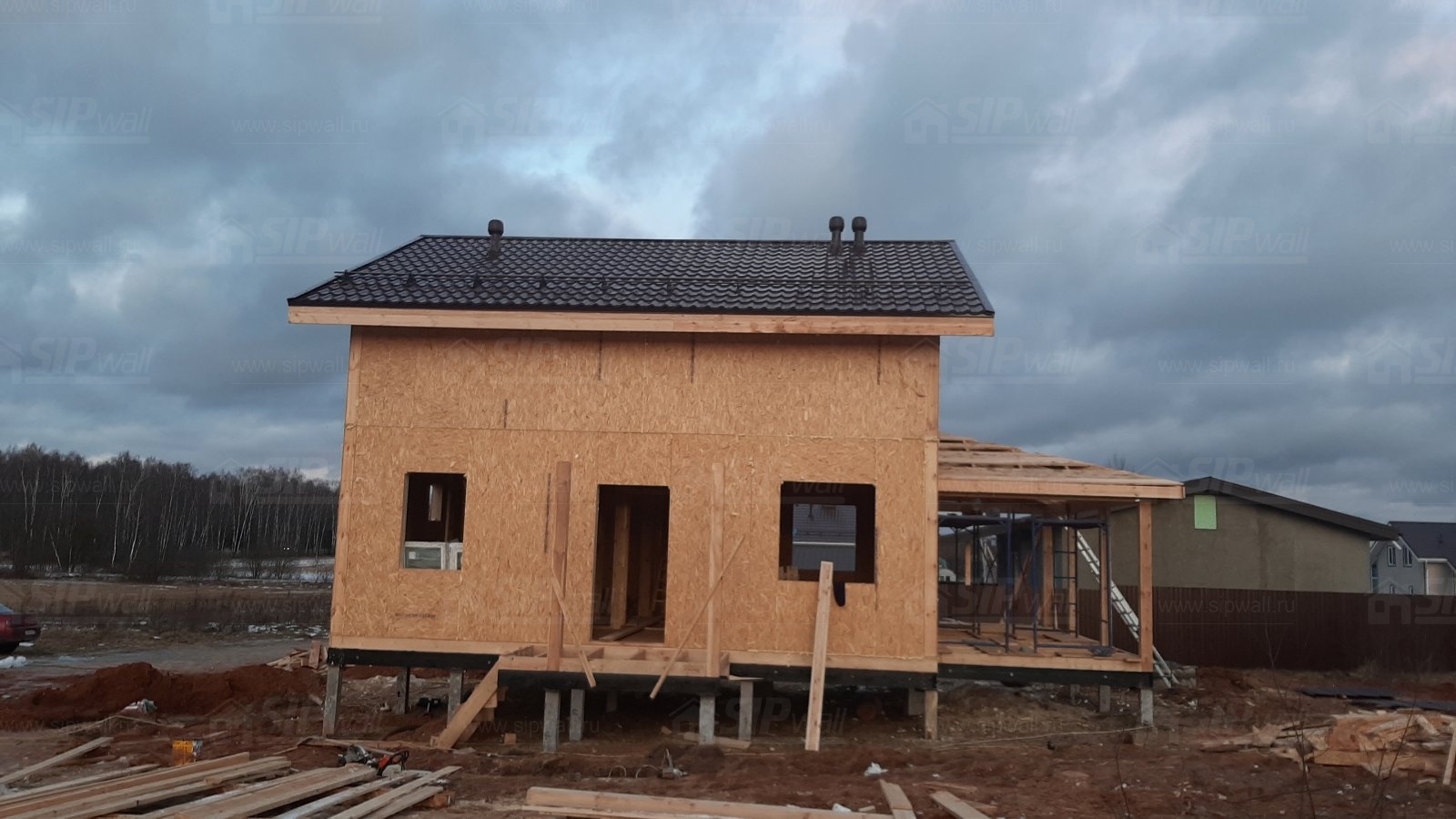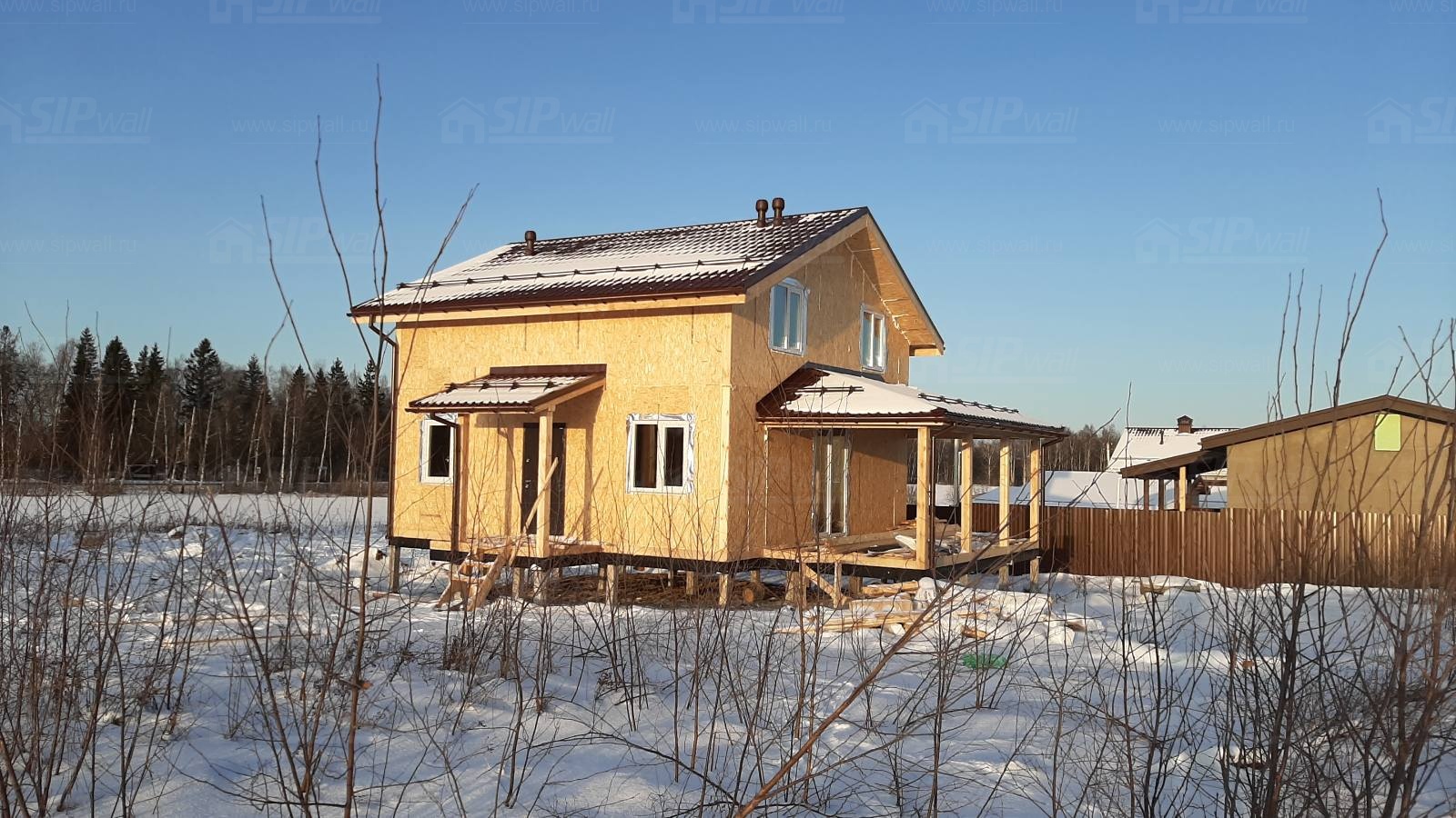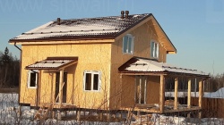 Домокомплект - изготовлен по проекту из СИП панелей произведенный по технологии SIPwall (ЭКОПАН) на собственном заводе расположенном в г. Шуя, Ивановской области. При изготовлении домокомплекта панельно каркасного дома используется только сухой строганный брус камерной сушки, обработанный огнебиозащитным составом.