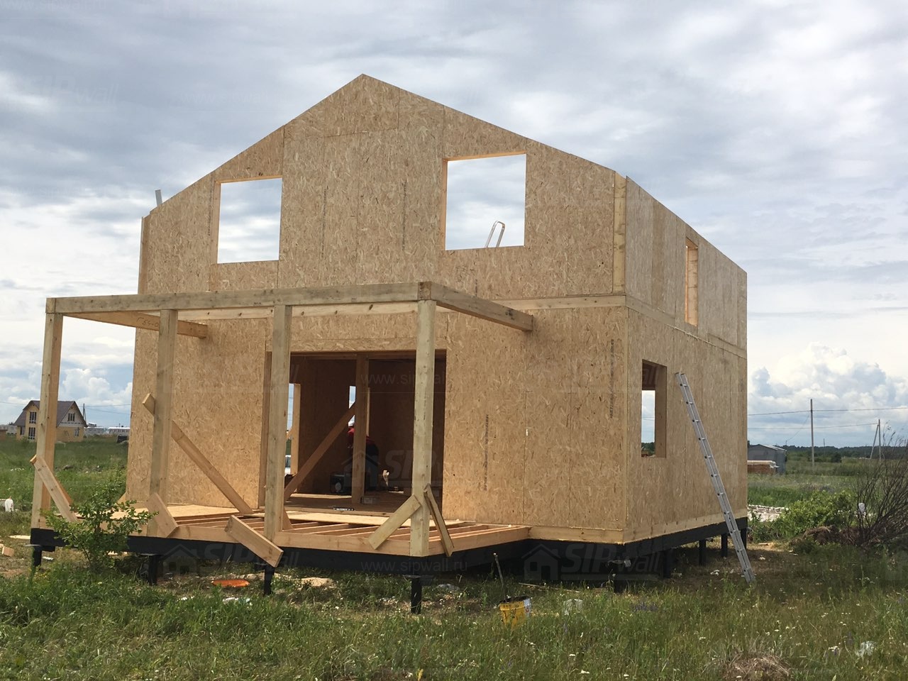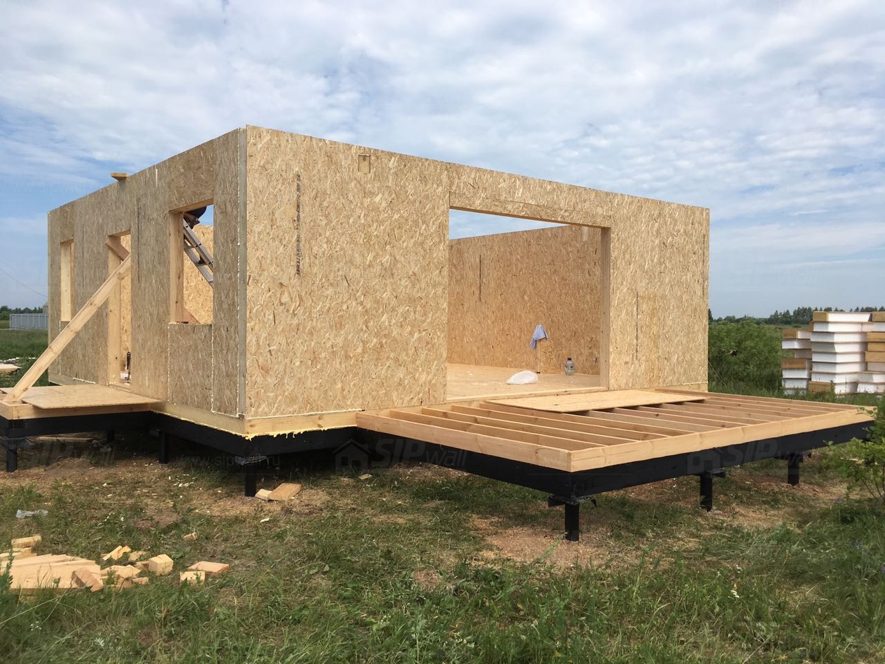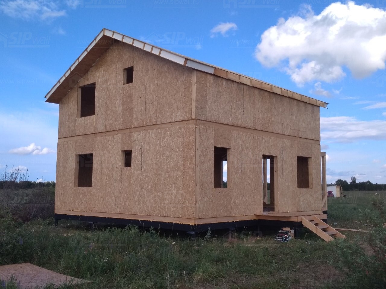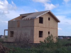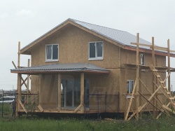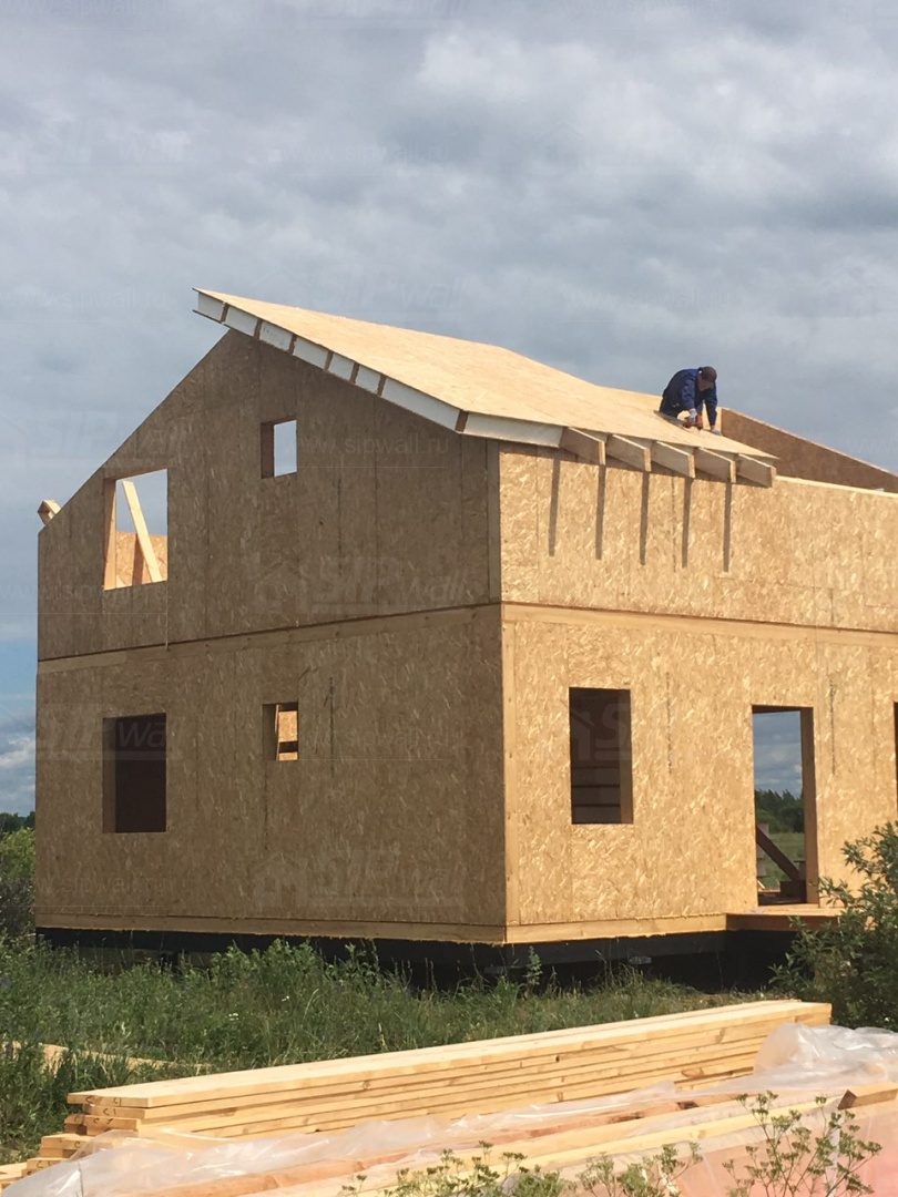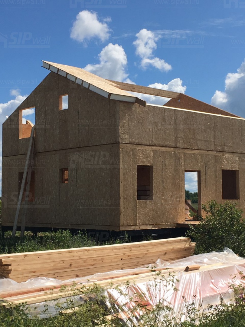Комплектация домокомплекта: перекрытие на отметке +0.000 - СИП - 224У мм., несущие стены дома выполнены из СИП панелей 174 мм., внутренние несущие стены выполнены по каркасной технологии. Межэтажное перекрытие - лаги с тастилом ОСБ 22 мм. Кровля - выполнена из СИП панелей 224 У мм.