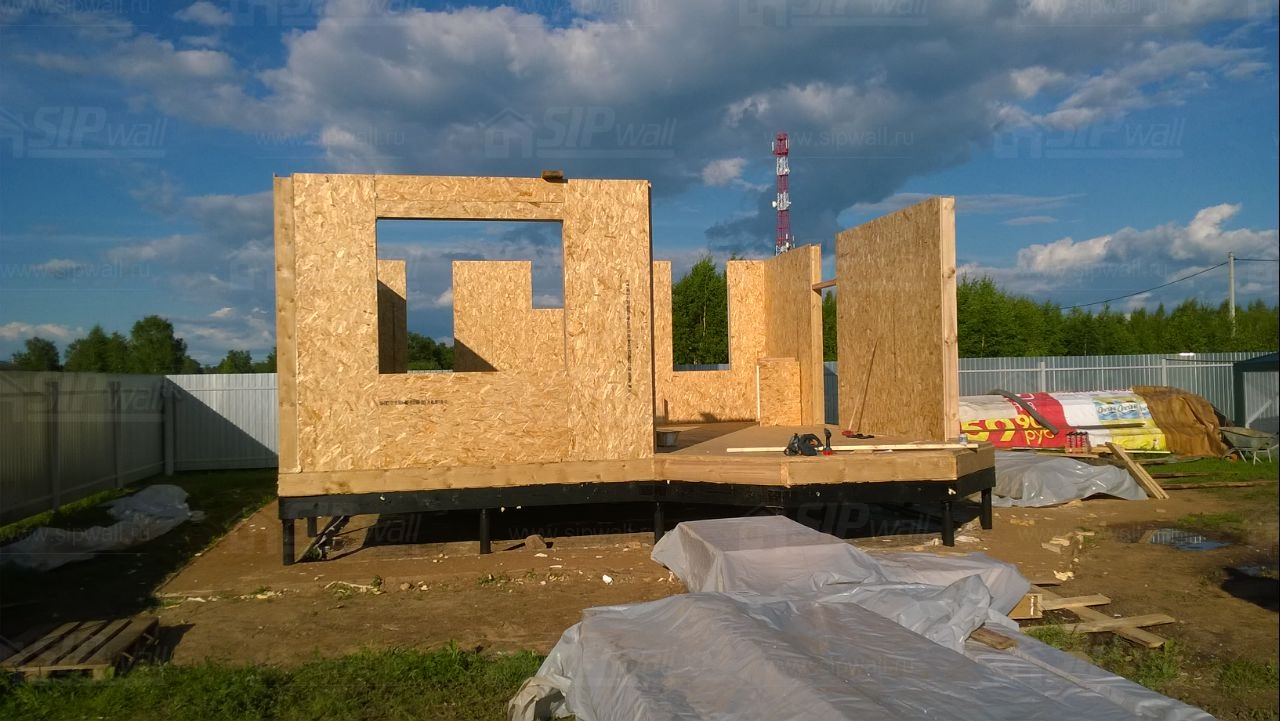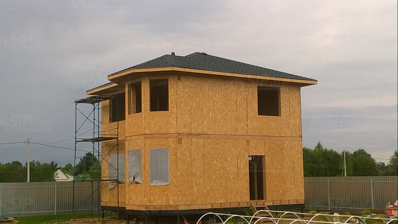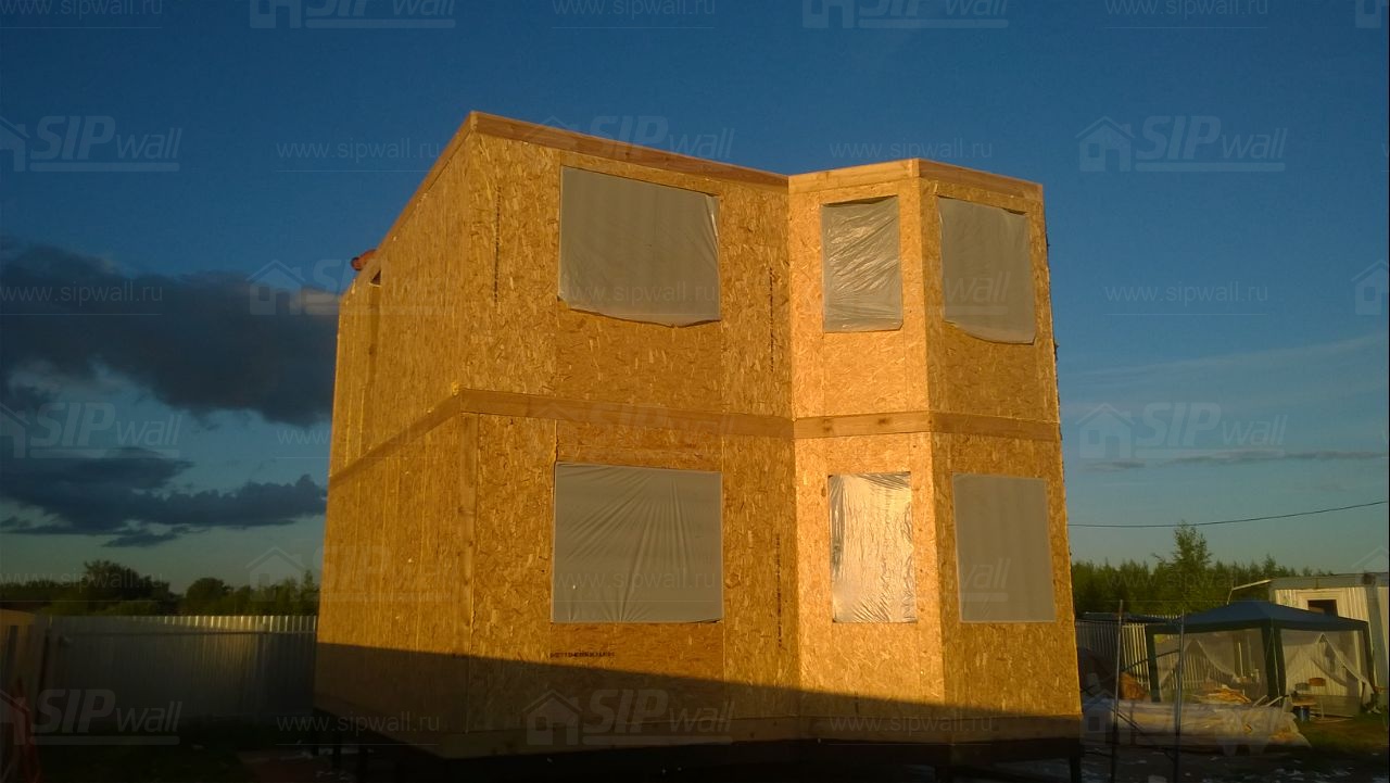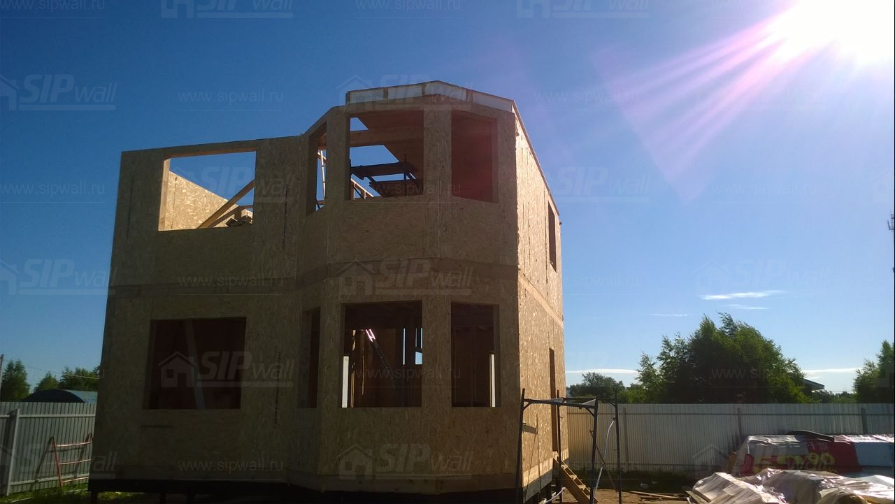 Комплектация домокомплекта: нулевое перекрытие - выполнены из СИП панелей 174У мм, несущие стены дома выполнены из СИП панелей 174 мм., внутренние несущие и внутренние не несущие перегородки выполнены по каркасной технологии. Перекрытие межэтажное - выполнены по лагам + ОСБ 22 мм. Кровля - стропильная система производства компании СИПВОЛЛ.