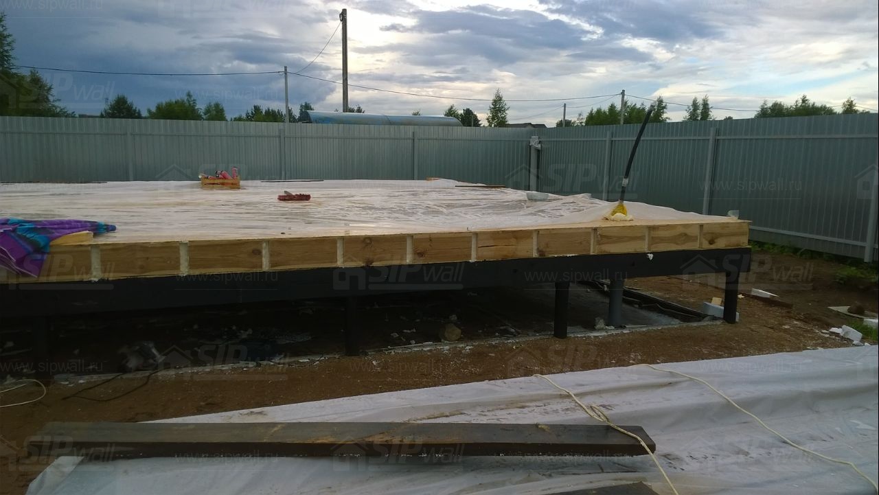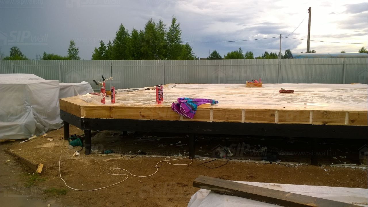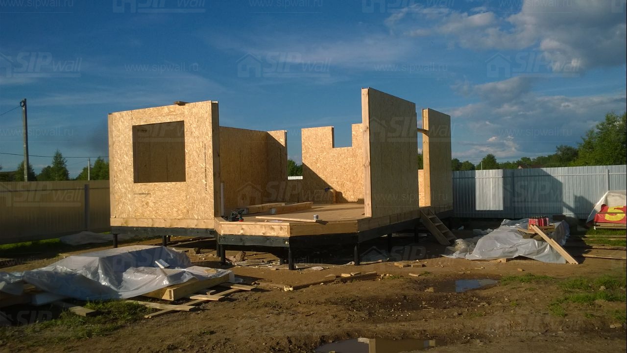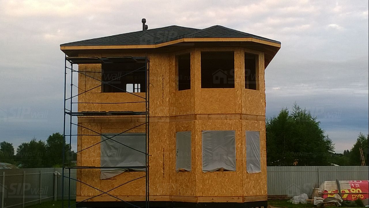 Комплектация домокомплекта: нулевое перекрытие - выполнены из СИП панелей 174У мм, несущие стены дома выполнены из СИП панелей 174 мм., внутренние несущие и внутренние не несущие перегородки выполнены по каркасной технологии. Перекрытие межэтажное - выполнены по лагам + ОСБ 22 мм. Кровля - стропильная система производства компании СИПВОЛЛ.