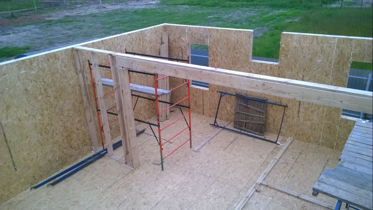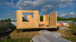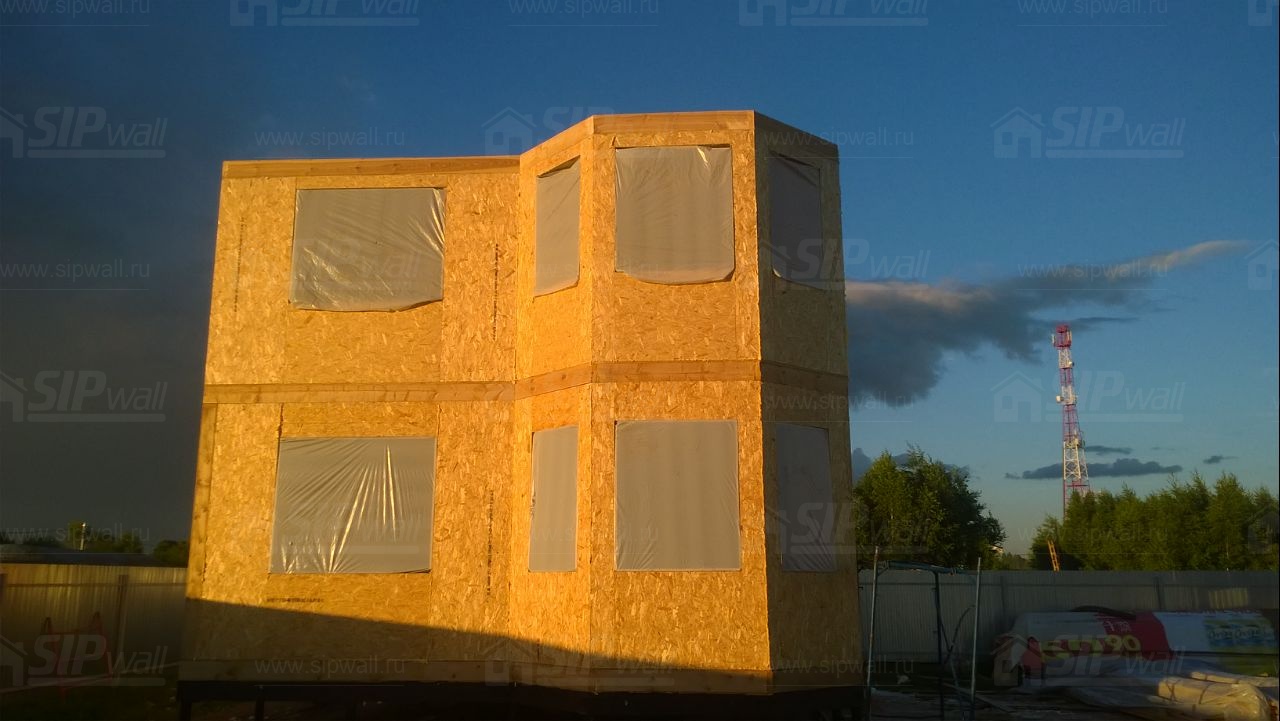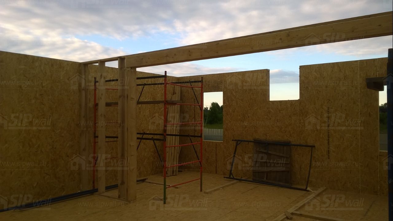 Все СИП панели SIPwall толщиной 224/174/124 мм (плиты OSB-3 толщиной 12 мм "Калевала" Россия и фасадный пенополистирол ПСБ-С 25 по ГОСТ 15588-14 толщиной 200/150/100 мм производства завода "PolarPlast", Россия) нарезаны и обрусованы сухим строганным брусом в соответствии с проектной документацией.