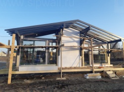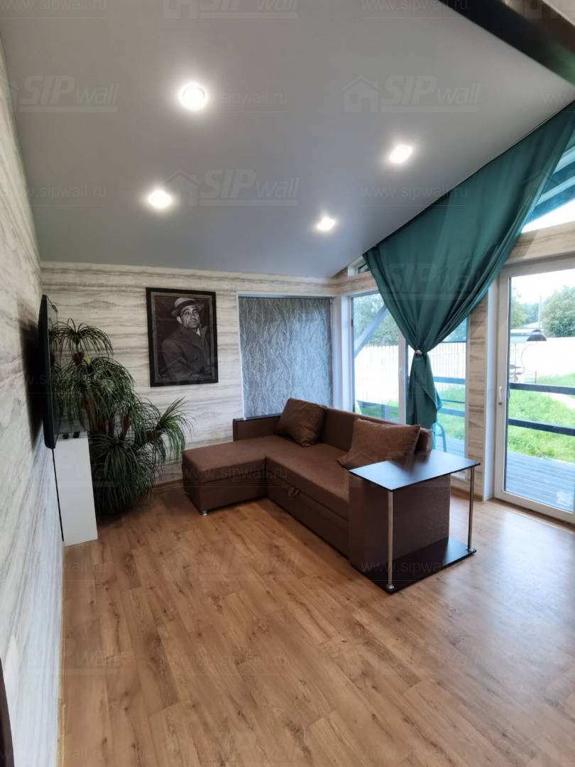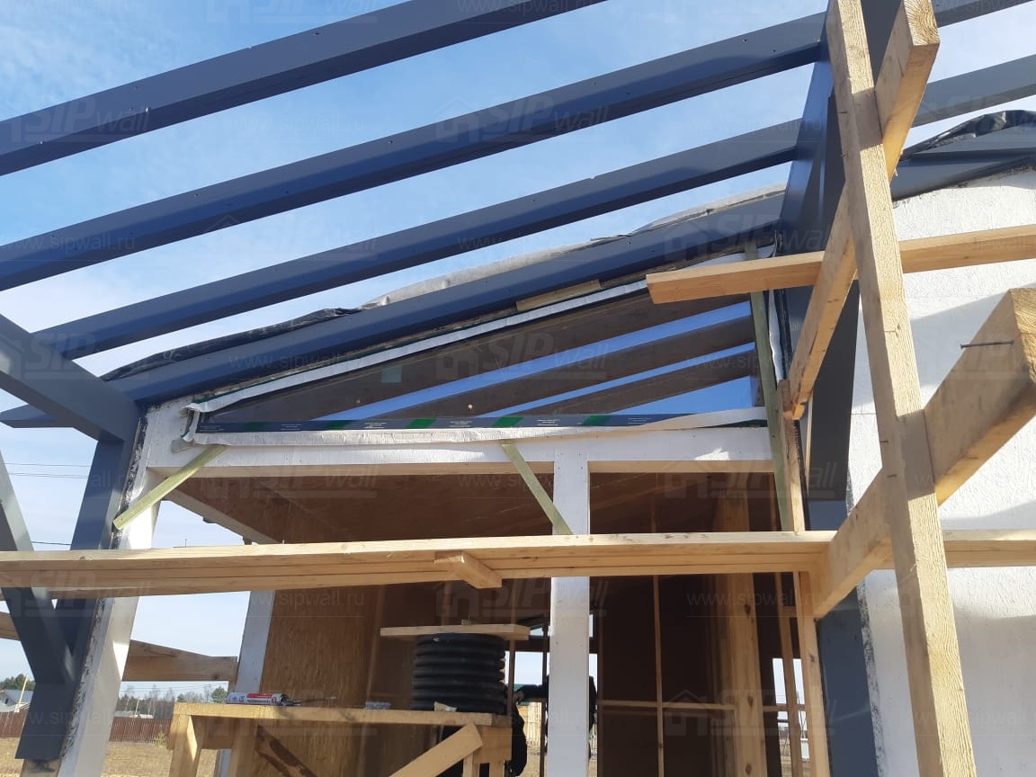 Комплектация домокомплекта: перекрытие на отметке +0.000 - СИП - 174У мм., несущие стены дома выполнены из СИП панелей 174 мм, внутренние несущие стены и не несущие стены выполнены по каркасной технологии. Кровля - СИП - 174У мм.