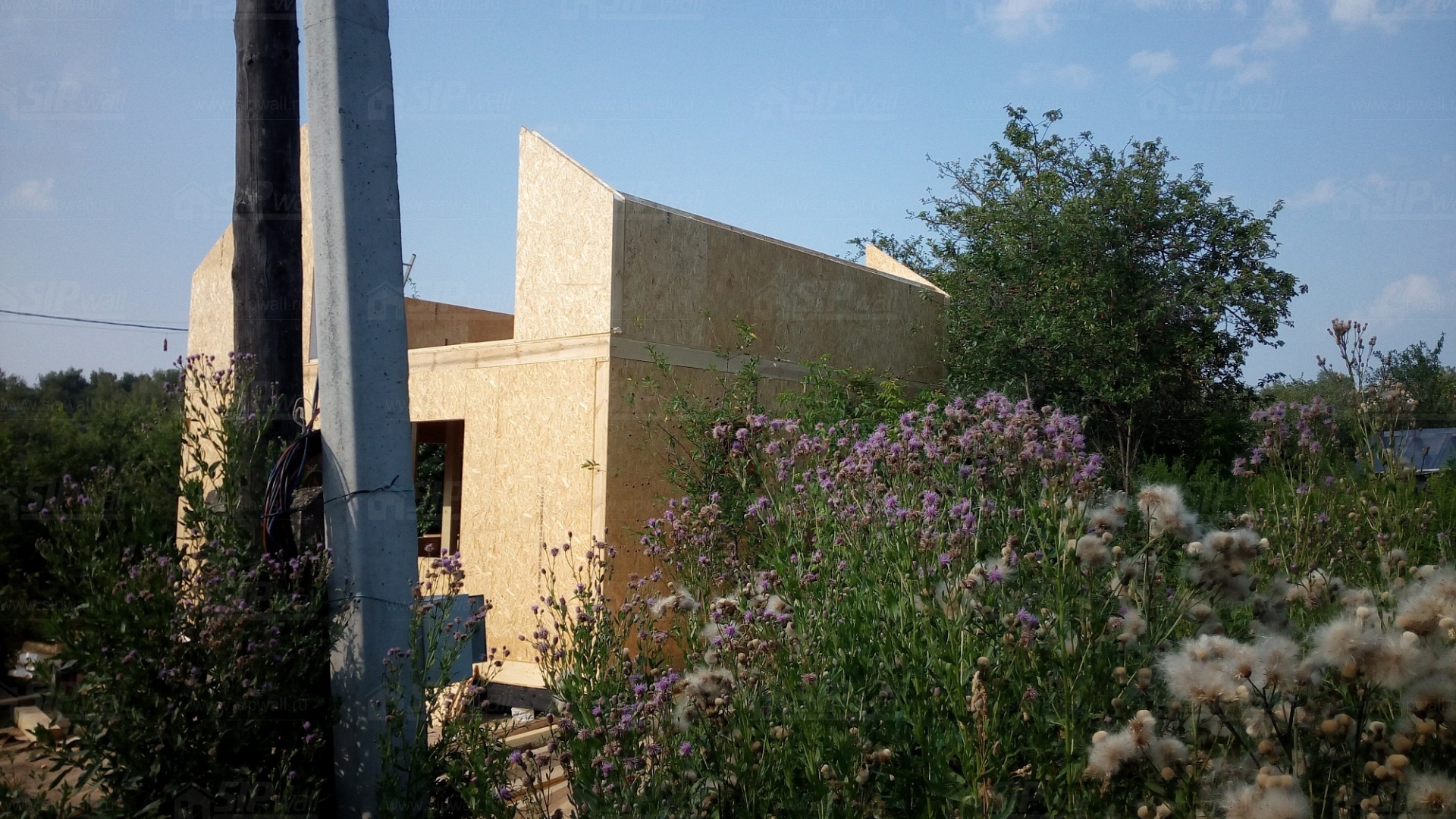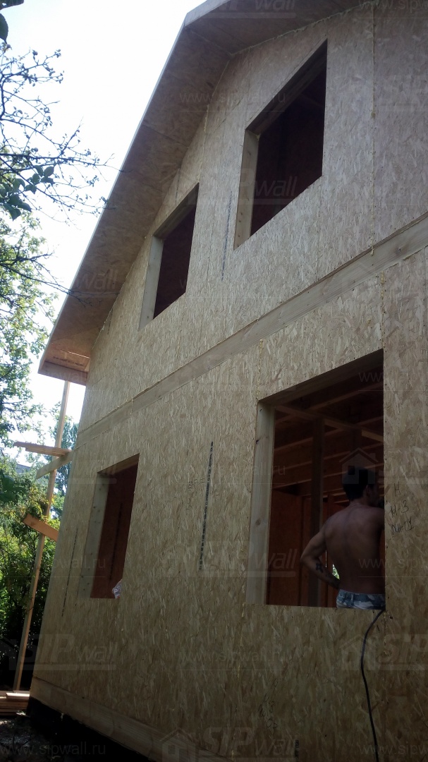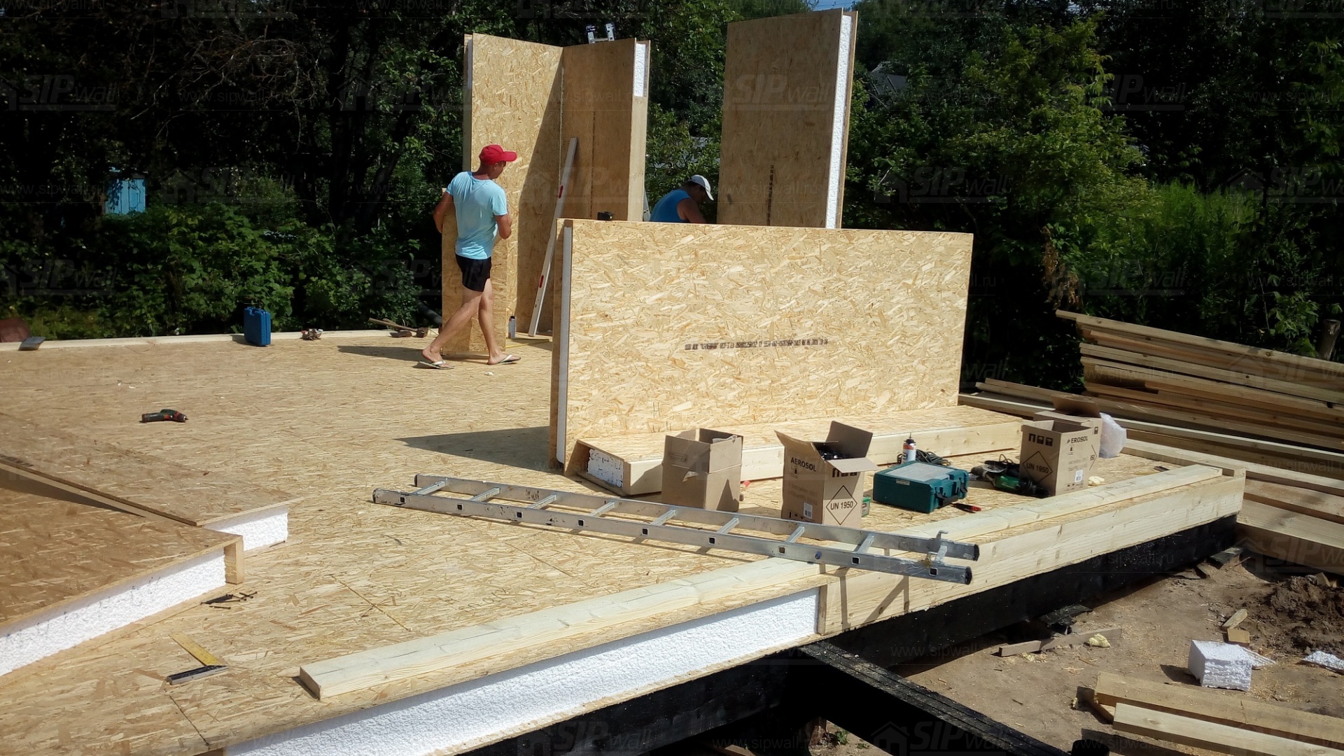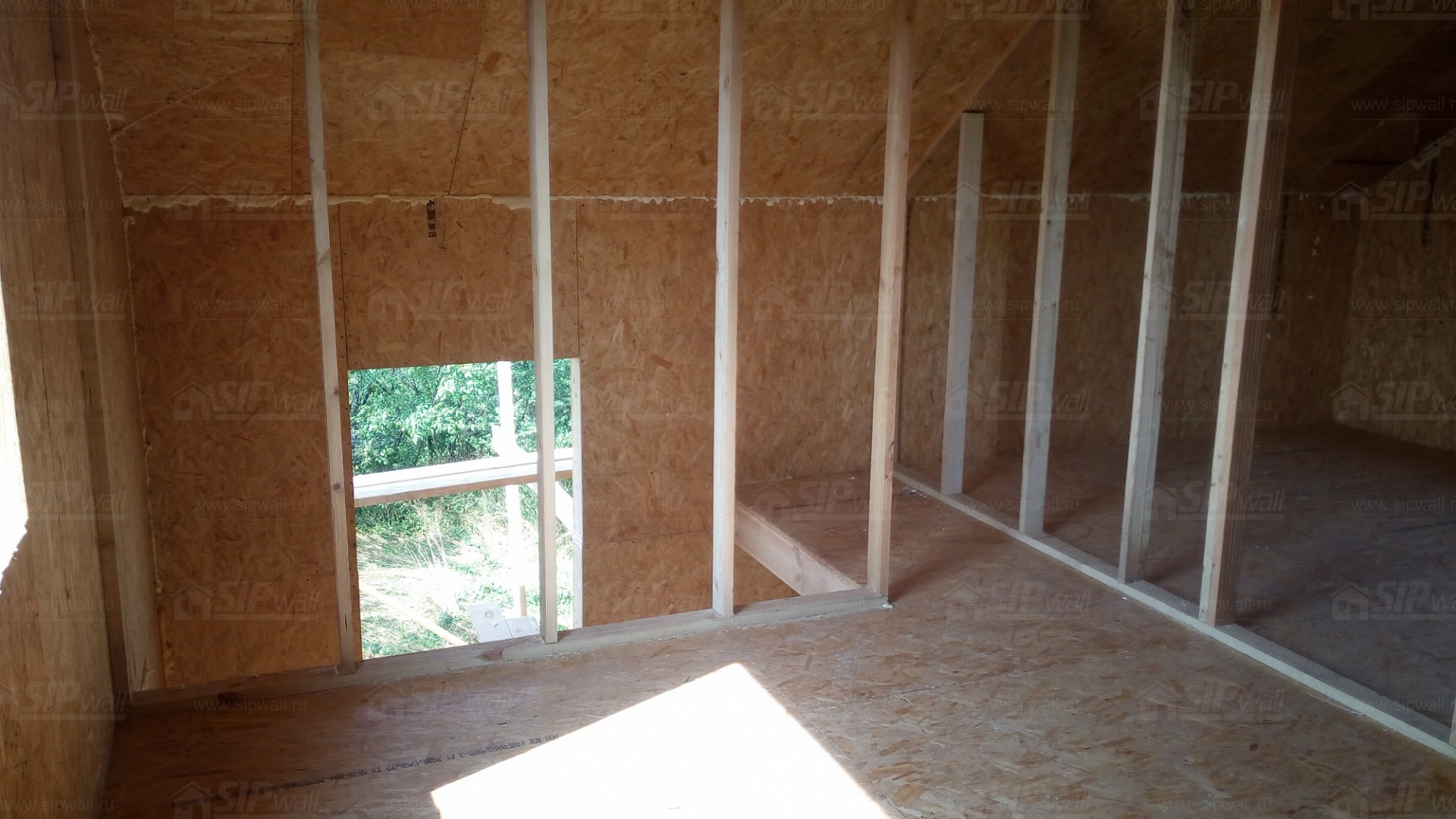 Все СИП панели SIPwall толщиной 224/174/124 мм (плиты OSB-3 толщиной 12 мм "Калевала" Россия и фасадный пенополистирол ПСБ-С 25 по ГОСТ 15588-14 толщиной 200/150/100 мм производства завода "PolarPlast", Россия) нарезаны и обрусованы сухим строганным брусом в соответствии с проектной документацией.
