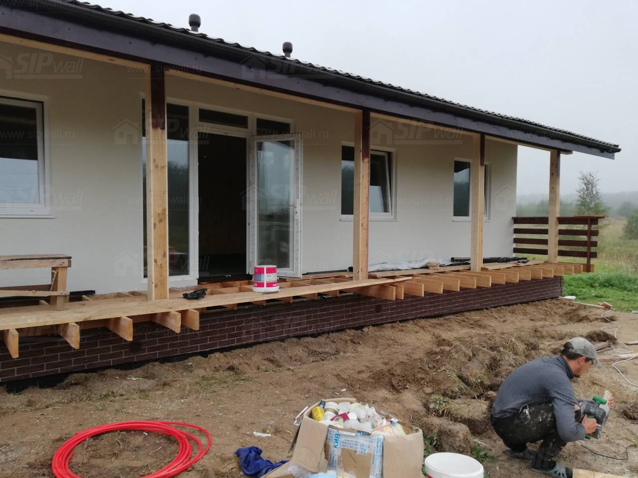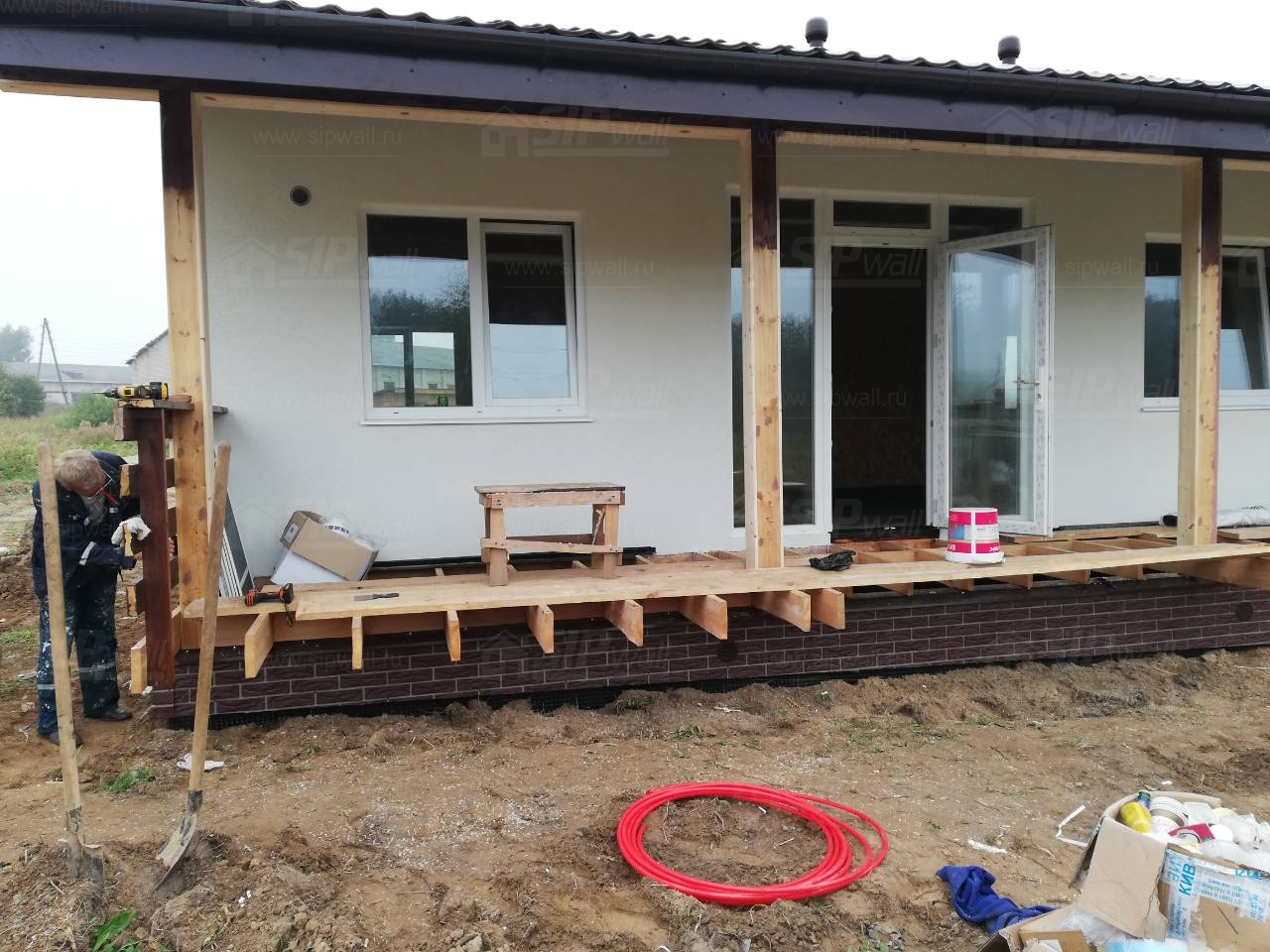 Домокомплект - изготовлен по проекту из СИП панелей произведенный по технологии SIPwall (ЭКОПАН) на собственном заводе расположенном в г. Шуя, Ивановской области. При изготовлении домокомплекта панельно каркасного дома используется только сухой строганный брус камерной сушки, обработанный огнебиозащитным составом.
