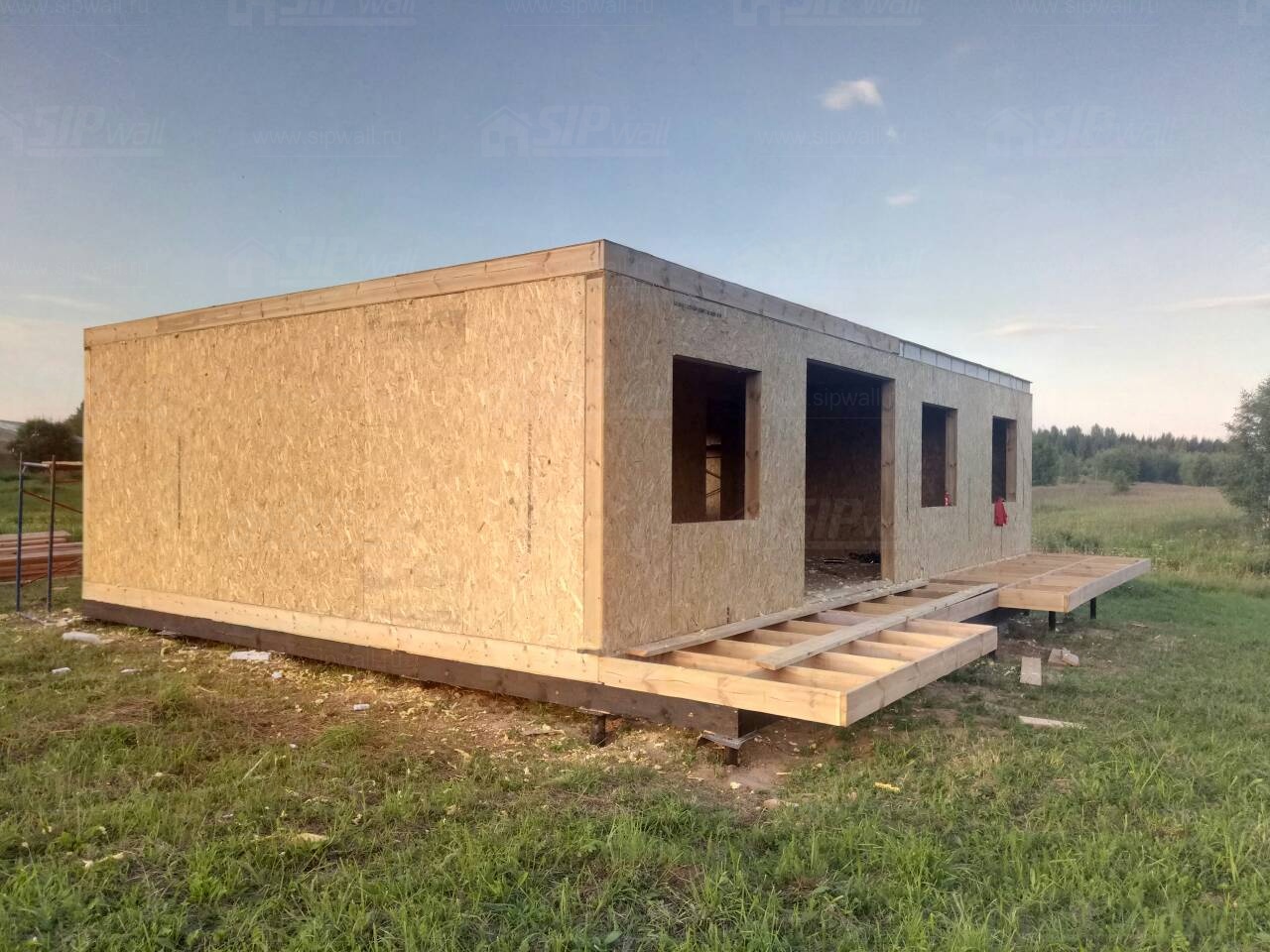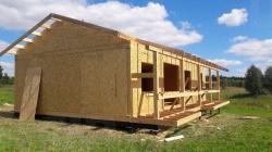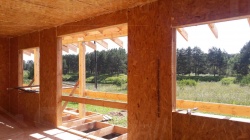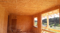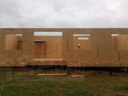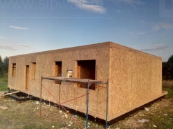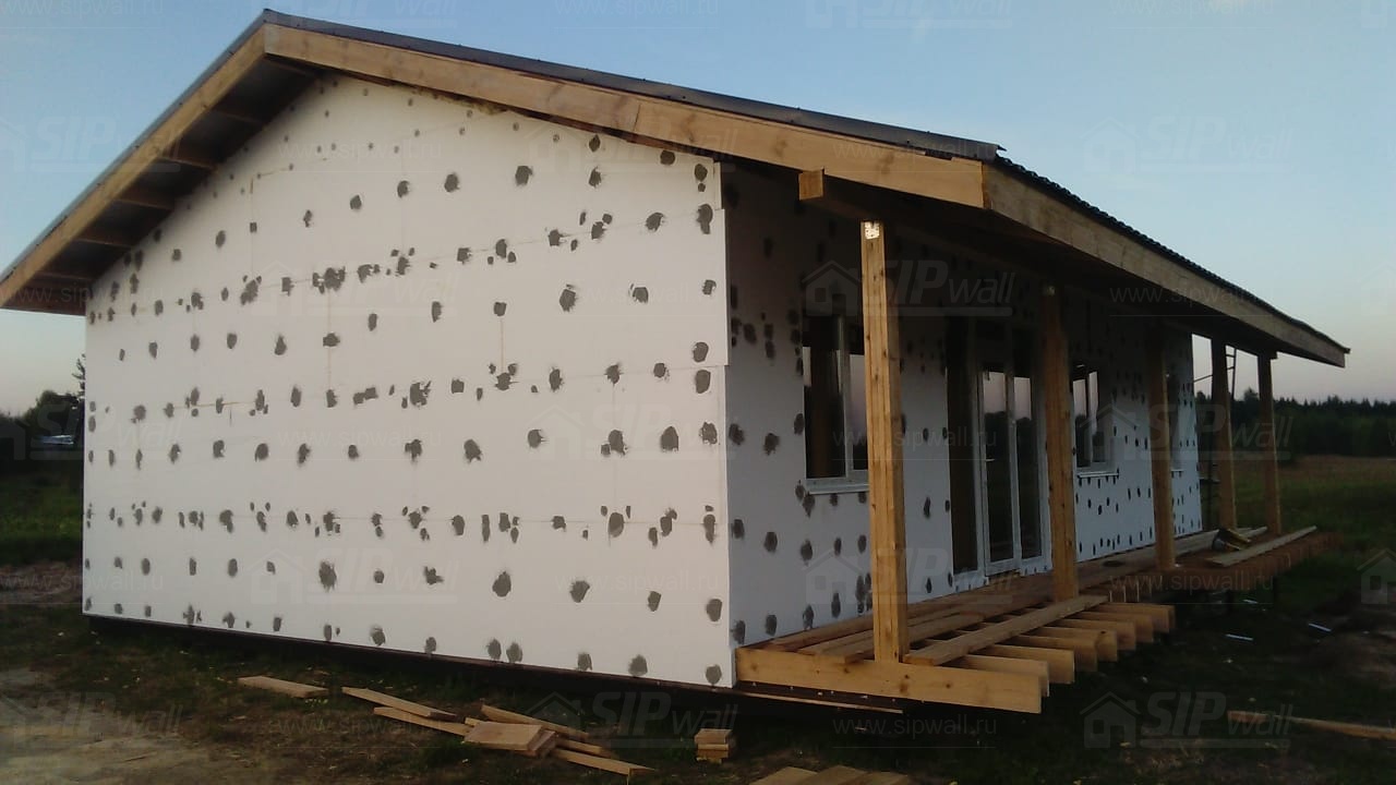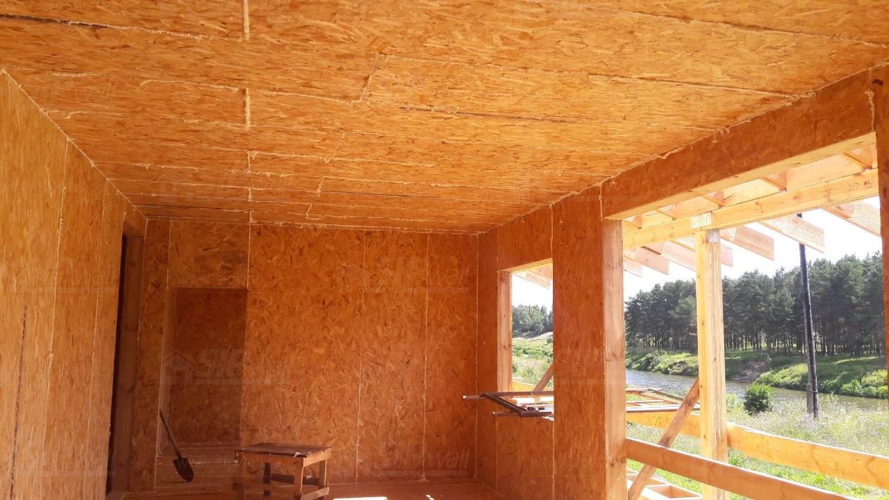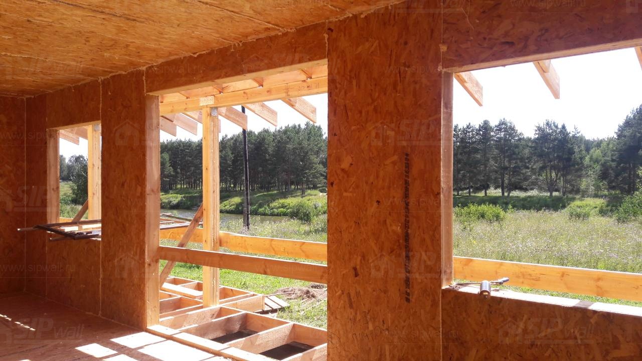 Все СИП панели SIPwall толщиной 224/174/124 мм (плиты OSB-3 толщиной 12 мм "Калевала" Россия и фасадный пенополистирол ПСБ-С 25 по ГОСТ 15588-14 толщиной 200/150/100 мм производства завода "PolarPlast", Россия) нарезаны и обрусованы сухим строганным брусом камерной сушки в соответствии с проектной документацией.
