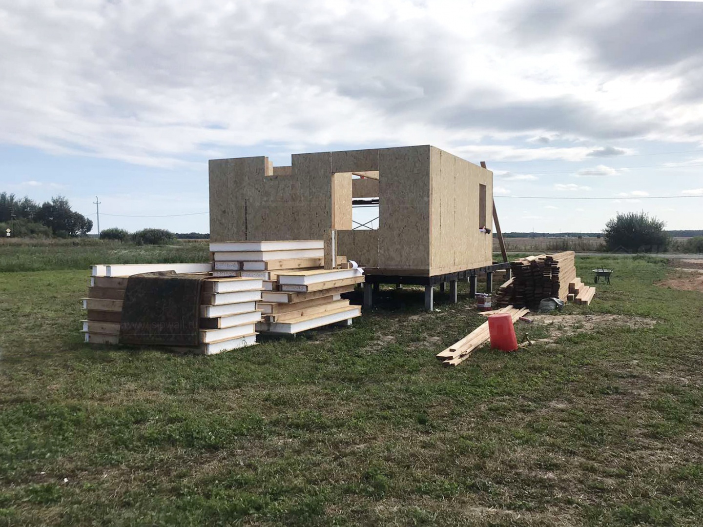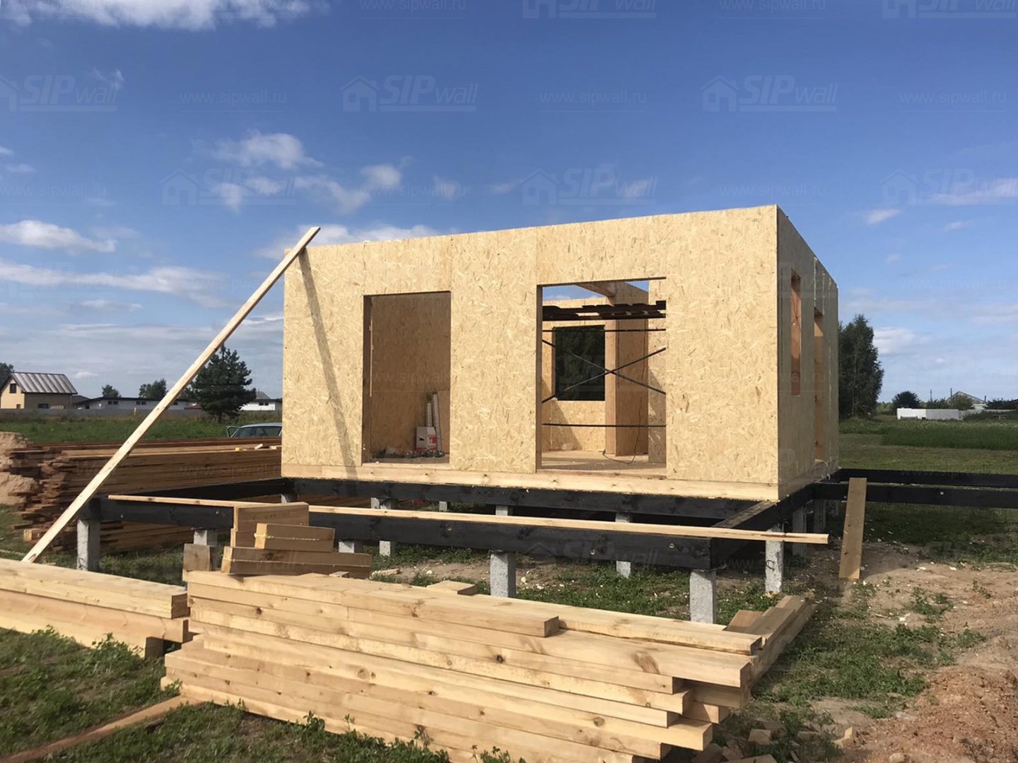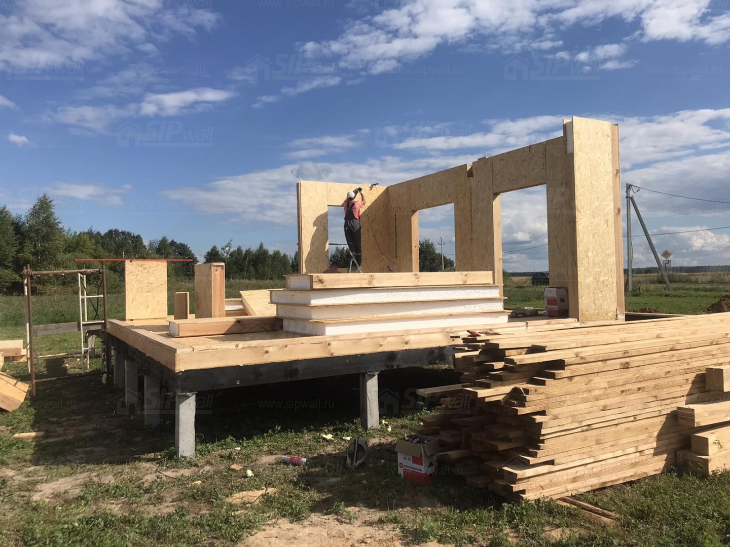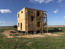 Все СИП панели SIPwall толщиной 224/174/124 мм (плиты OSB-3 толщиной 12 мм "Калевала" Россия и фасадный пенополистирол ПСБ-С 25 по ГОСТ 15588-14 толщиной 200/150/100 мм производства завода "PolarPlast", Россия) нарезаны и обрусованы сухим строганным брусом камерной сушки в соответствии с проектной документацией.