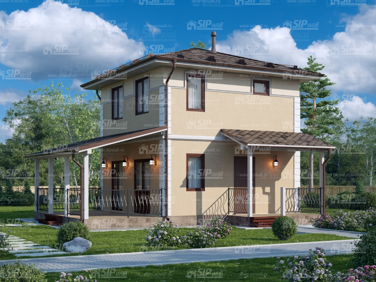 Домокомплект - изготовлен по проекту из СИП панелей произведенный по технологии SIPwall (ЭКОПАН) на собственном заводе расположенном в г. Шуя, Ивановской области. При изготовлении домокомплекта панельно каркасного дома используется только сухой строганный брус камерной сушки, обработанный огнебиозащитным составом.
