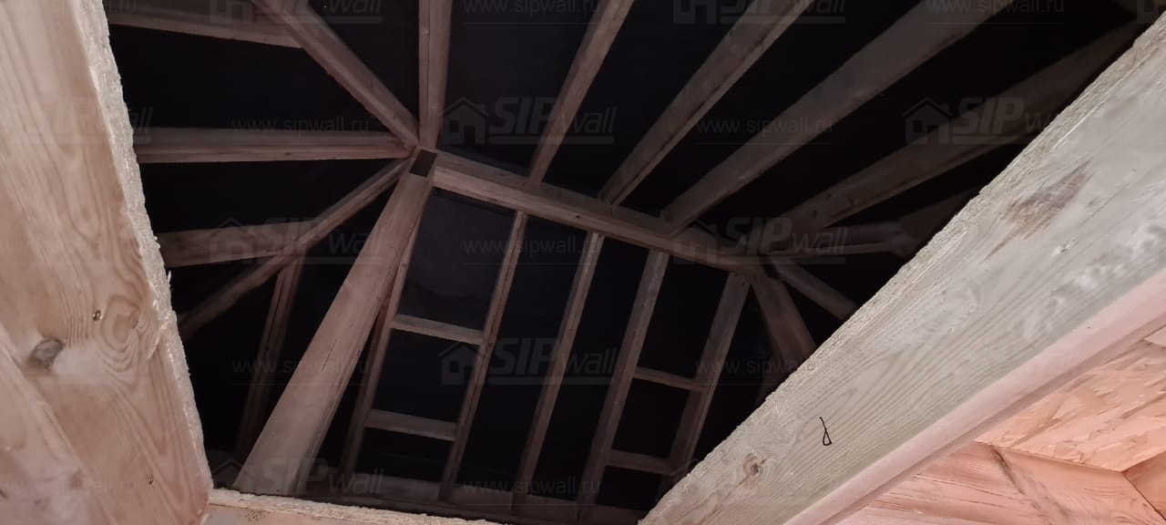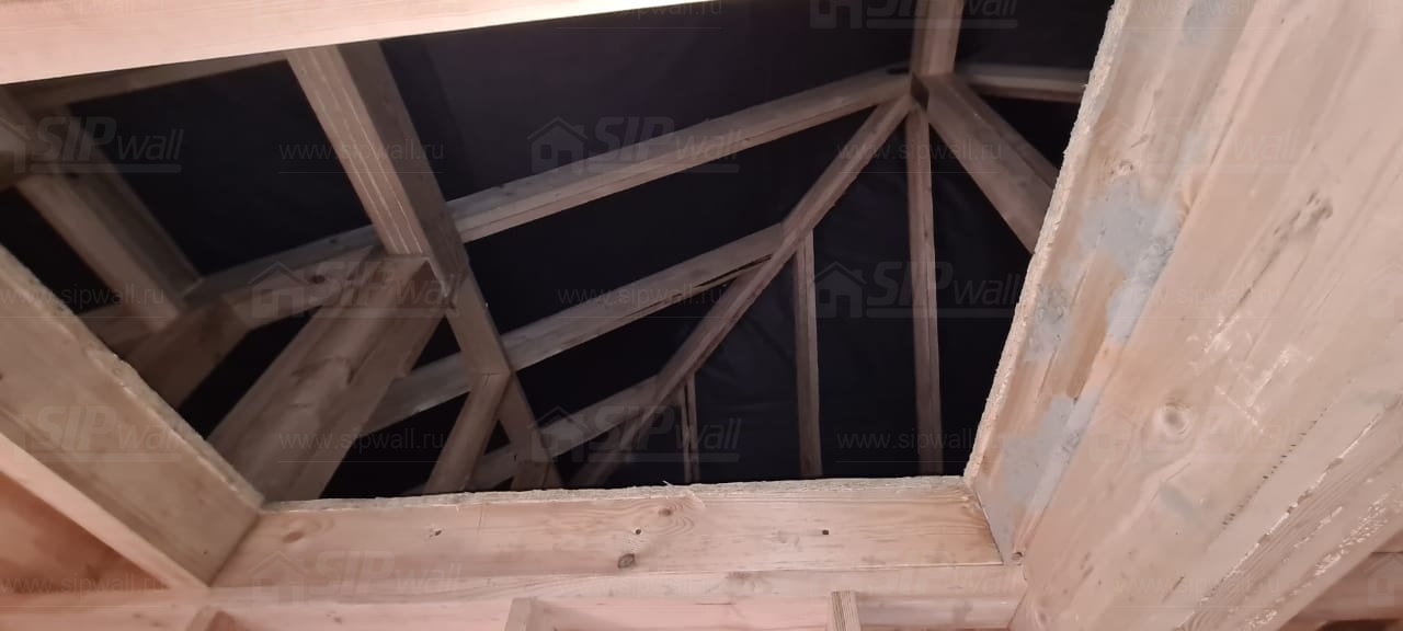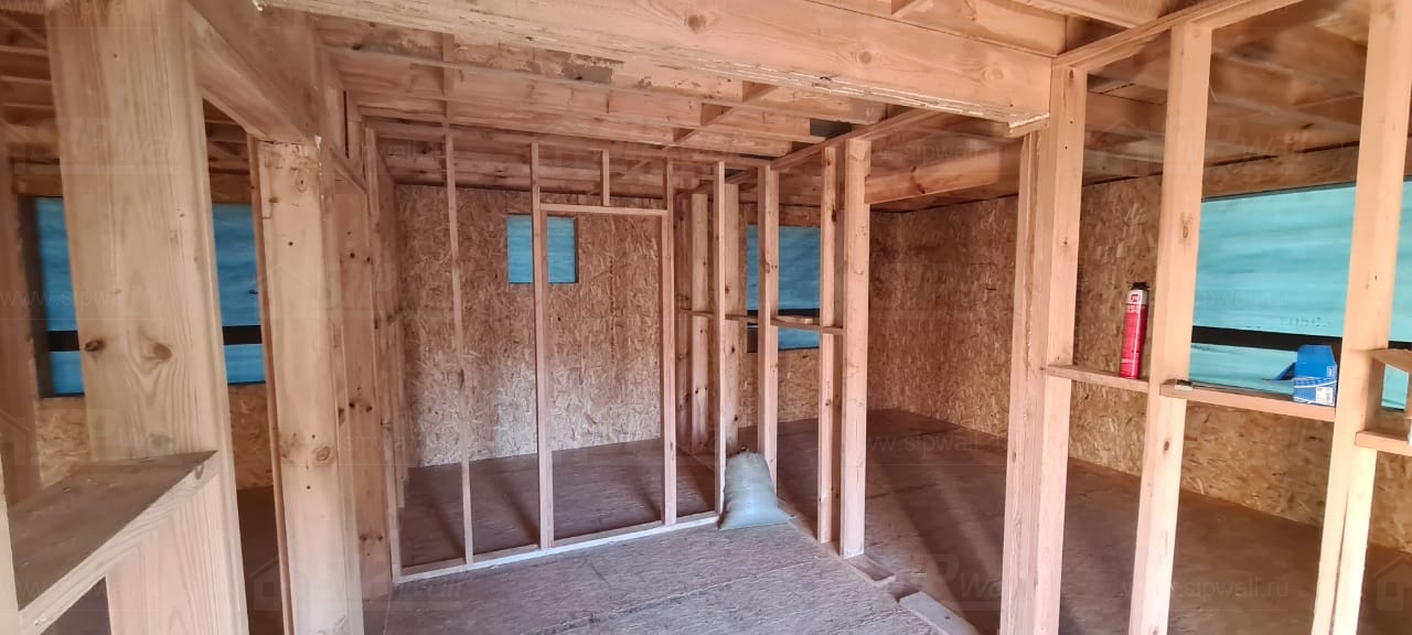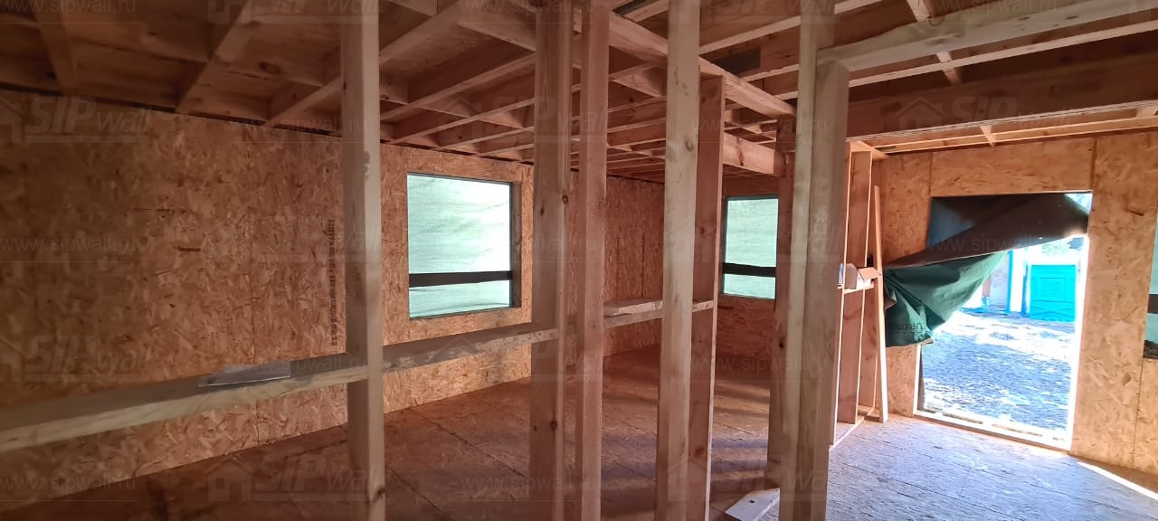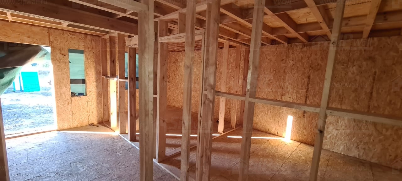 Все СИП панели SIPwall толщиной 224/174/124 мм (плиты OSB-3 толщиной 12 мм "Калевала" Россия и фасадный пенополистирол ПСБ-С 25 по ГОСТ 15588-14 толщиной 200/150/100 мм производства завода "PolarPlast", Россия) нарезаны и обрусованы сухим строганным брусом камерной сушки в соответствии с проектной документацией.