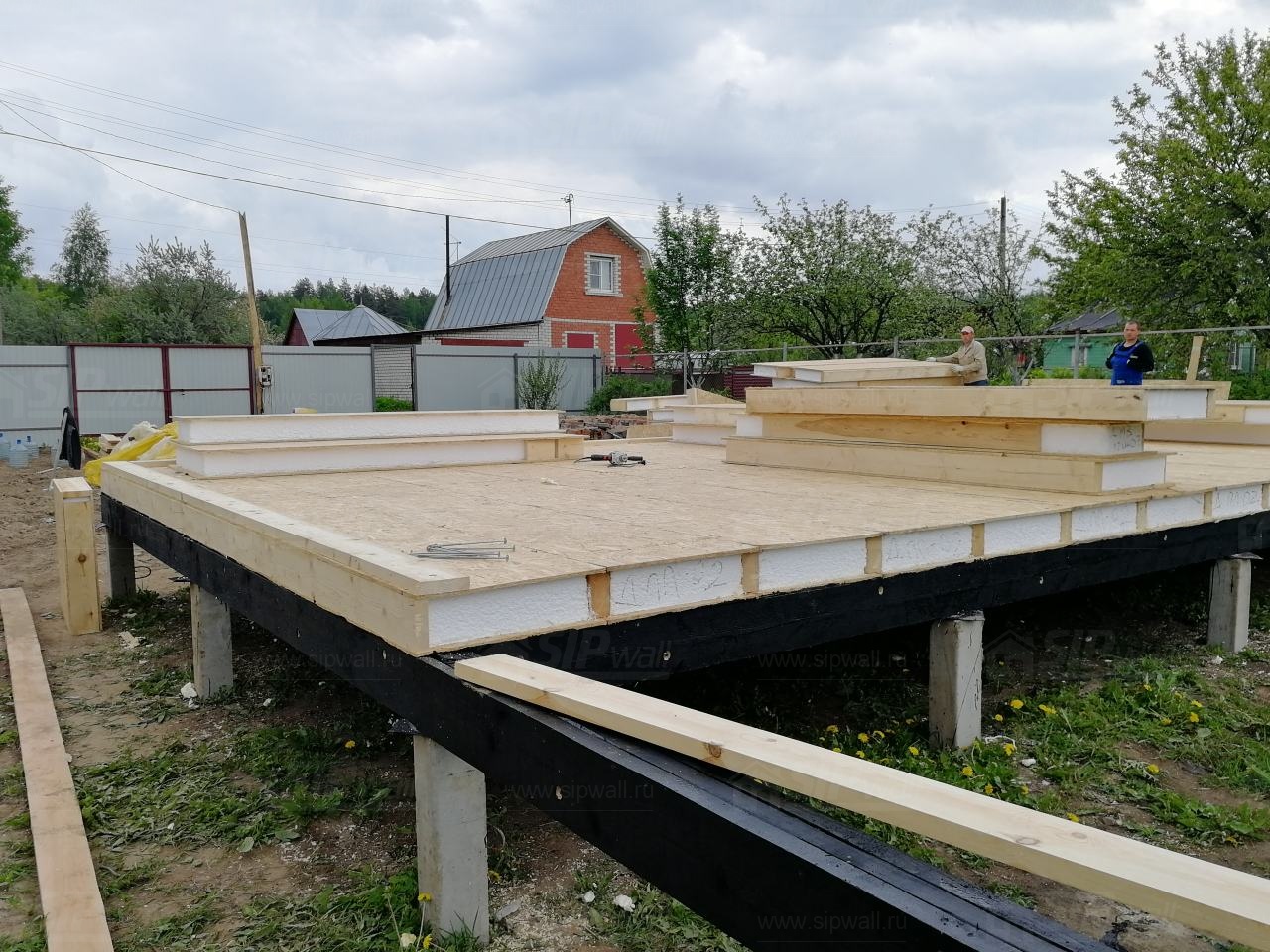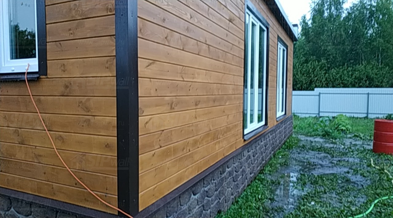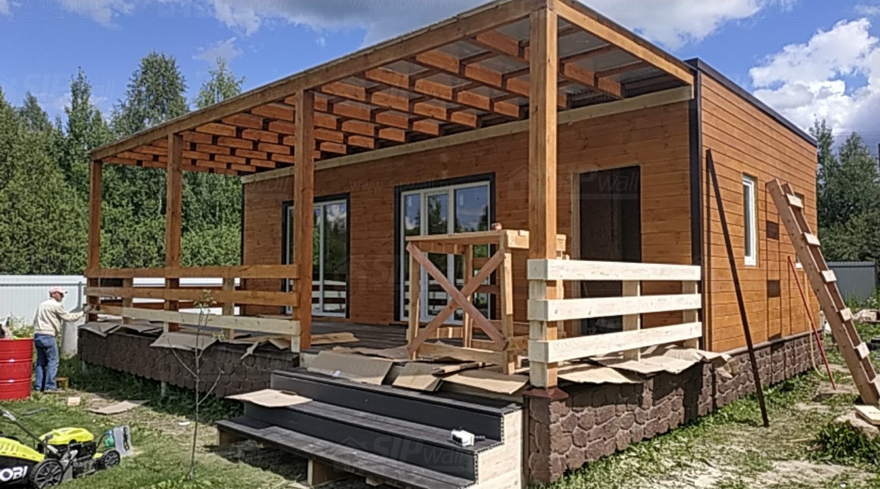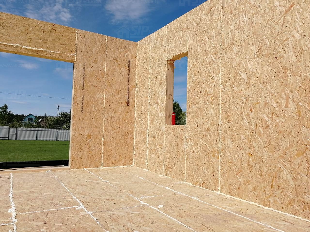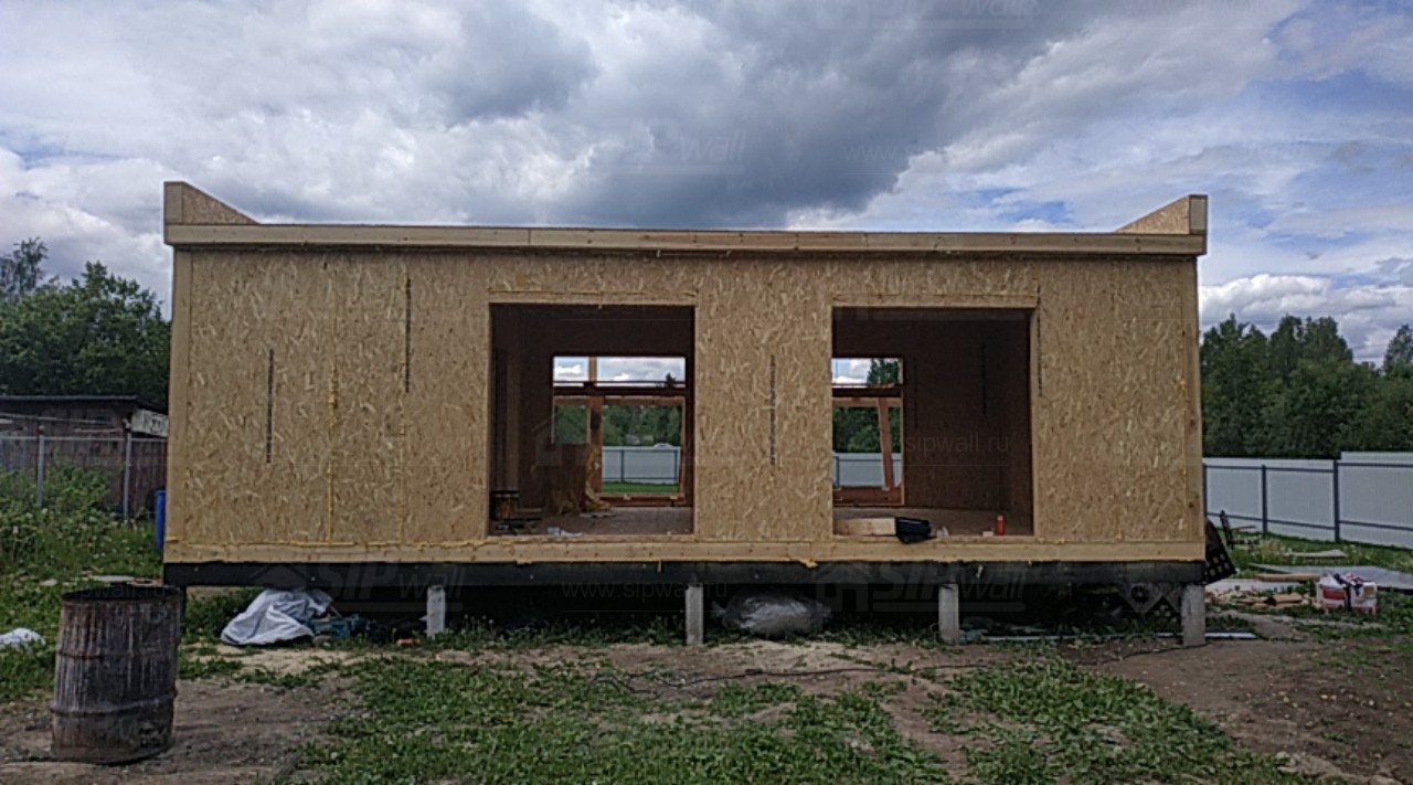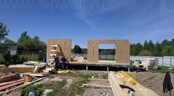 Комплектация домокомплекта: перекрытие на отметке +0.000 - СИП - 174У мм., несущие стены дома выполнены из СИП панелей 174 мм., внутренние несущие стены выполнены из СИП панелей 174 мм, и внутренние не несущие перегородки выполнены из СИП панелей 124 мм. Кровля - СИП панели 174У мм.