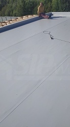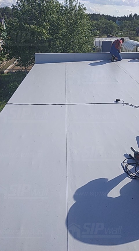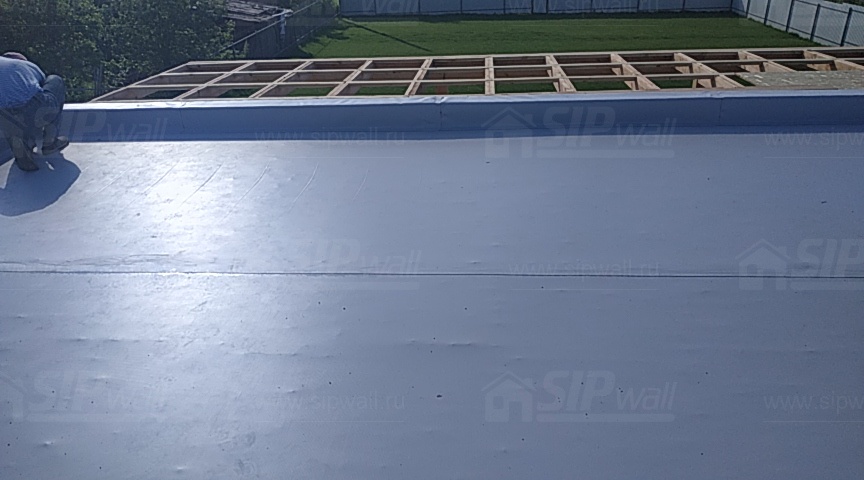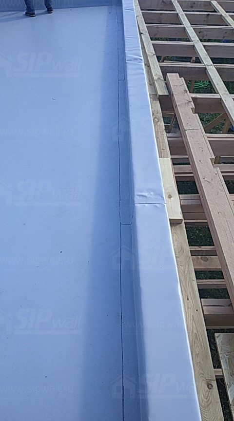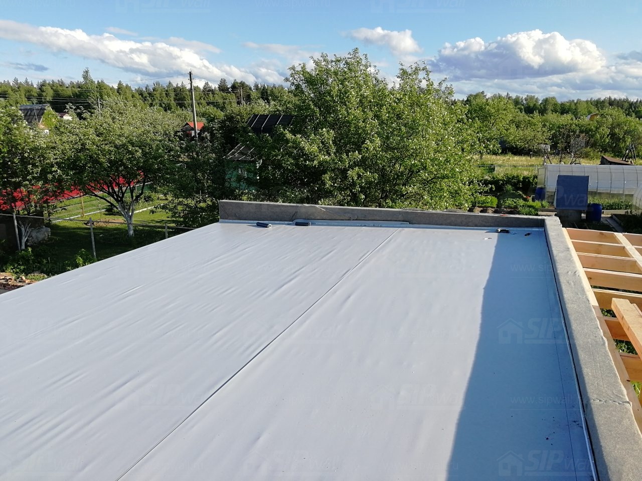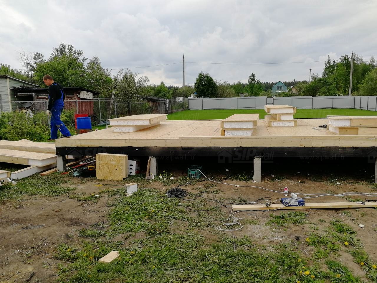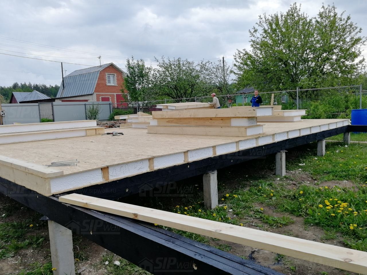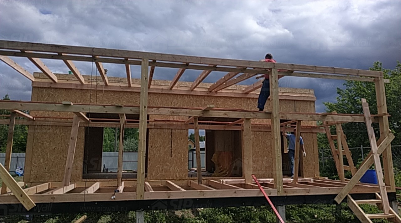 Комплектация домокомплекта: перекрытие на отметке +0.000 - СИП - 174У мм., несущие стены дома выполнены из СИП панелей 174 мм., внутренние несущие стены выполнены из СИП панелей 174 мм, и внутренние не несущие перегородки выполнены из СИП панелей 124 мм. Кровля - СИП панели 174У мм.