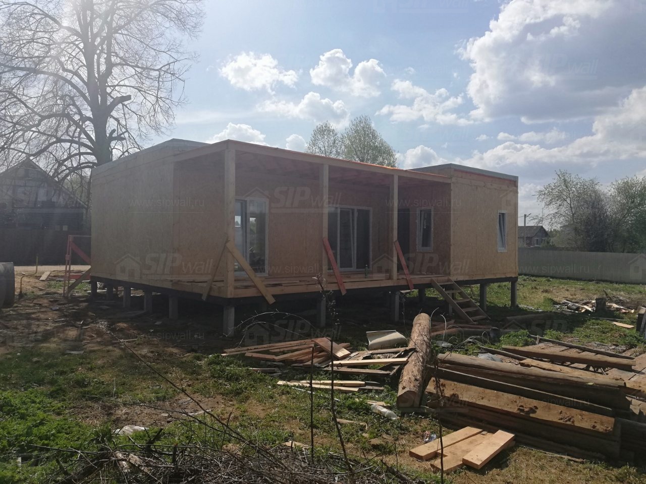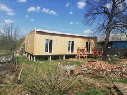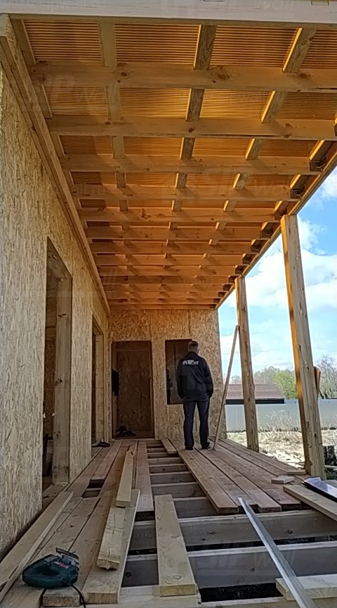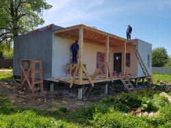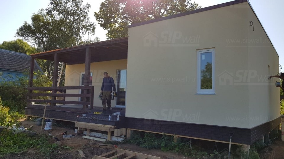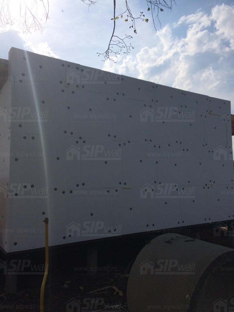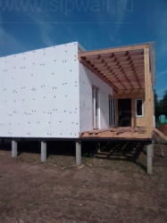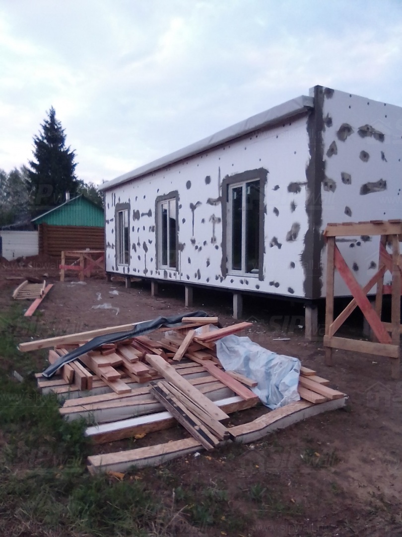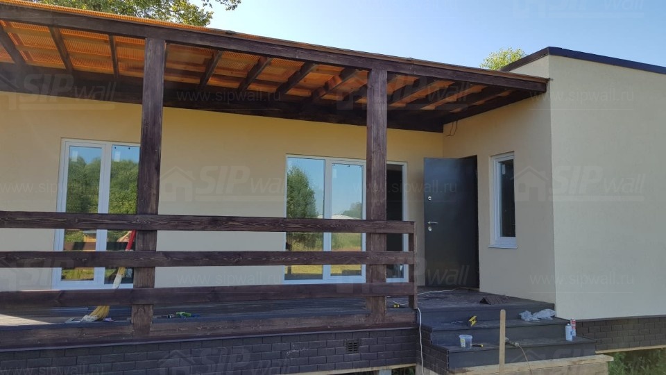 Домокомплект - изготовлен по проекту из СИП панелей произведенный по технологии SIPwall (ЭКОПАН) на собственном заводе расположенном в г. Шуя, Ивановской области. При изготовлении домокомплекта панельно каркасного дома используется только сухой строганный брус камерной сушки, обработанный огнебиозащитным составом.