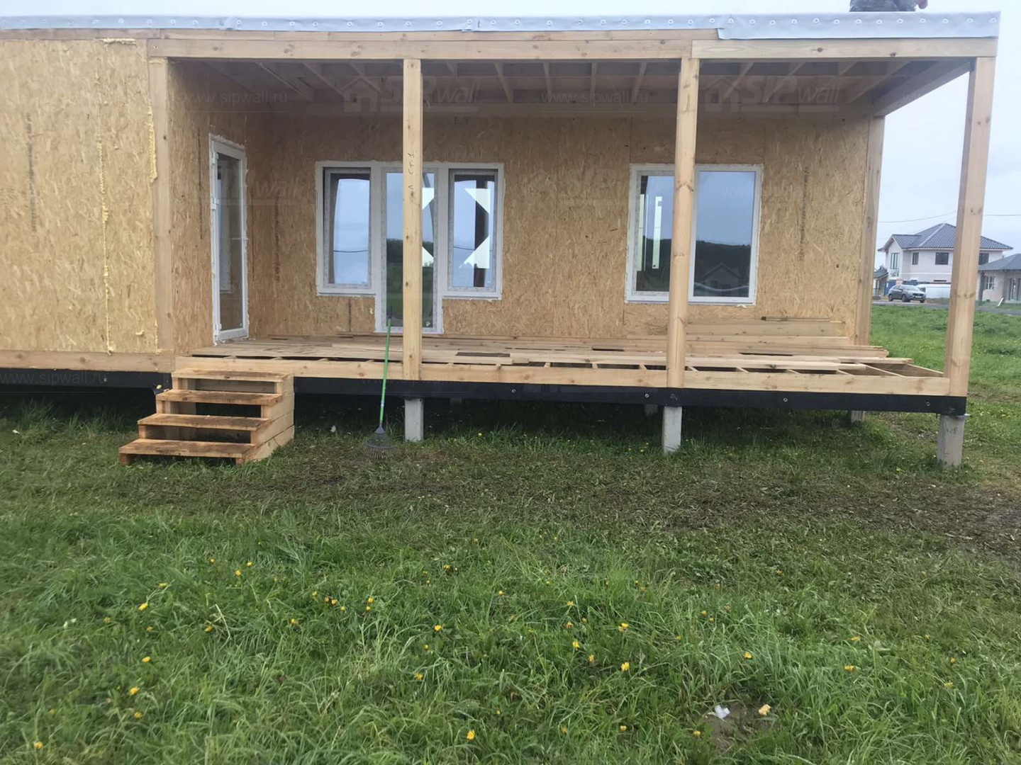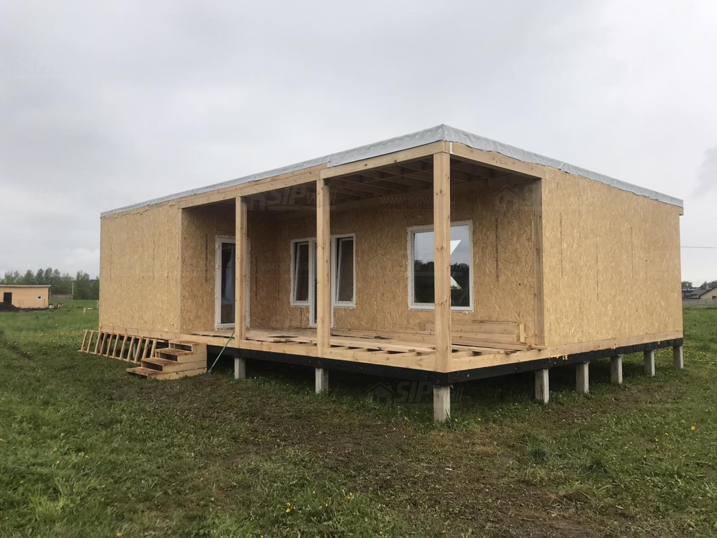 Комплектация домокомплекта: перекрытие на отметке +0.000 - СИП - 174У мм., несущие стены дома выполнены из СИП панелей 174 мм, внутренние несущие стены и не несущие стены выполнены по каркасной технологии. Кровля - СИП 174У.