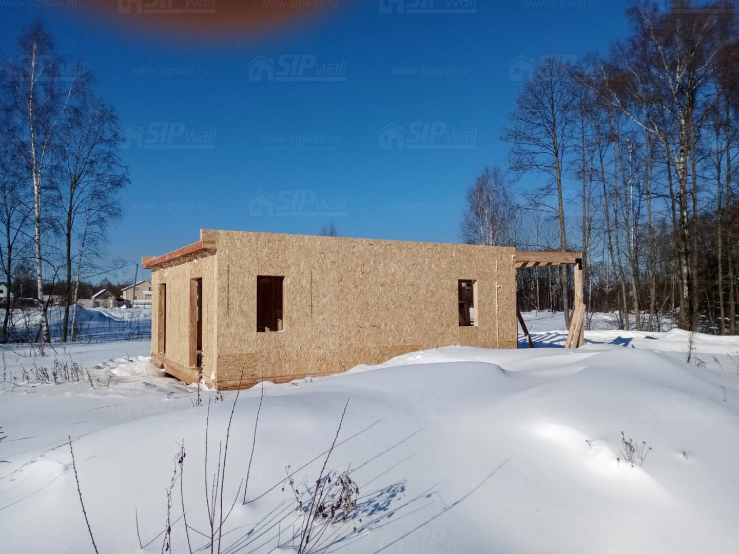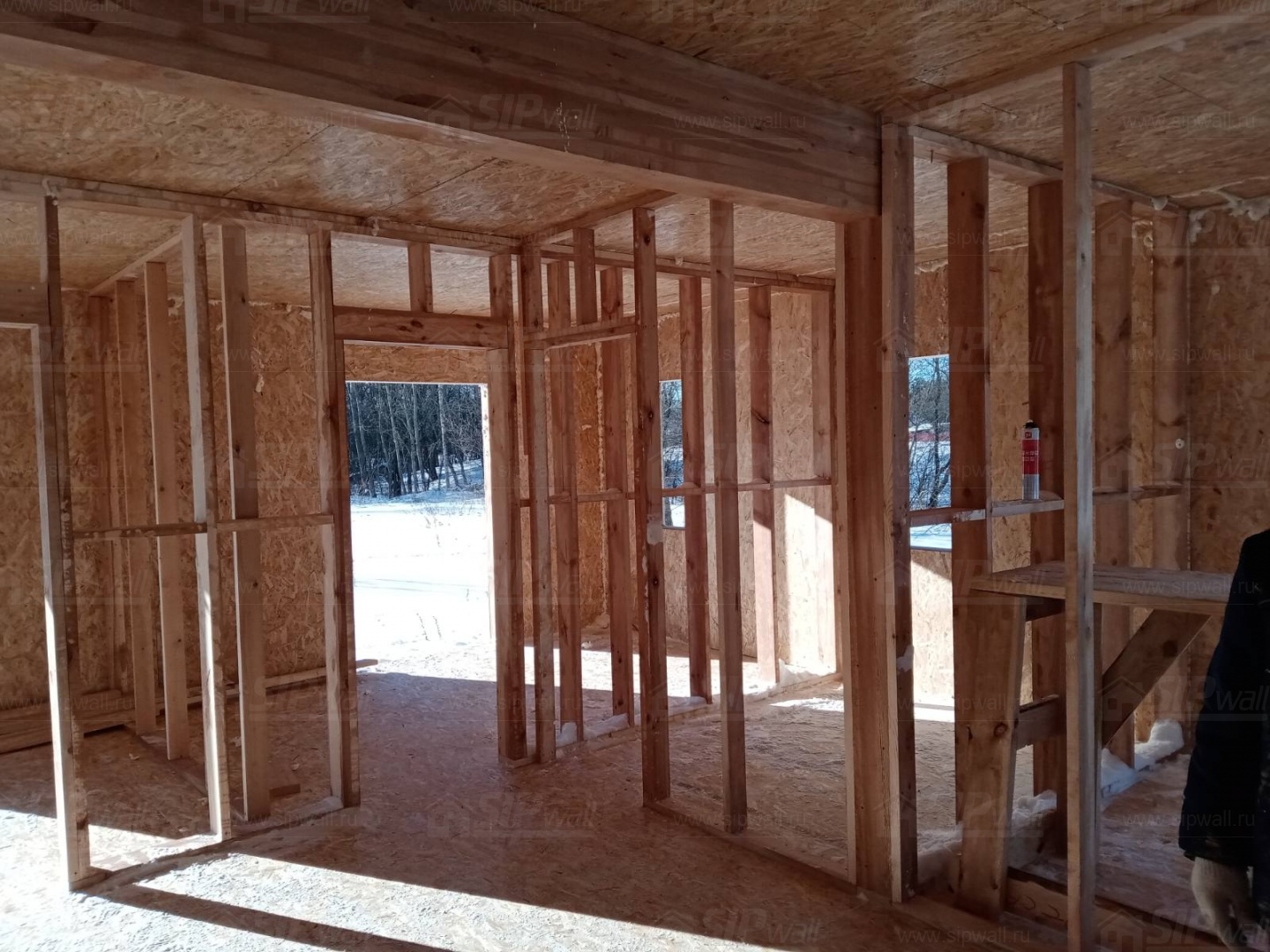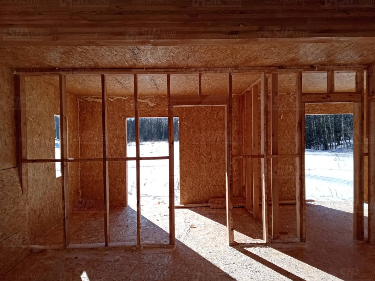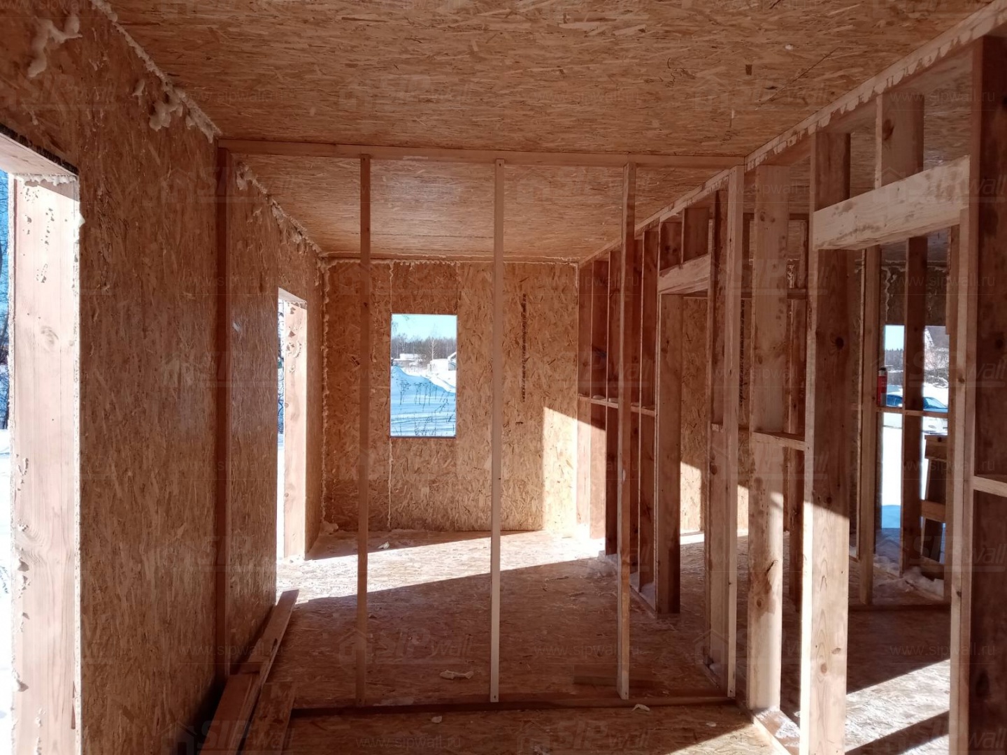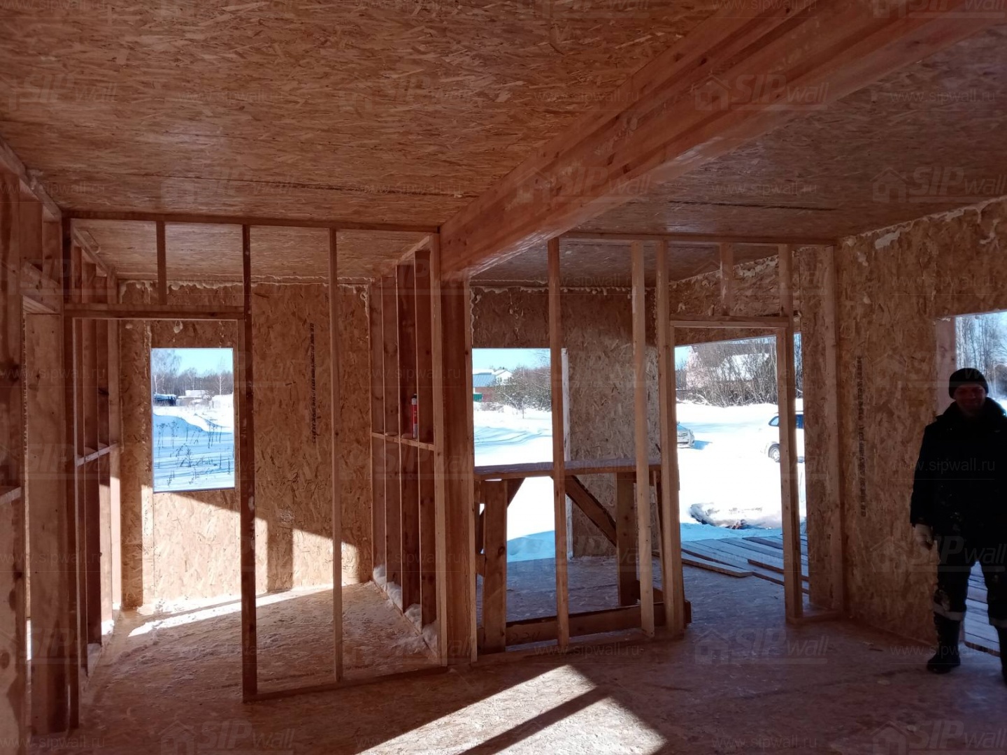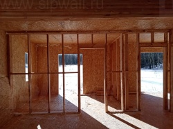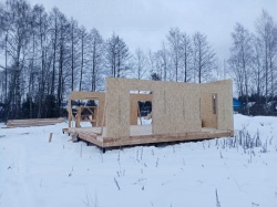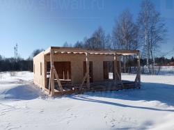Все СИП панели SIPwall толщиной 224/174/124 мм (плиты OSB-3 толщиной 12 мм "Калевала" Россия и фасадный пенополистирол ППС-14 толщиной 200/150/100 мм производства, Россия) нарезаны и обрусованы сухим строганным брусом камерной сушки в соответствии с проектной документацией.
