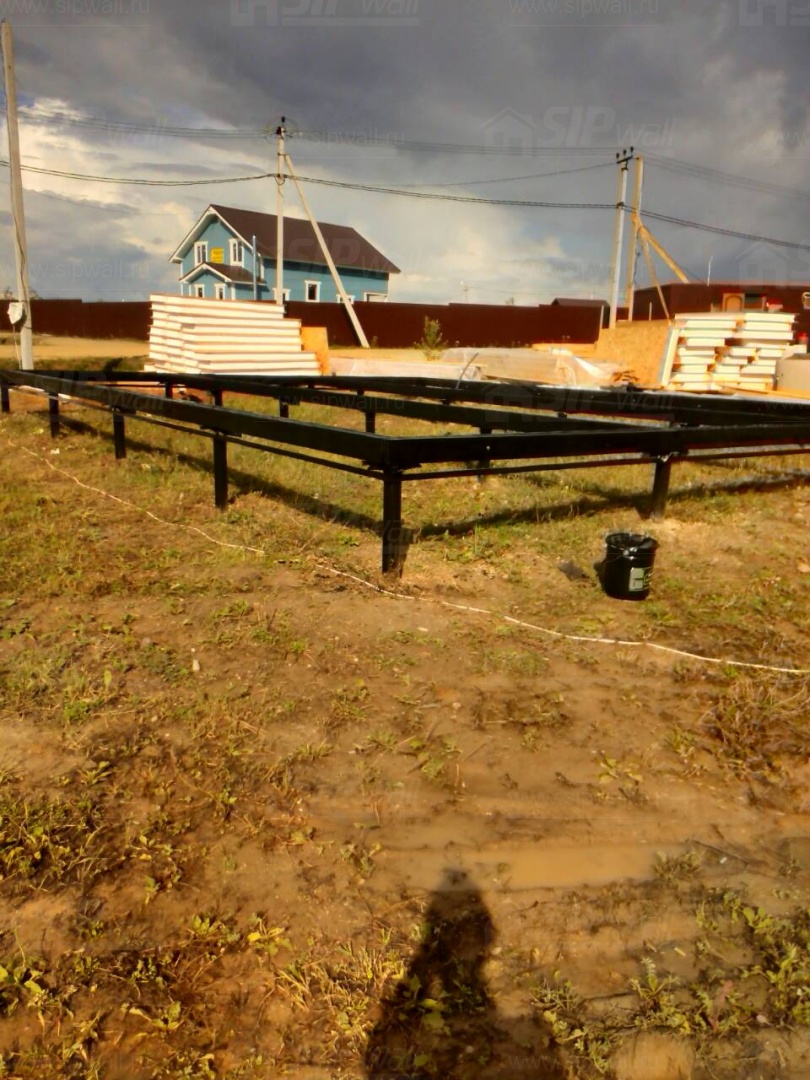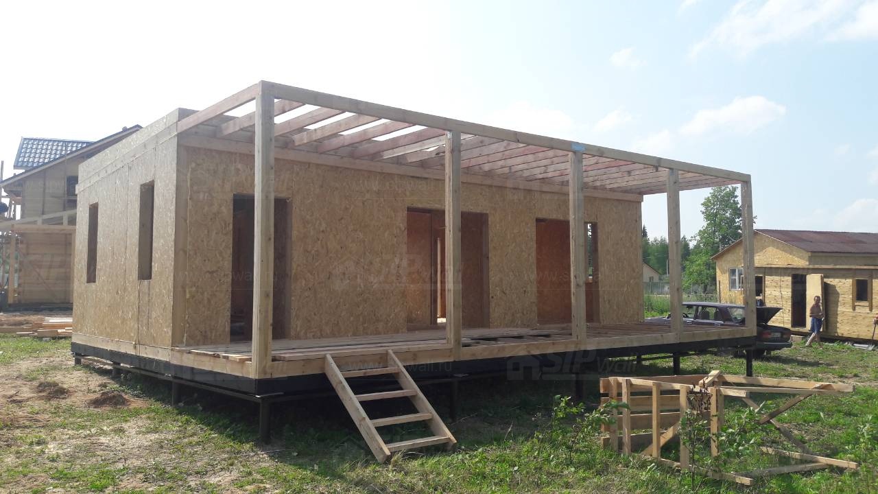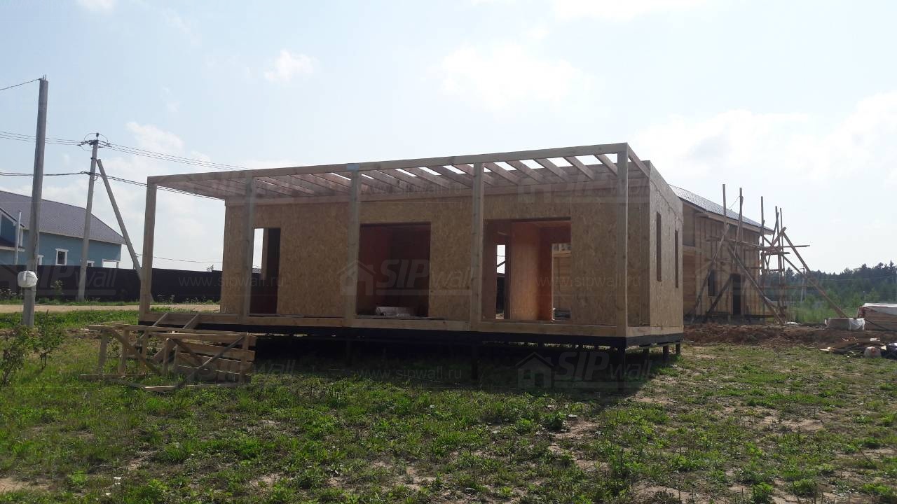 Комплектация домокомплекта: перекрытие на отметке +0.000 - СИП - 174У мм., несущие стены дома выполнены из СИП панелей 174 мм., внутренние несущие стены выполнены из СИП панелей 174 мм., внутренние не несущие перегородки выполнены из СИП панелей 124 мм.. Перекрытие межэтажное - выполнено из СИП панелей 174У мм. Кровля - стропильная система.