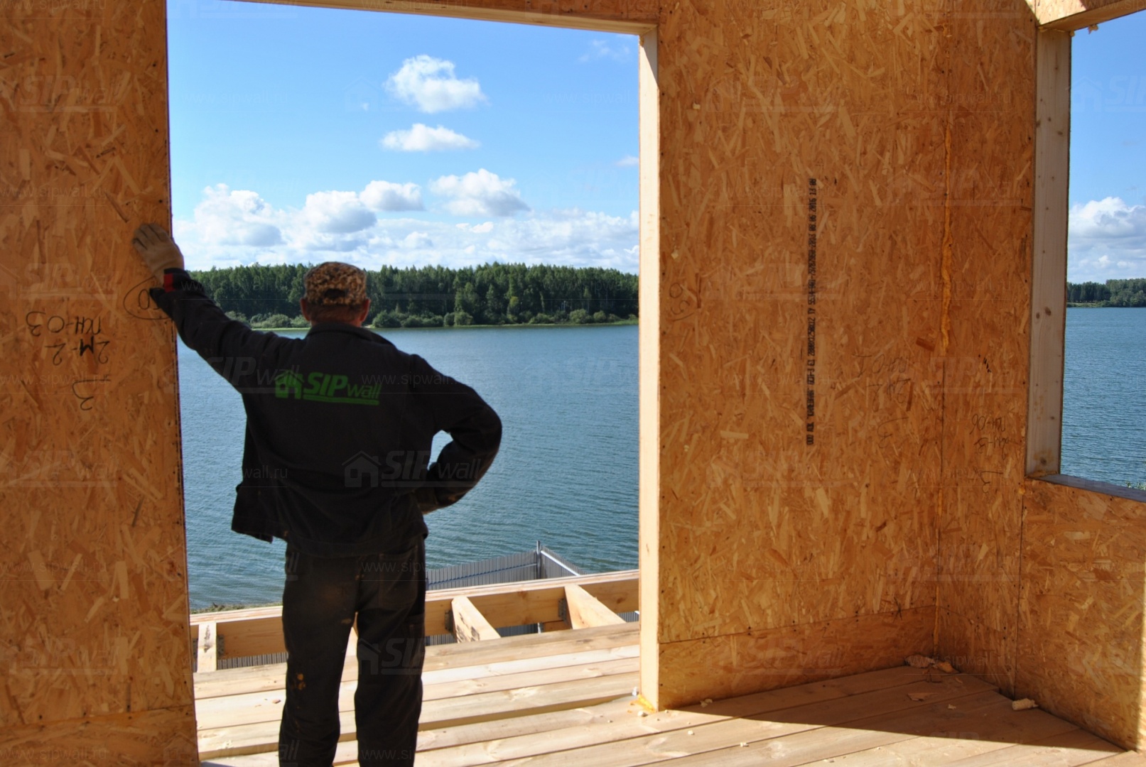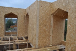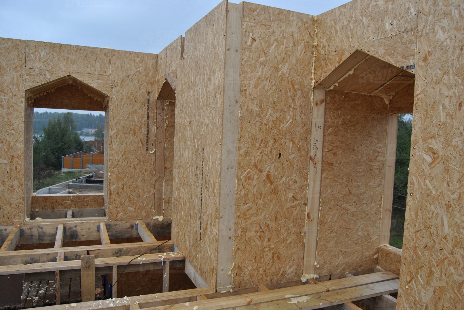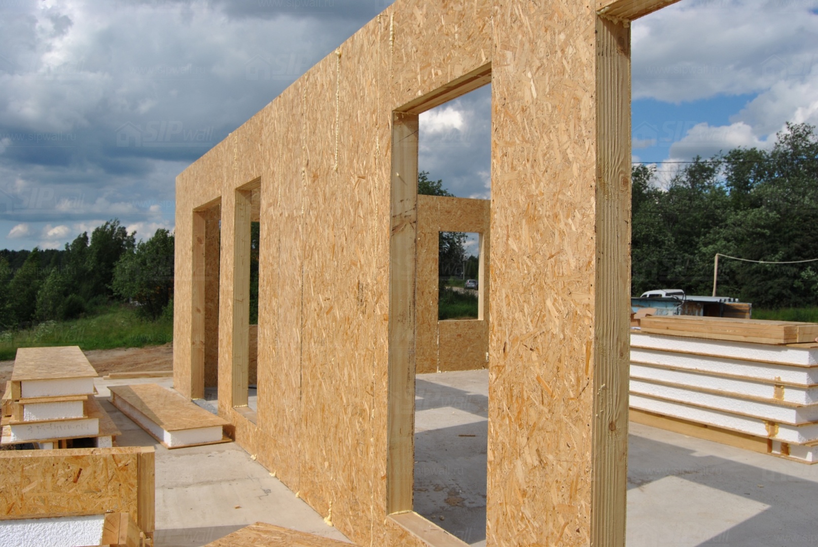 Все СИП панели SIPwall толщиной 224/174/124 мм (плиты OSB-3 толщиной 12 мм "Калевала" Россия и фасадный пенополистирол ПСБ-С 25 по ГОСТ 15588-14 толщиной 200/150/100 мм производства завода "PolarPlast", Россия) нарезаны и обрусованы сухим строганным брусом в соответствии с проектной документацией.