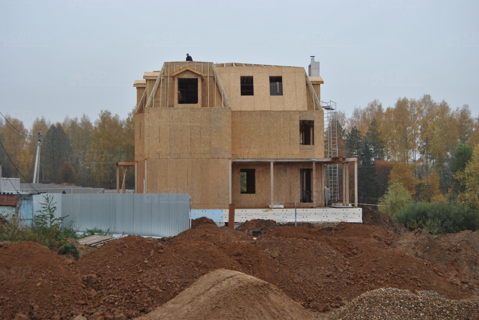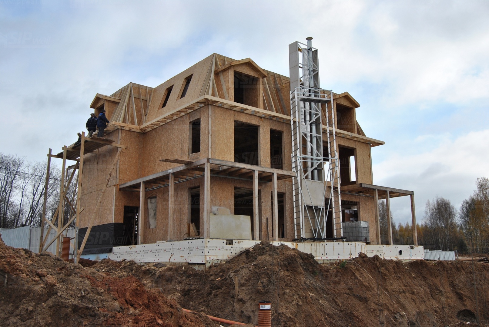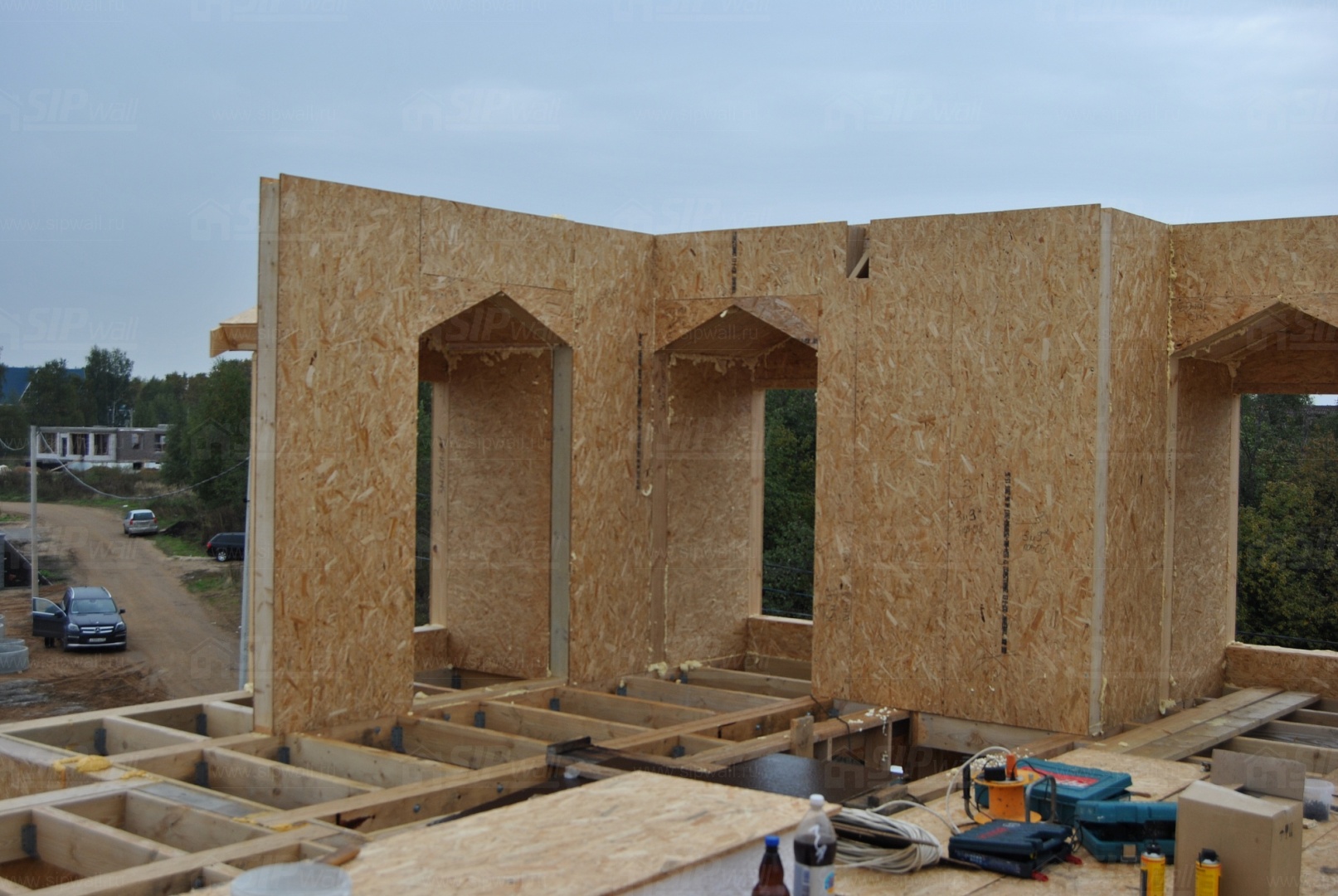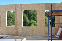 Все СИП панели SIPwall толщиной 224/174/124 мм (плиты OSB-3 толщиной 12 мм "Калевала" Россия и фасадный пенополистирол ПСБ-С 25 по ГОСТ 15588-14 толщиной 200/150/100 мм производства завода "PolarPlast", Россия) нарезаны и обрусованы сухим строганным брусом в соответствии с проектной документацией.