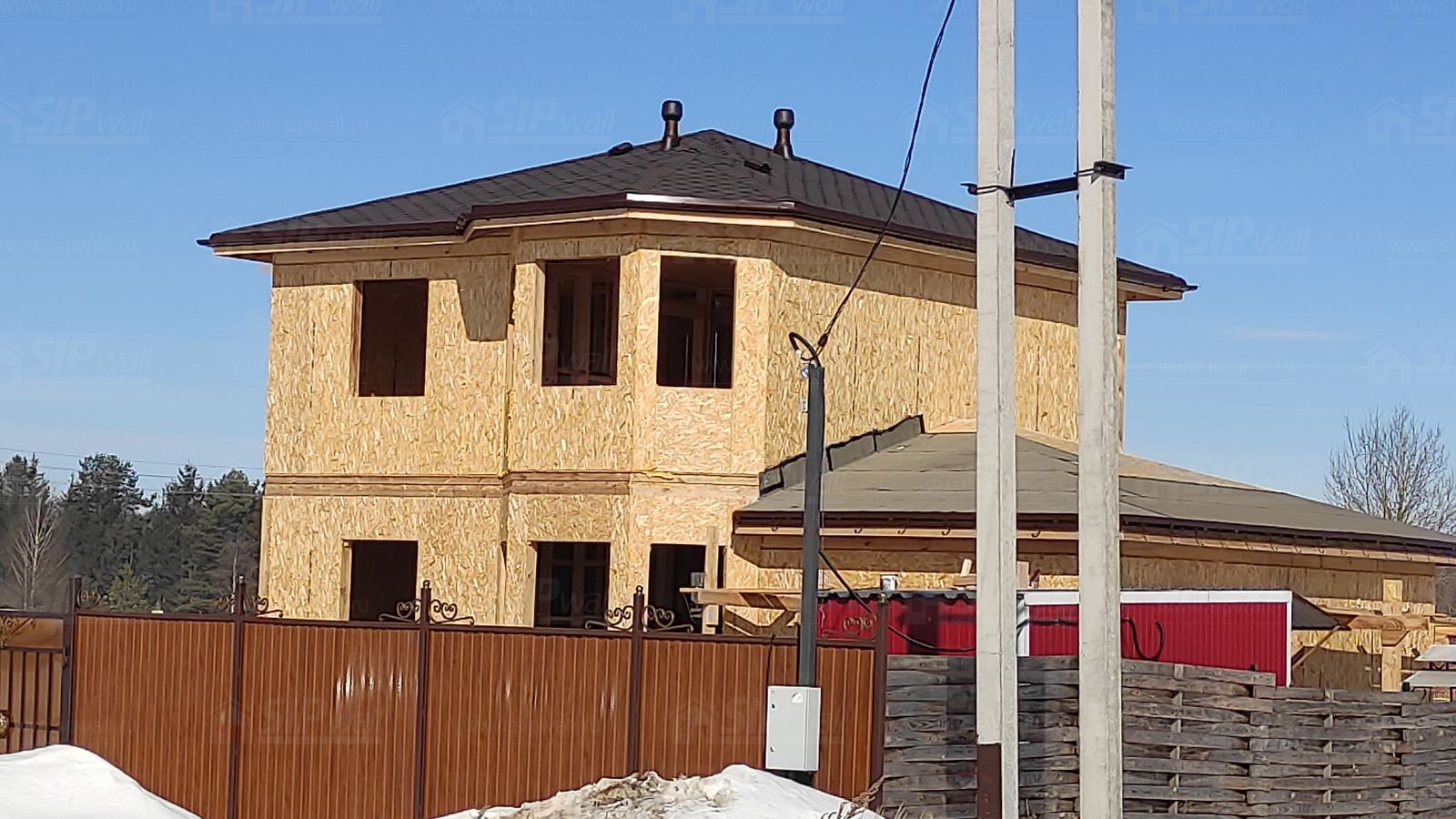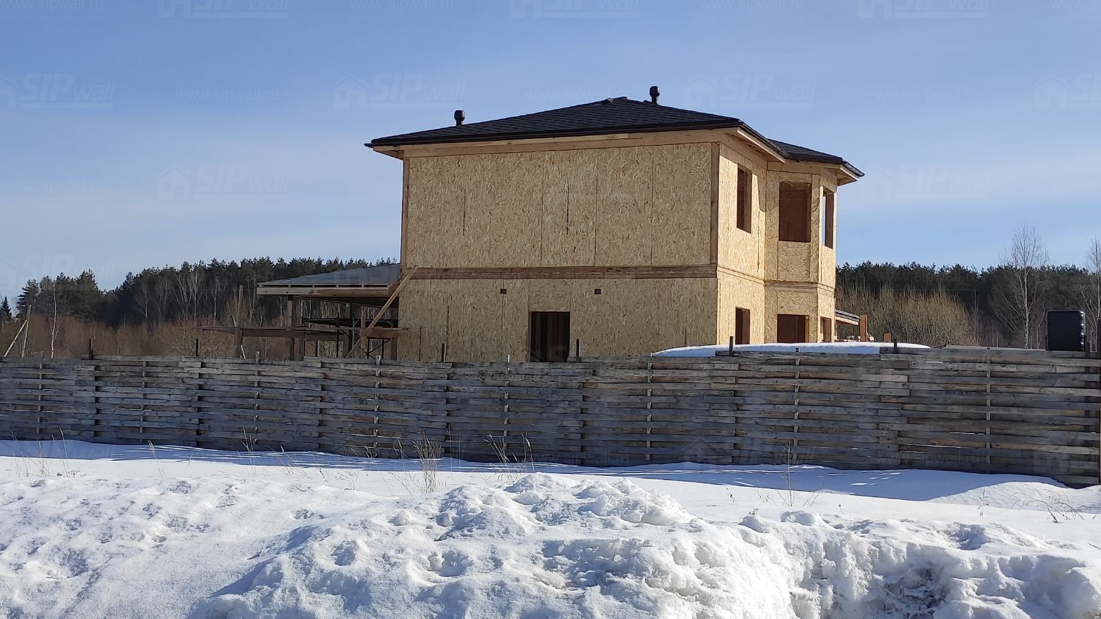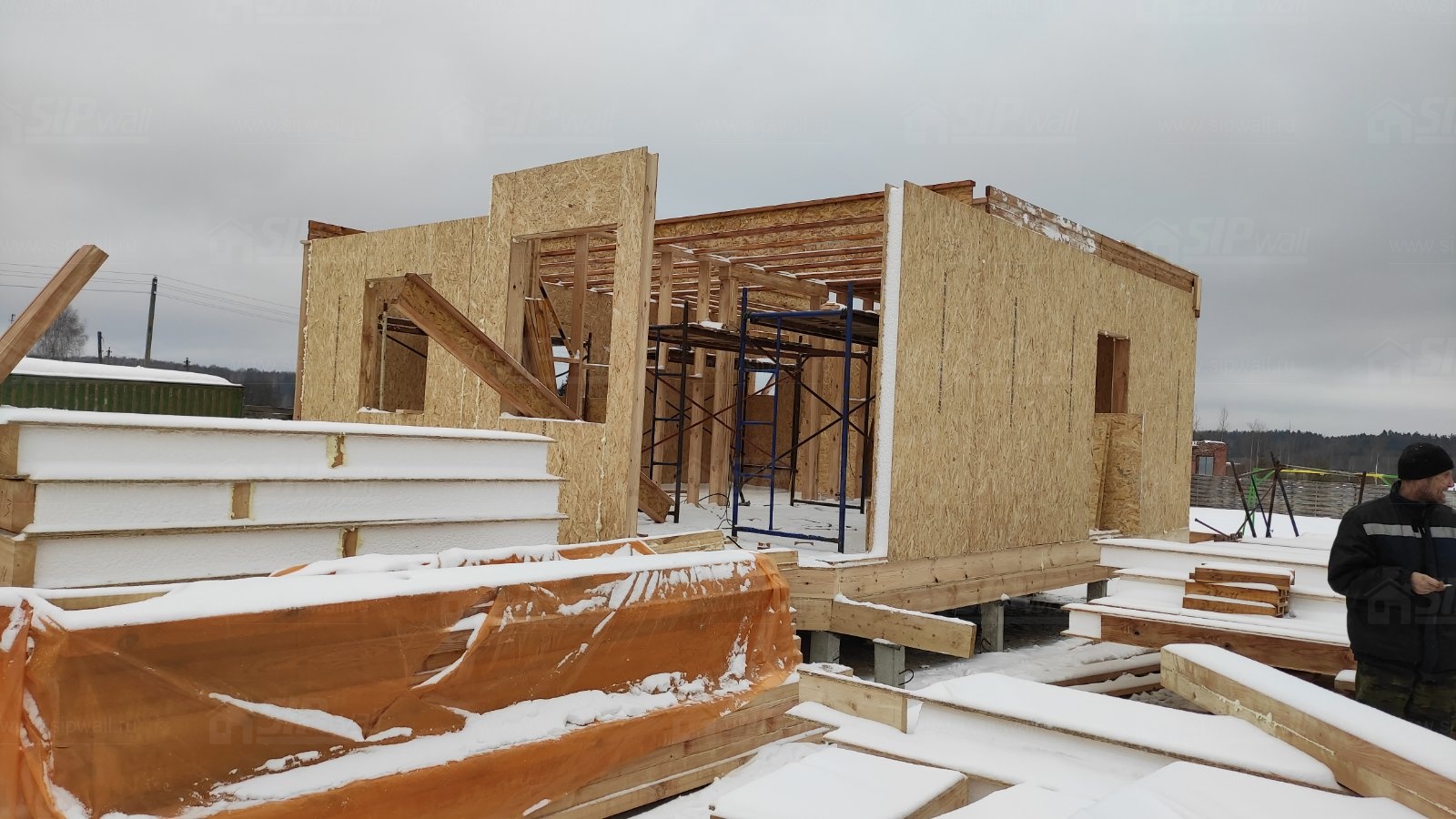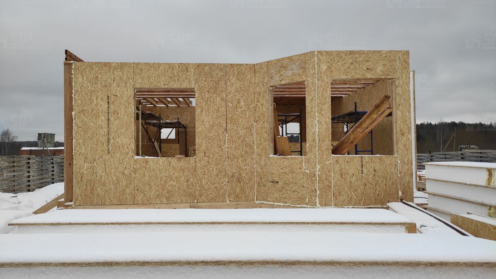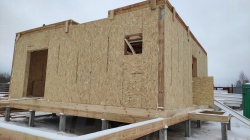 Все СИП панели SIPwall толщиной 224/174/124 мм (плиты OSB-3 толщиной 12 мм "Калевала" Россия и фасадный пенополистирол ППС-14 толщиной 200/150/100 мм производства, Россия) нарезаны и обрусованы сухим строганным брусом камерной сушки в соответствии с проектной документацией.