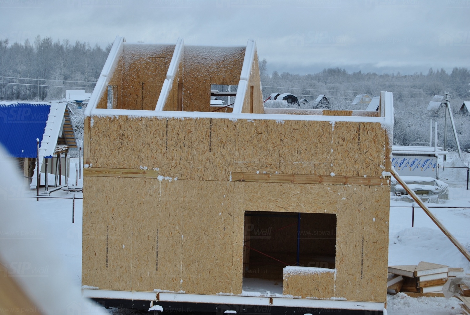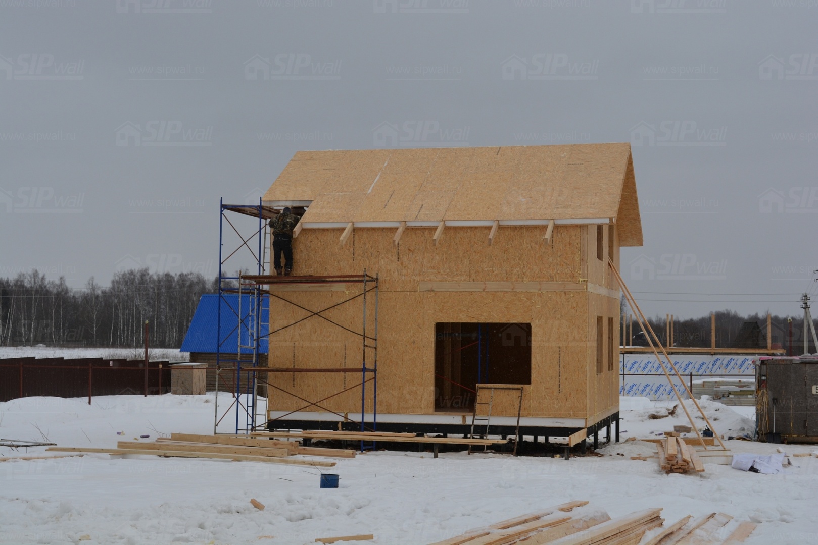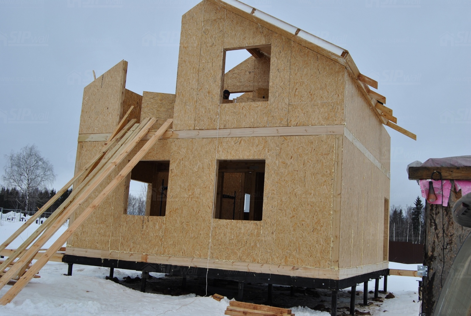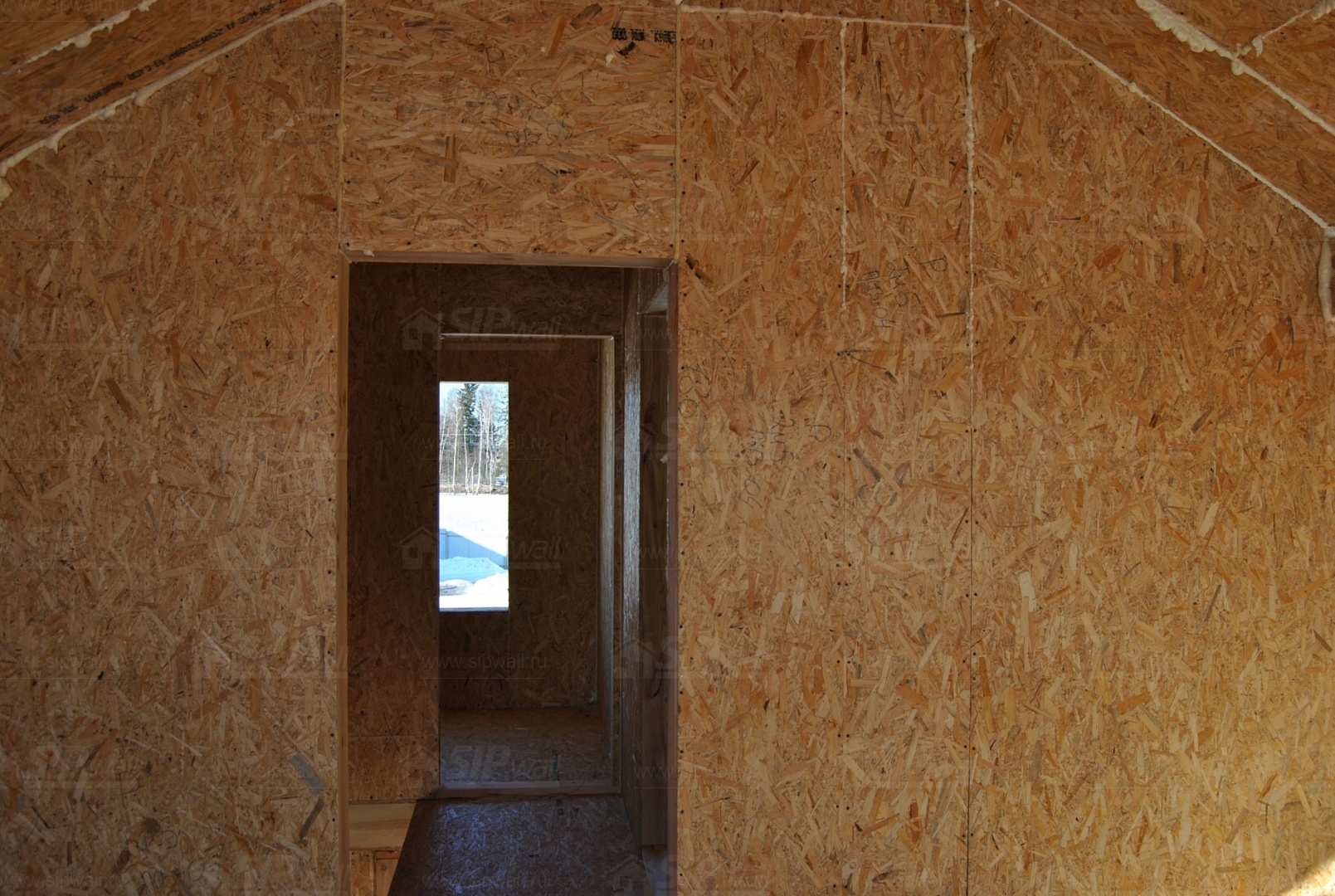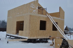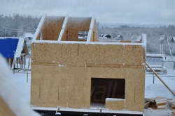 Все СИП панели SIPwall толщиной 224/174/124 мм (плиты OSB-3 толщиной 12 мм "Калевала" Россия и фасадный пенополистирол ПСБ-С 25 по ГОСТ 15588-06 толщиной 200/150/100 мм производства завода "PolarPlast", Россия) нарезаны и обрусованы сухим строганным брусом в соответствии с проектной документацией.