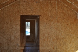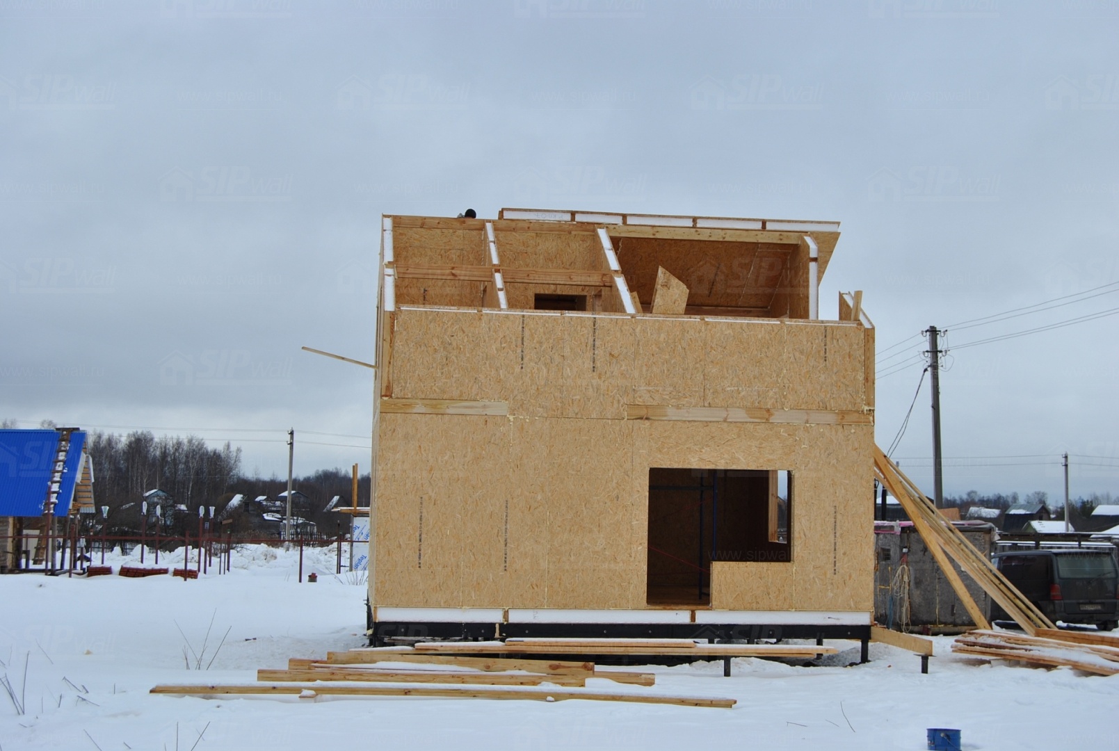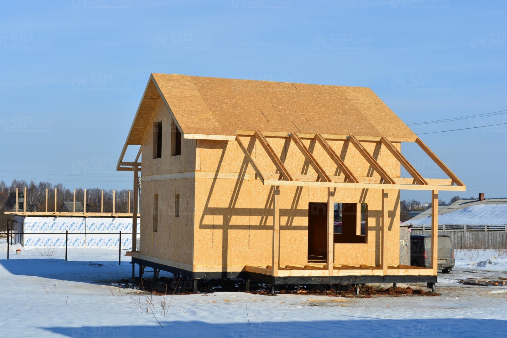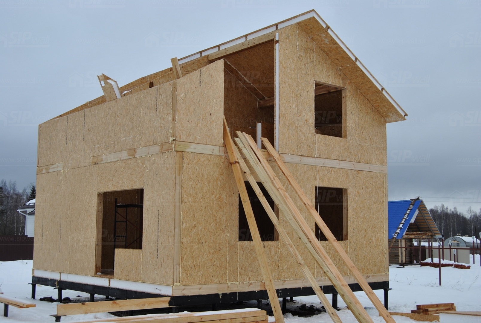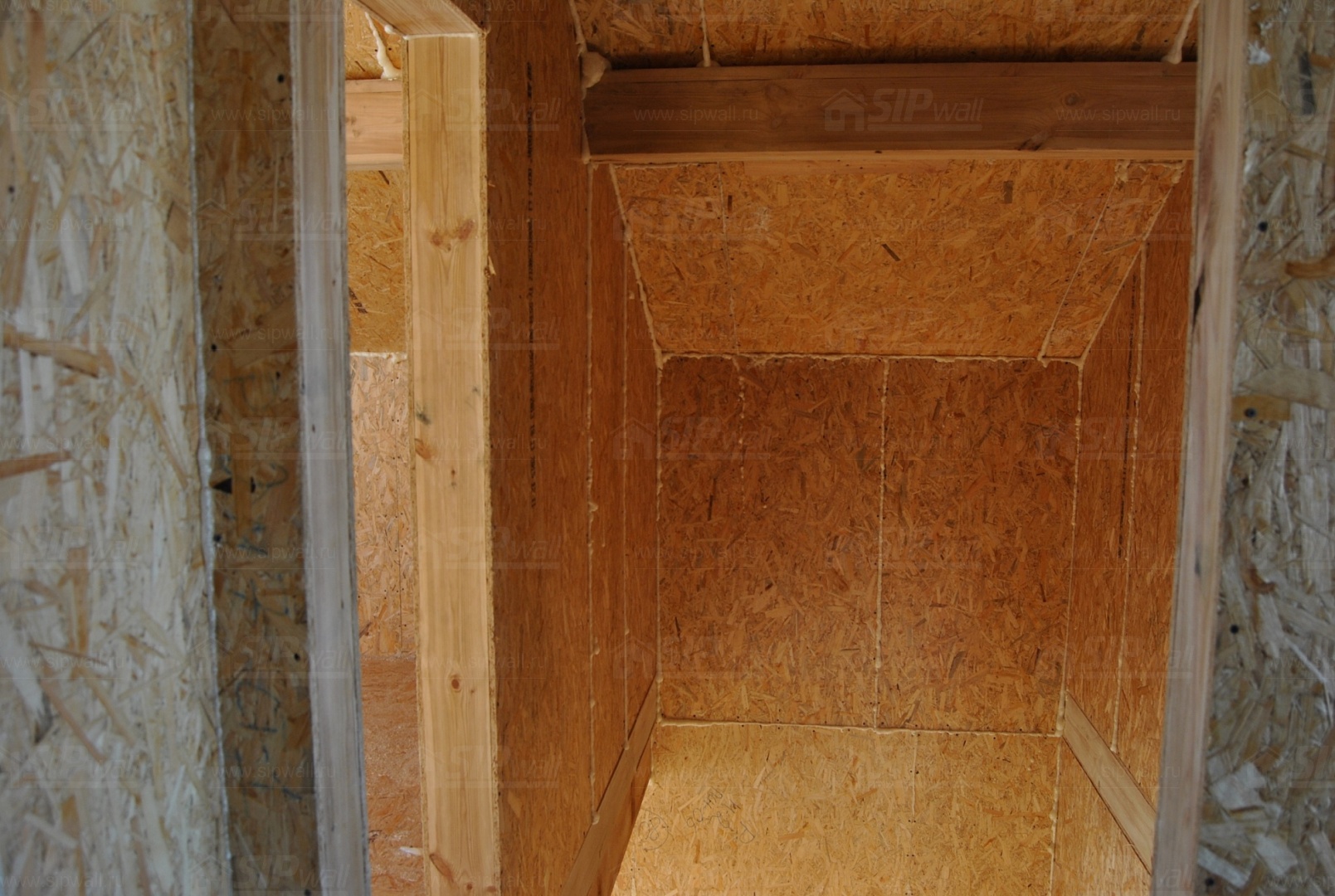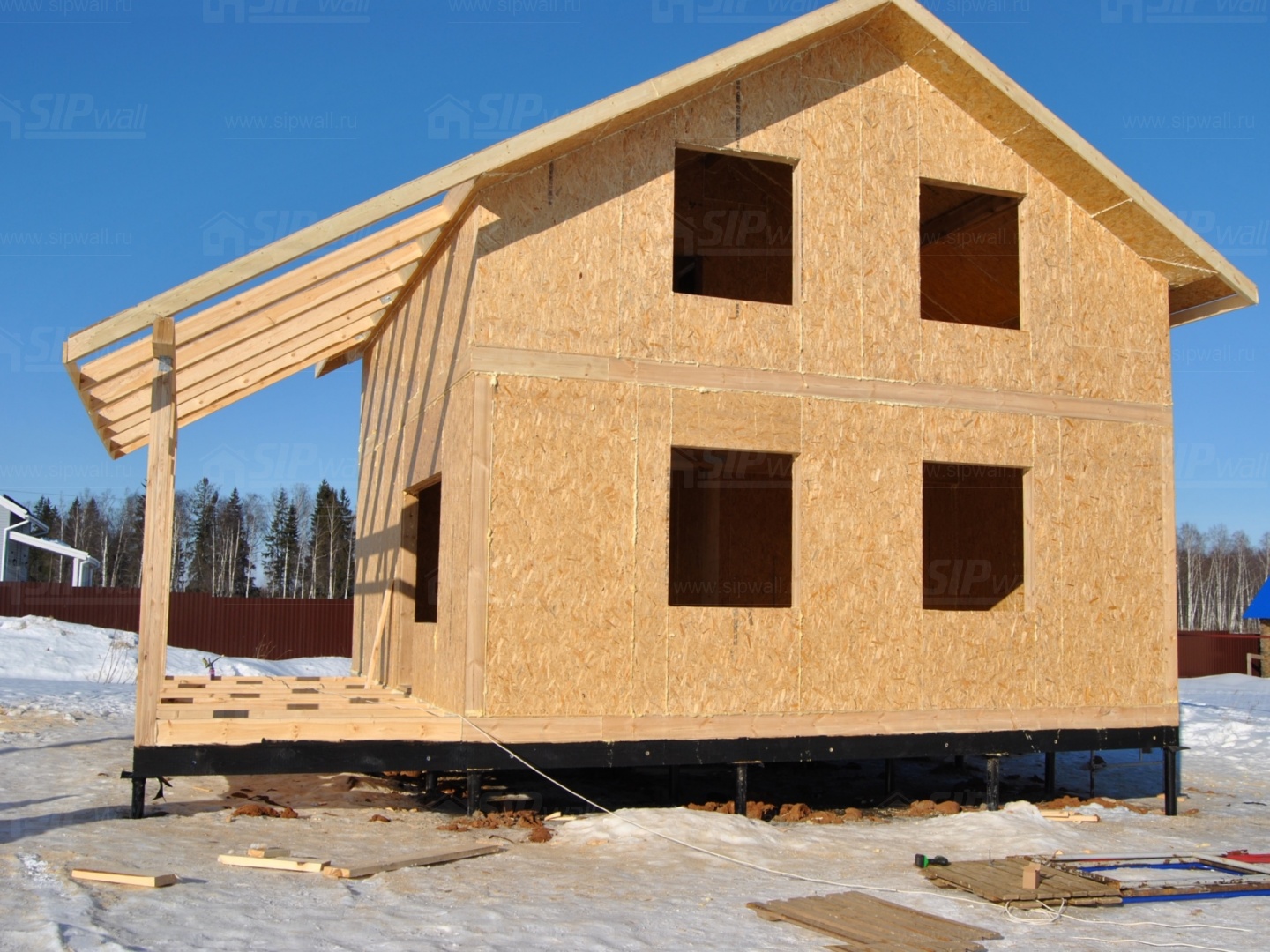 Все СИП панели SIPwall толщиной 224/174/124 мм (плиты OSB-3 толщиной 12 мм "Калевала" Россия и фасадный пенополистирол ПСБ-С 25 по ГОСТ 15588-06 толщиной 200/150/100 мм производства завода "PolarPlast", Россия) нарезаны и обрусованы сухим строганным брусом в соответствии с проектной документацией.