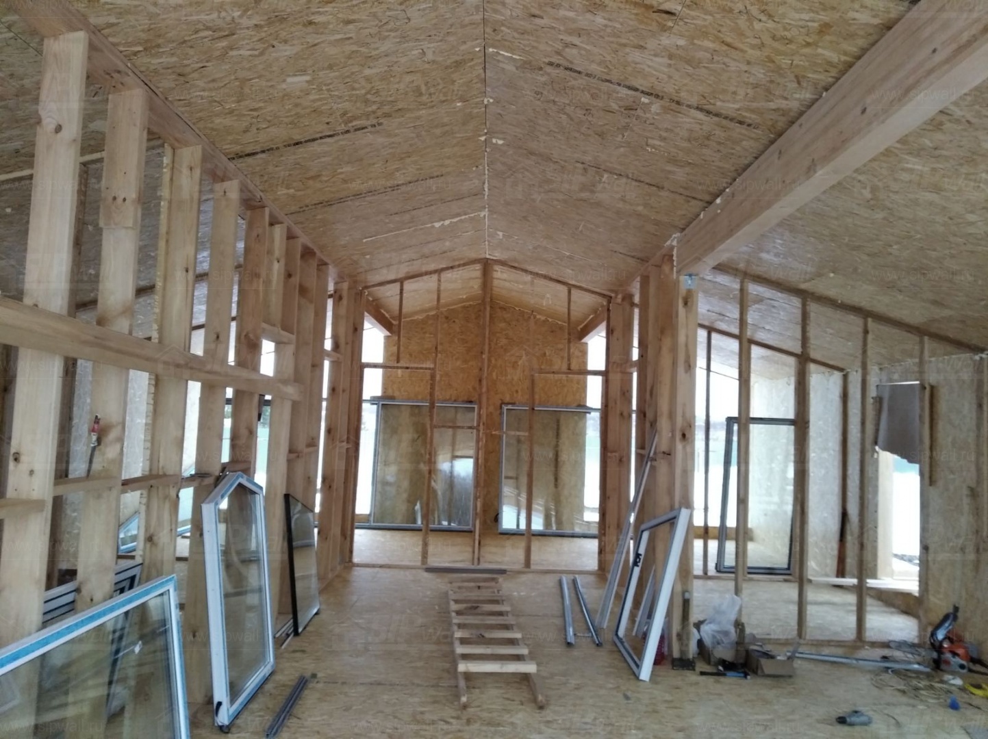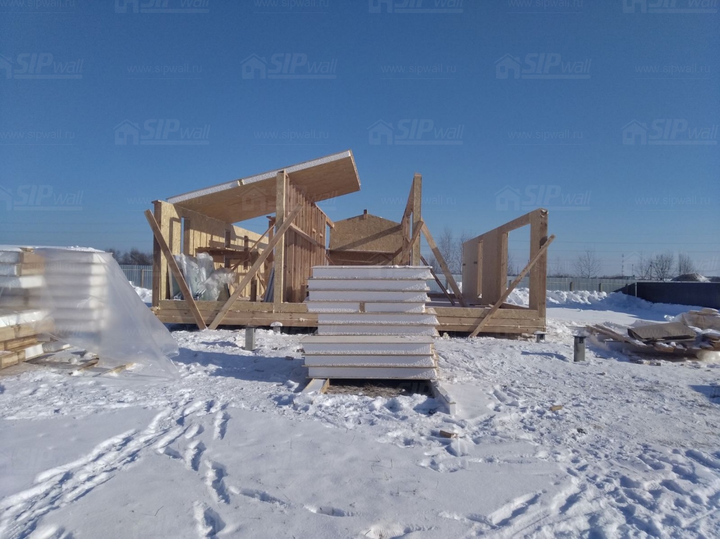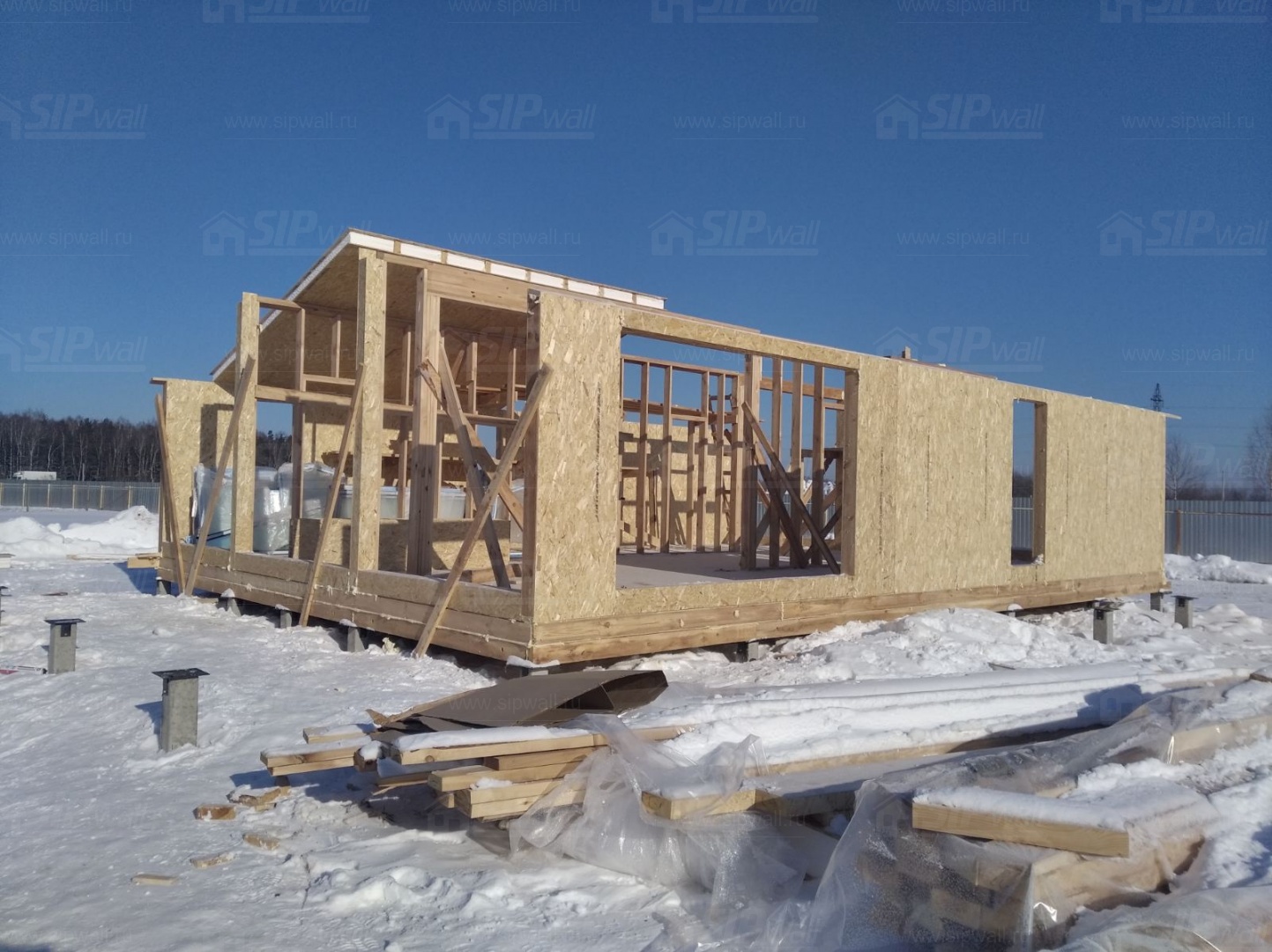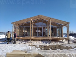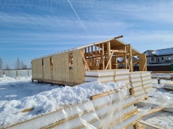 Все СИП панели SIPwall толщиной 224/174/124 мм (плиты OSB-3 толщиной 12 мм "Калевала" Россия и фасадный пенополистирол ППС-14 толщиной 200/150/100 мм производства, Россия) нарезаны и обрусованы сухим строганным брусом камерной сушки в соответствии с проектной документацией.