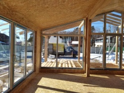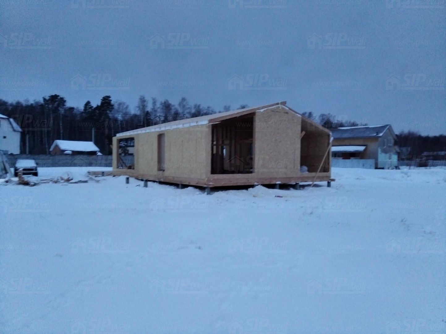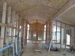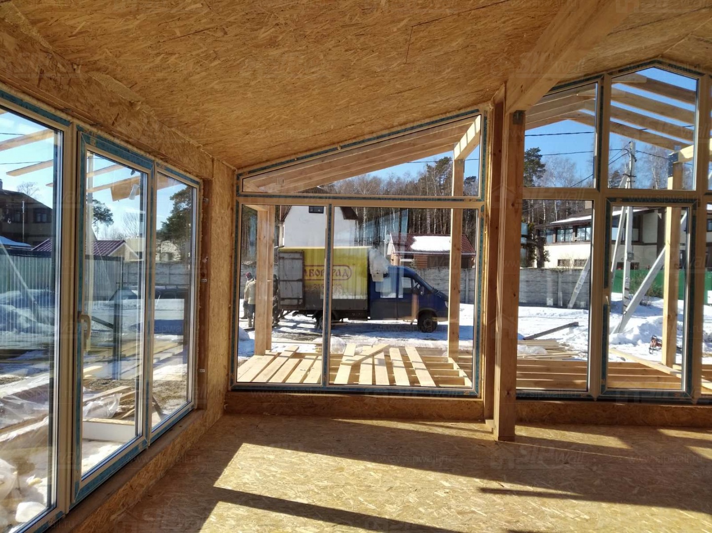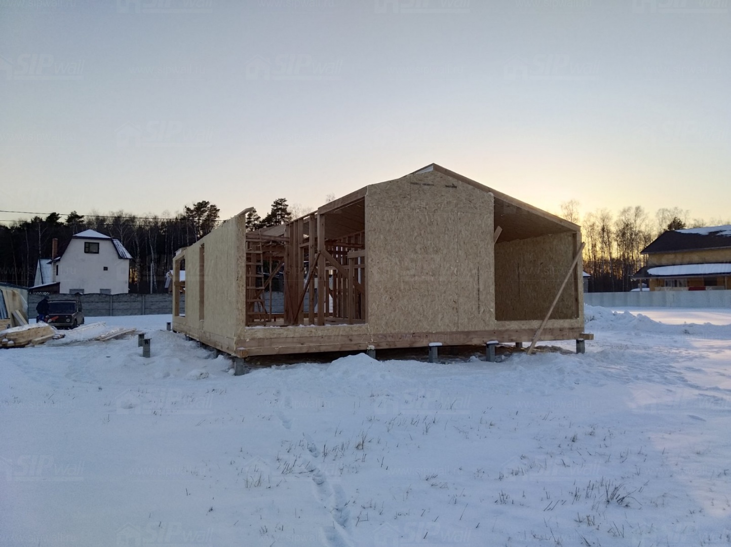 Все СИП панели SIPwall толщиной 224/174/124 мм (плиты OSB-3 толщиной 12 мм "Калевала" Россия и фасадный пенополистирол ППС-14 толщиной 200/150/100 мм производства, Россия) нарезаны и обрусованы сухим строганным брусом камерной сушки в соответствии с проектной документацией.