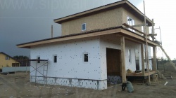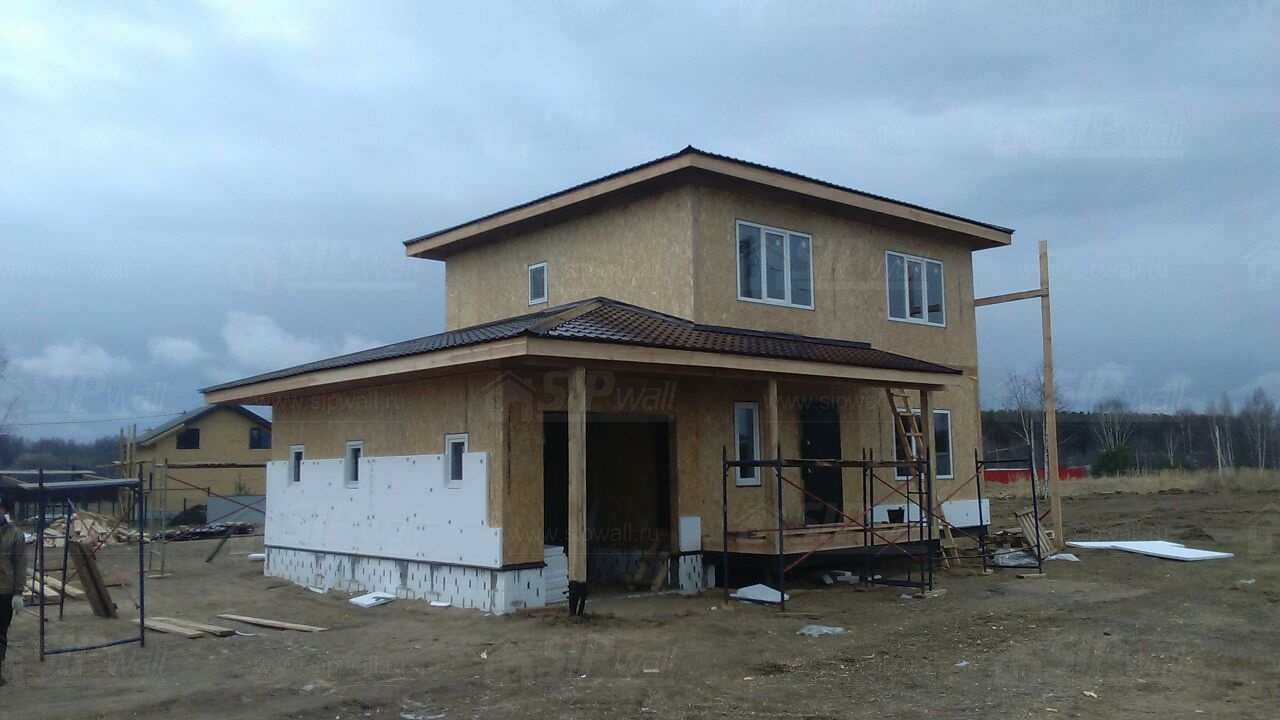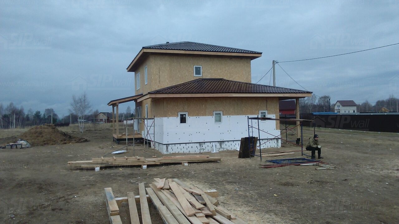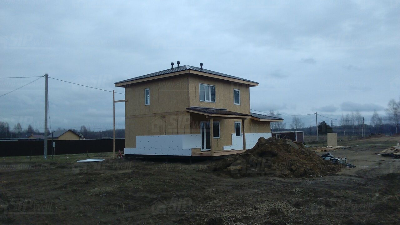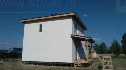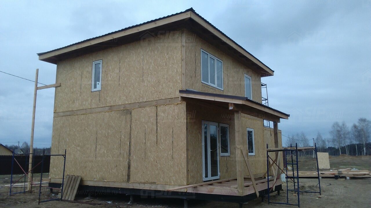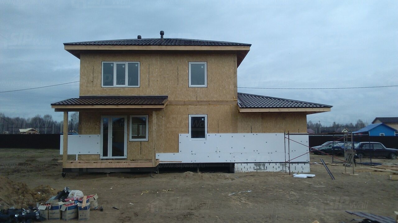 Комплектация домокомплекта: перекрытие на отметке +0.000 - СИП 224У мм., несущие стены дома выполнены из СИП панелей 174 мм., внутренние несущие стены выполнены из СИП панелей 174 мм., внутренние не несущие перегородки выполнены из СИП панелей 124 мм.. Перекрытие межэтажное - выполнено из СИП панелей 224У мм. Чердачное перекрытие - выполнено из СИП панелей 224У мм. Кровля - стропильная система