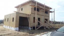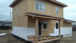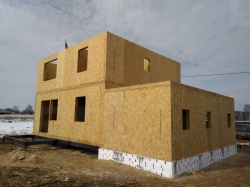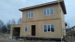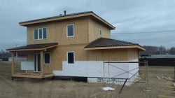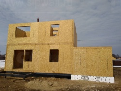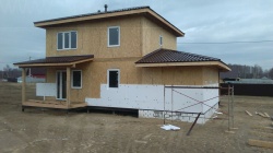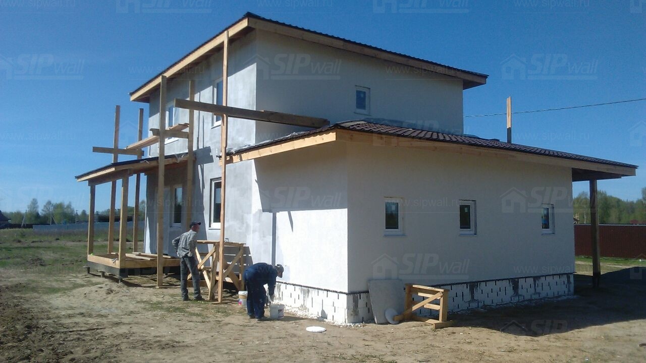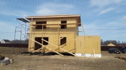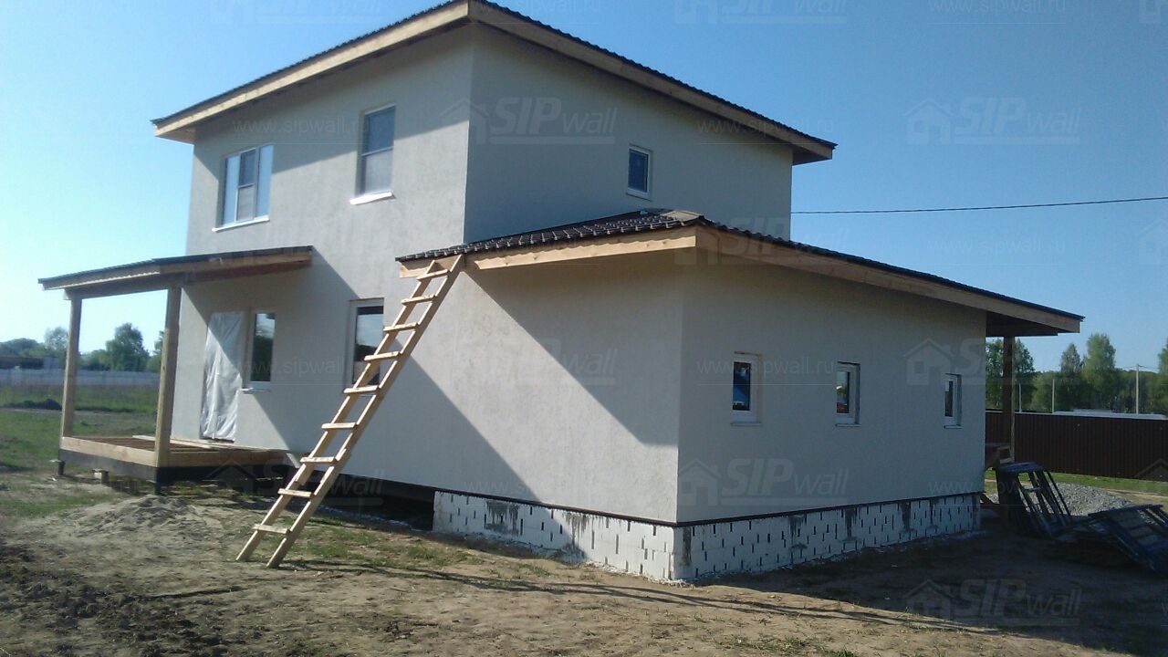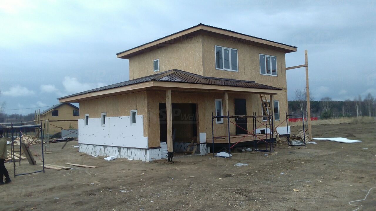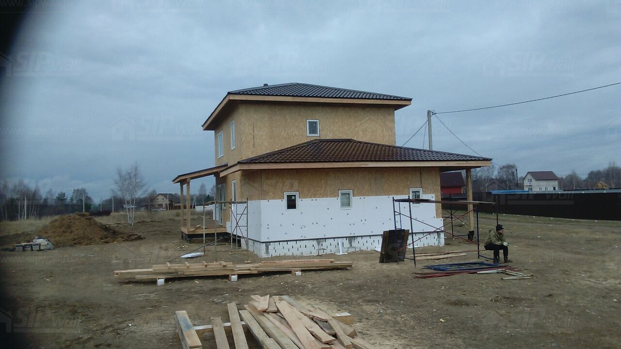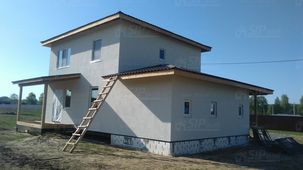 Комплектация домокомплекта: перекрытие на отметке +0.000 - СИП 224У мм., несущие стены дома выполнены из СИП панелей 174 мм., внутренние несущие стены выполнены из СИП панелей 174 мм., внутренние не несущие перегородки выполнены из СИП панелей 124 мм.. Перекрытие межэтажное - выполнено из СИП панелей 224У мм. Чердачное перекрытие - выполнено из СИП панелей 224У мм. Кровля - стропильная система