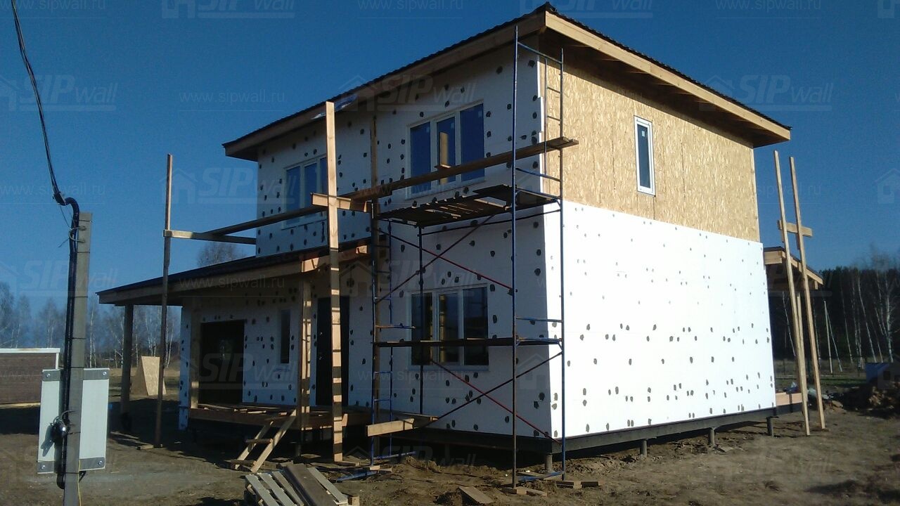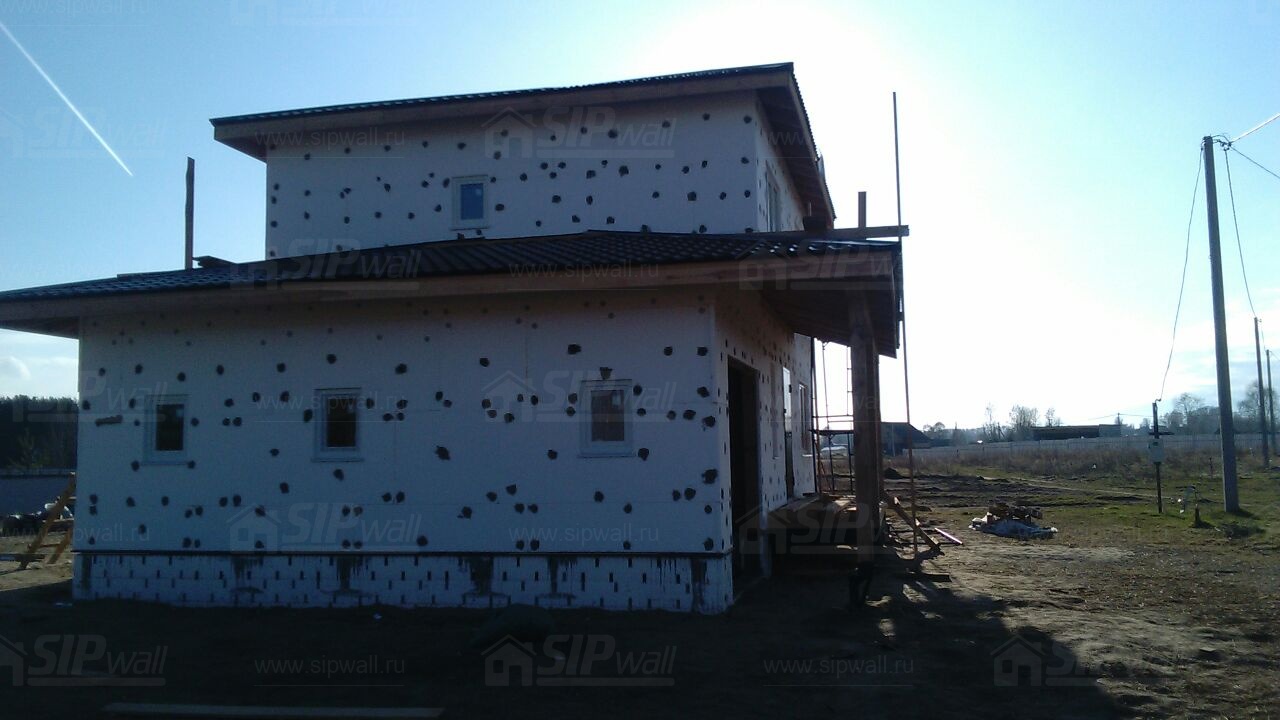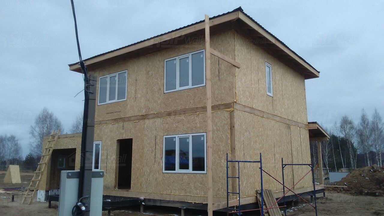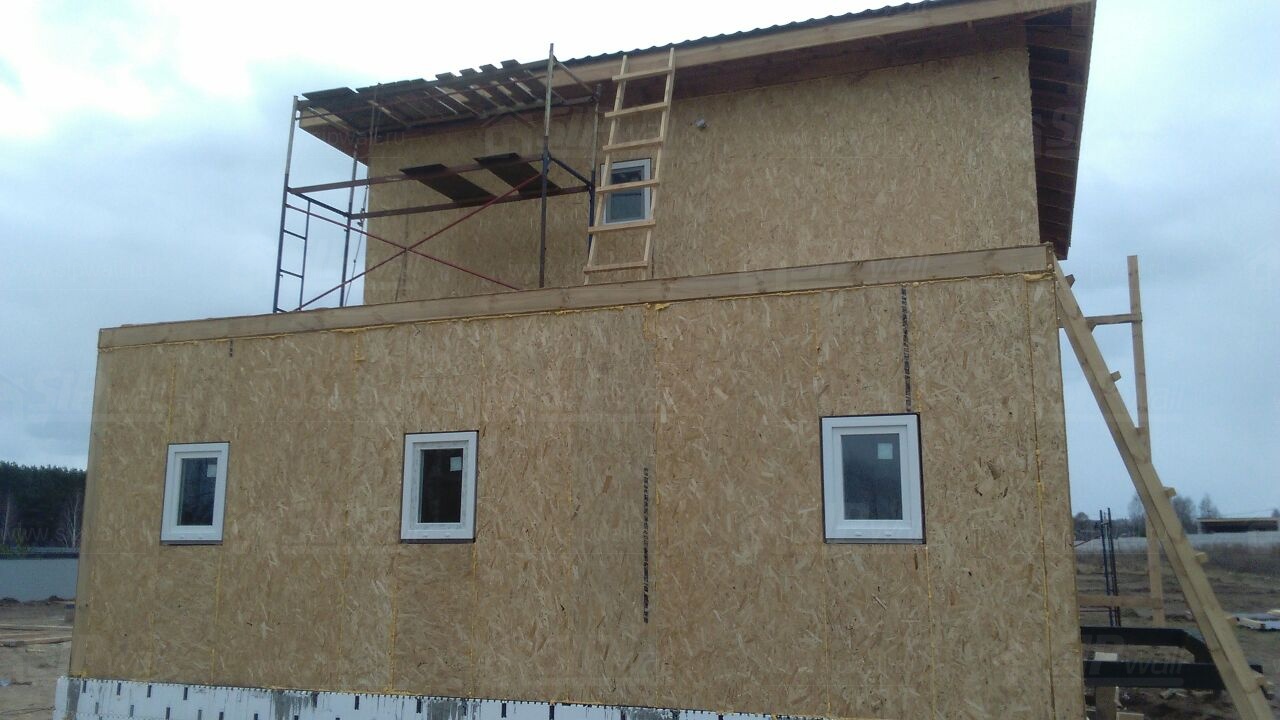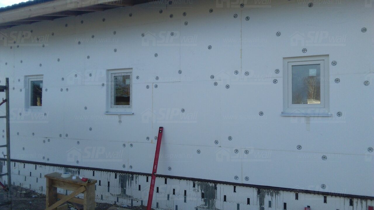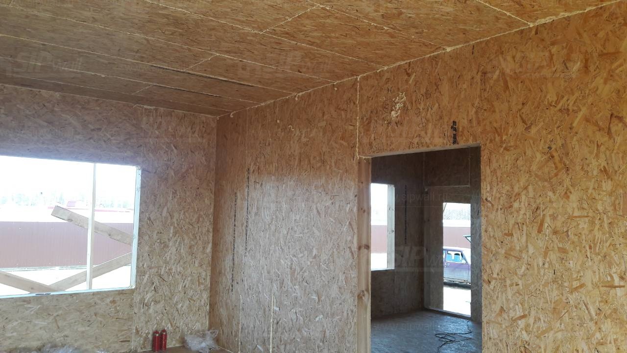 Все СИП панели SIPwall толщиной 224/174/124 мм (плиты OSB-3 толщиной 12 мм "Калевала" Россия и фасадный пенополистирол ПСБ-С 25 по ГОСТ 15588-14 толщиной 200/150/100 мм производства завода "PolarPlast", Россия) нарезаны и обрусованы сухим строганным брусом камерной сушки в соответствии с проектной документацией.