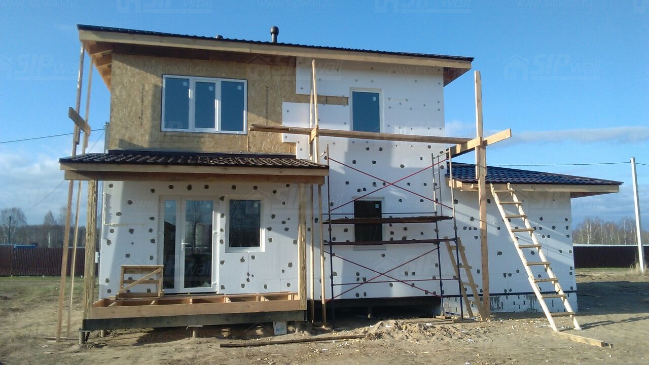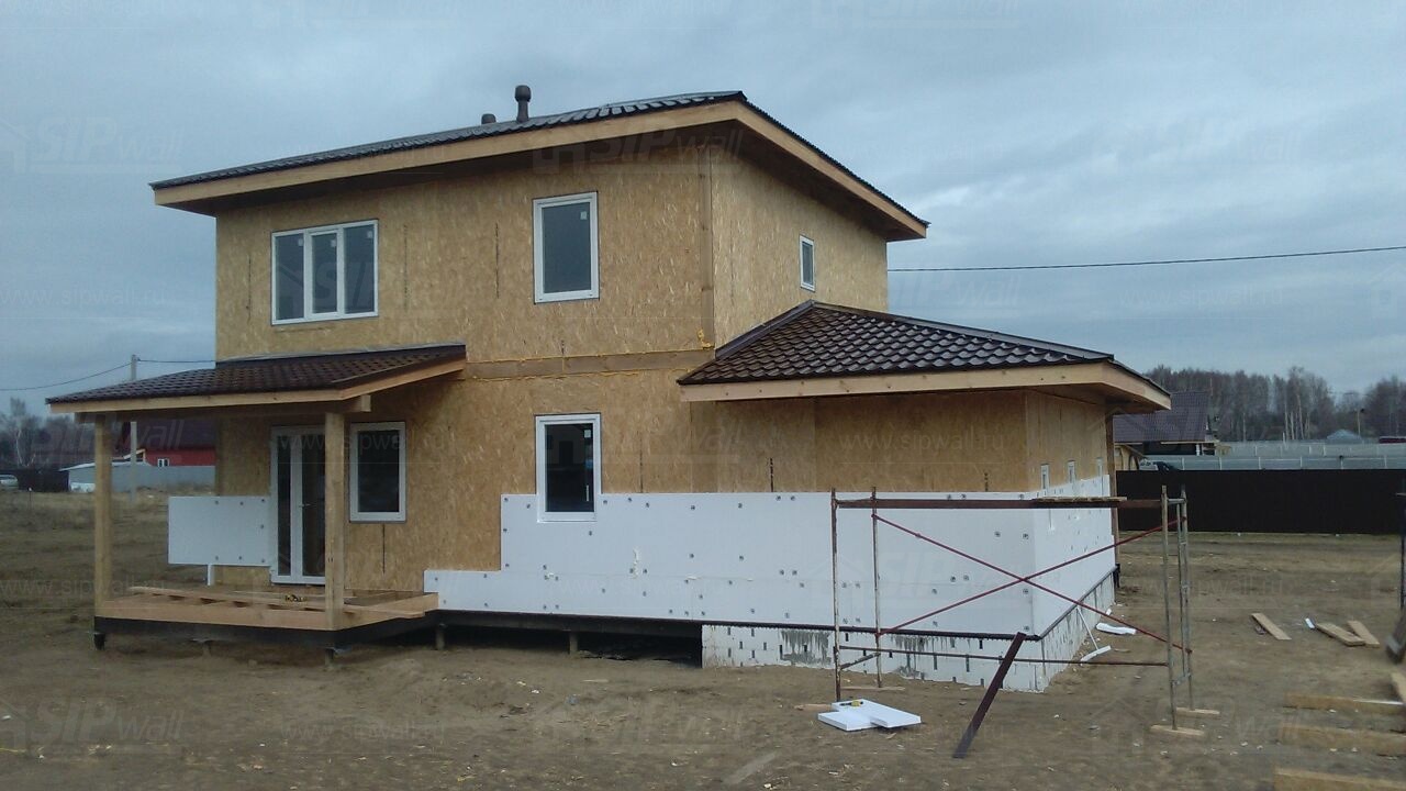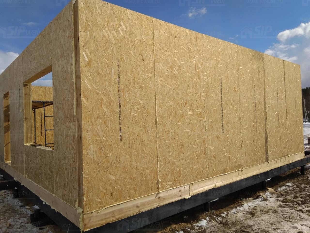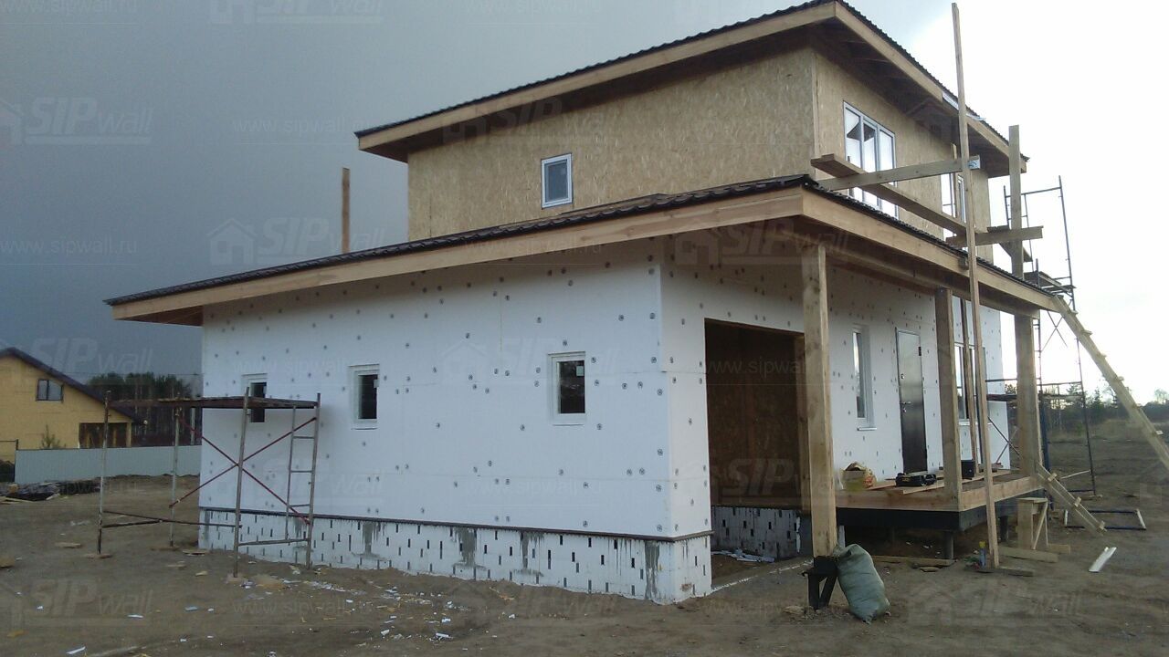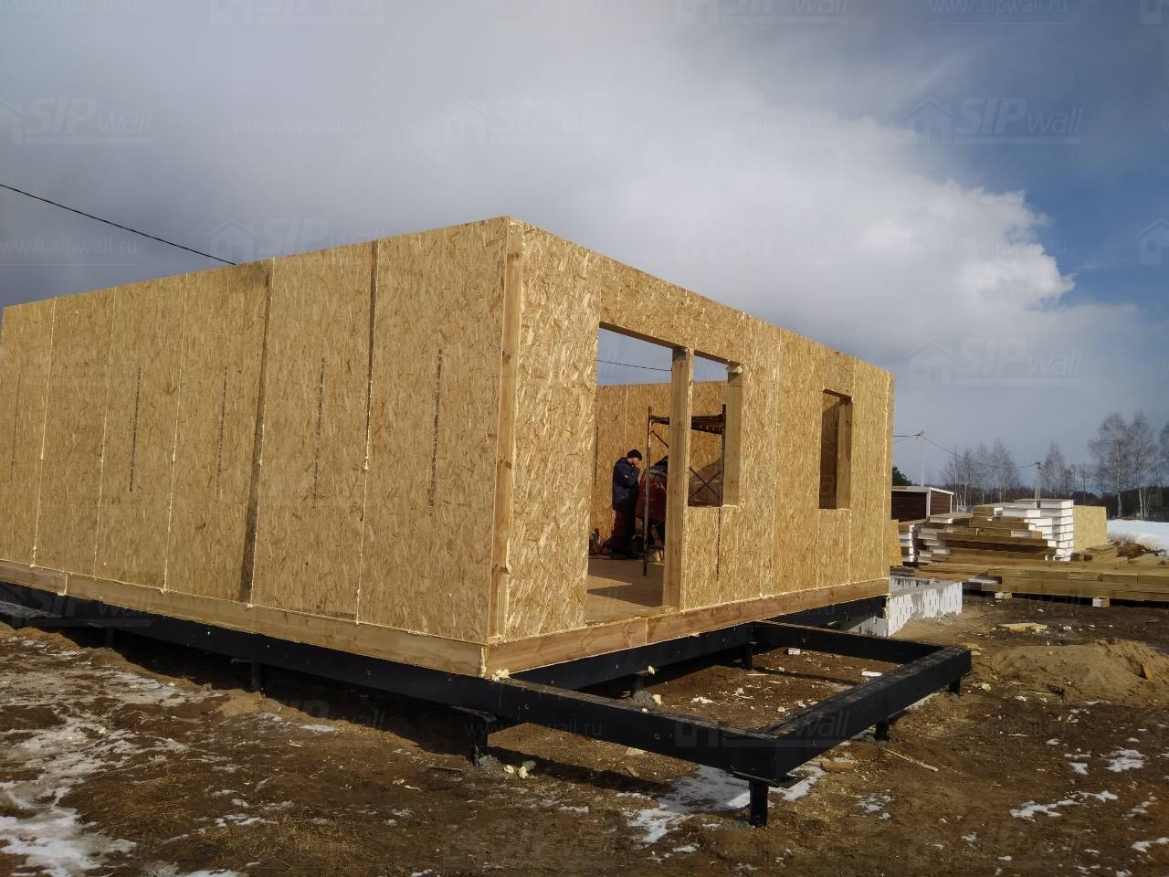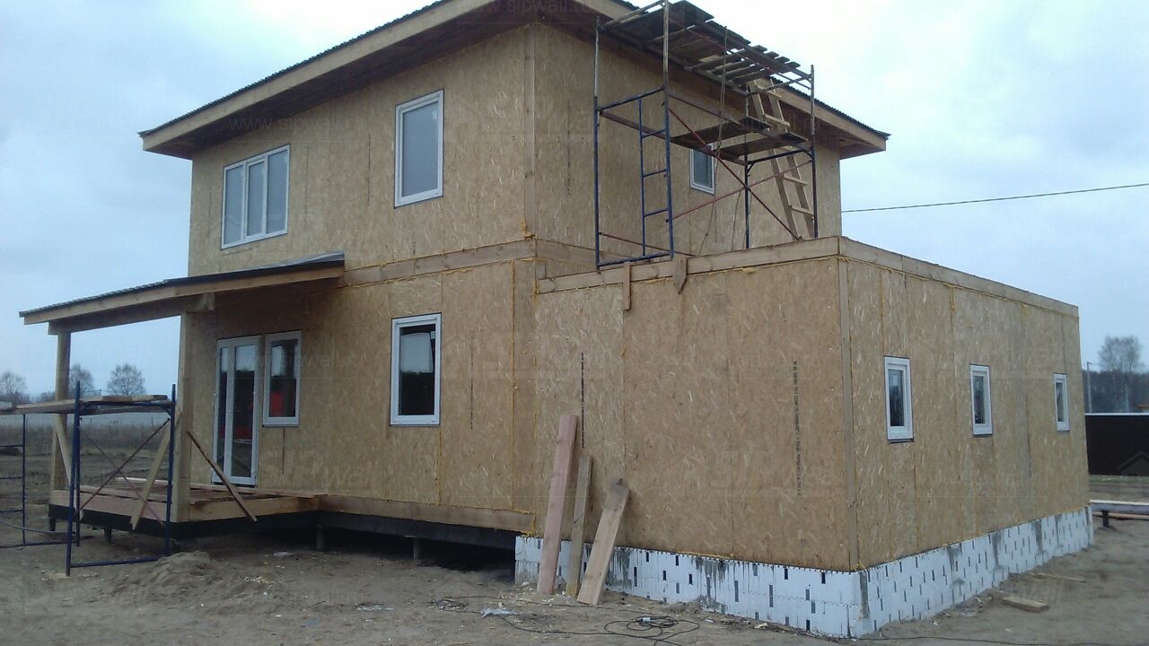 Все СИП панели SIPwall толщиной 224/174/124 мм (плиты OSB-3 толщиной 12 мм "Калевала" Россия и фасадный пенополистирол ПСБ-С 25 по ГОСТ 15588-14 толщиной 200/150/100 мм производства завода "PolarPlast", Россия) нарезаны и обрусованы сухим строганным брусом камерной сушки в соответствии с проектной документацией.