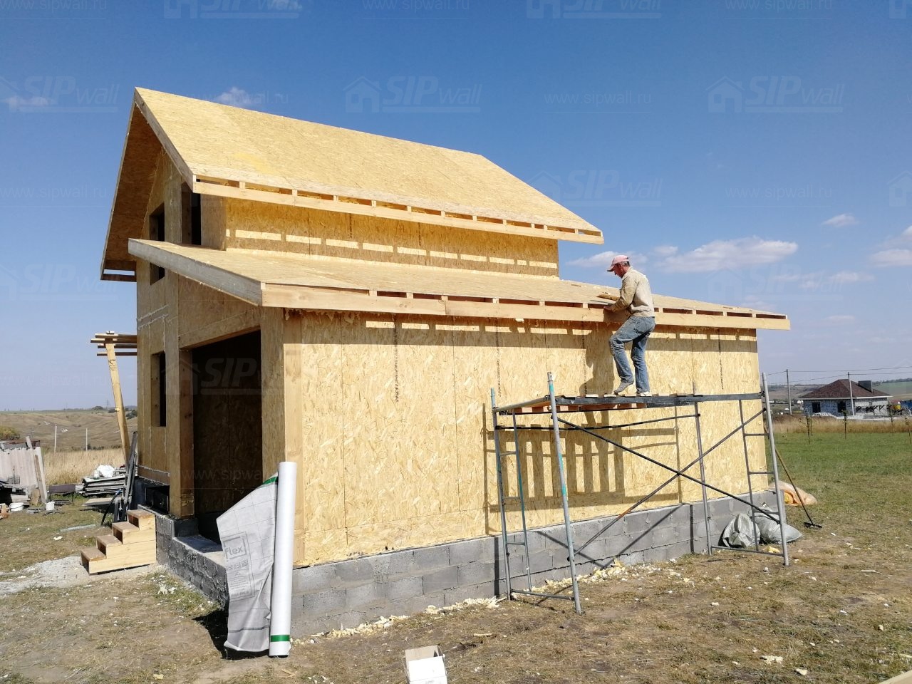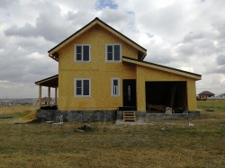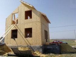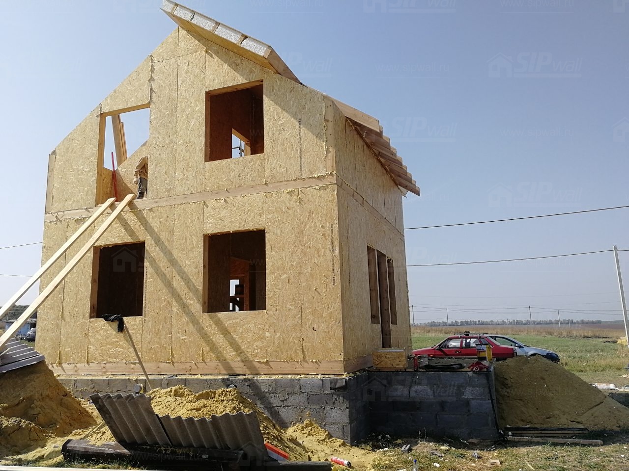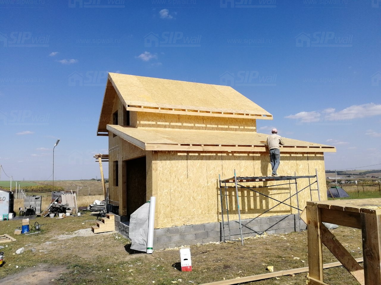 Комплектация домокомплекта: перекрытие на отметке +0.000 - СИП - 174У мм., несущие стены дома выполнены из СИП панелей 174 мм., внутренние несущие стены СИП - 174У мм и внутренние не несущие перегородки СИП - 124У мм. Межэтажное и чердачное перекрытие - СИП - 174У мм, Кровля - СИП - 224У мм..