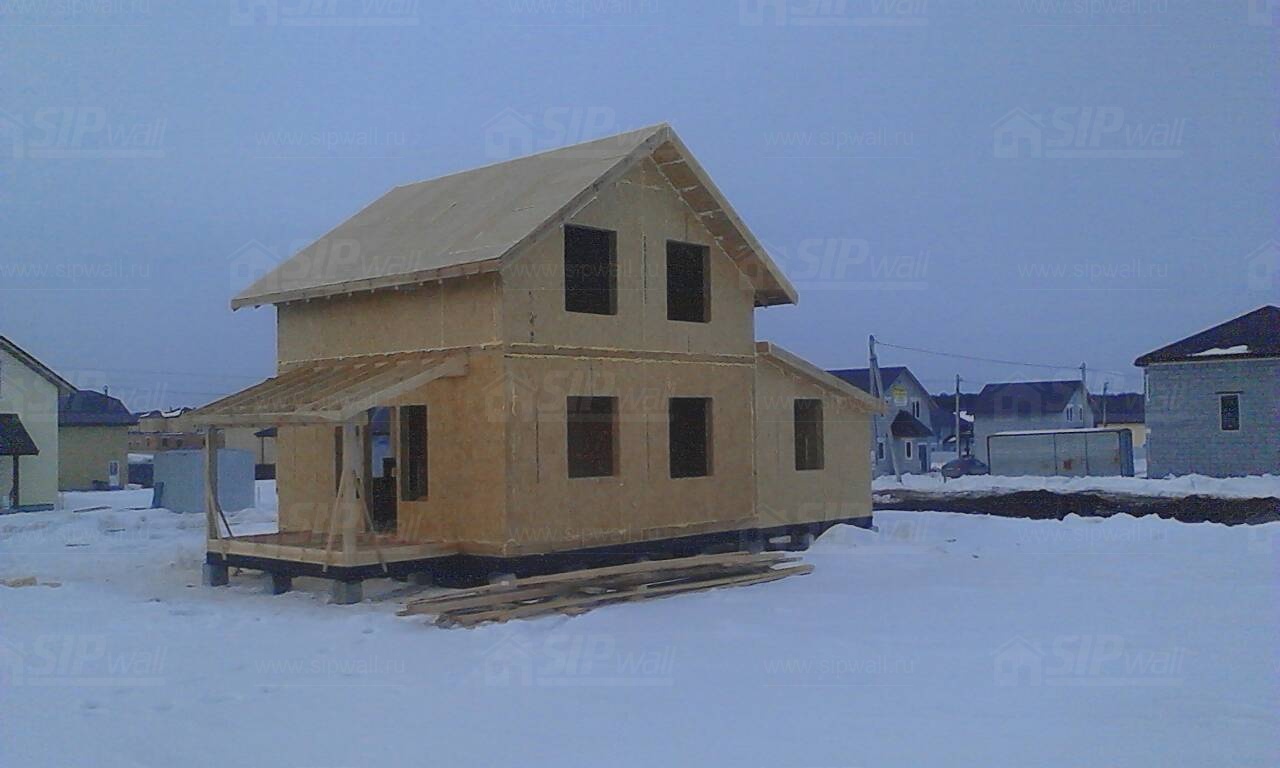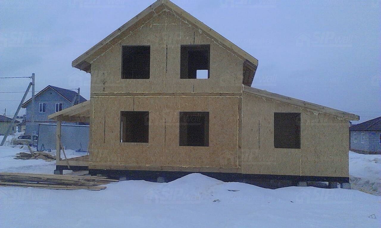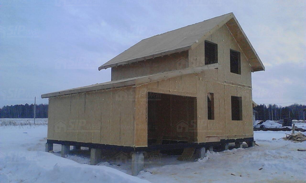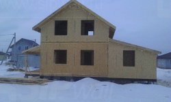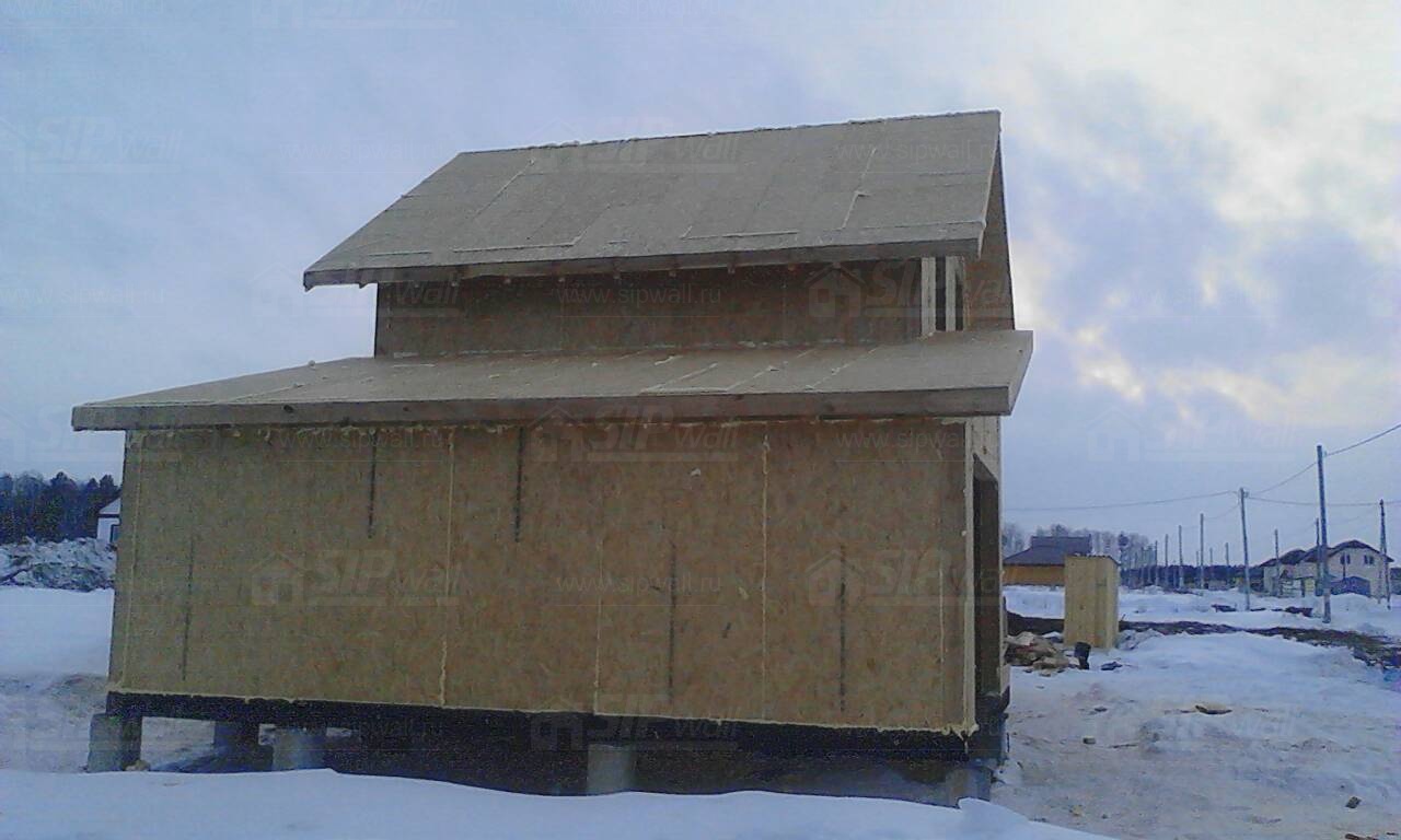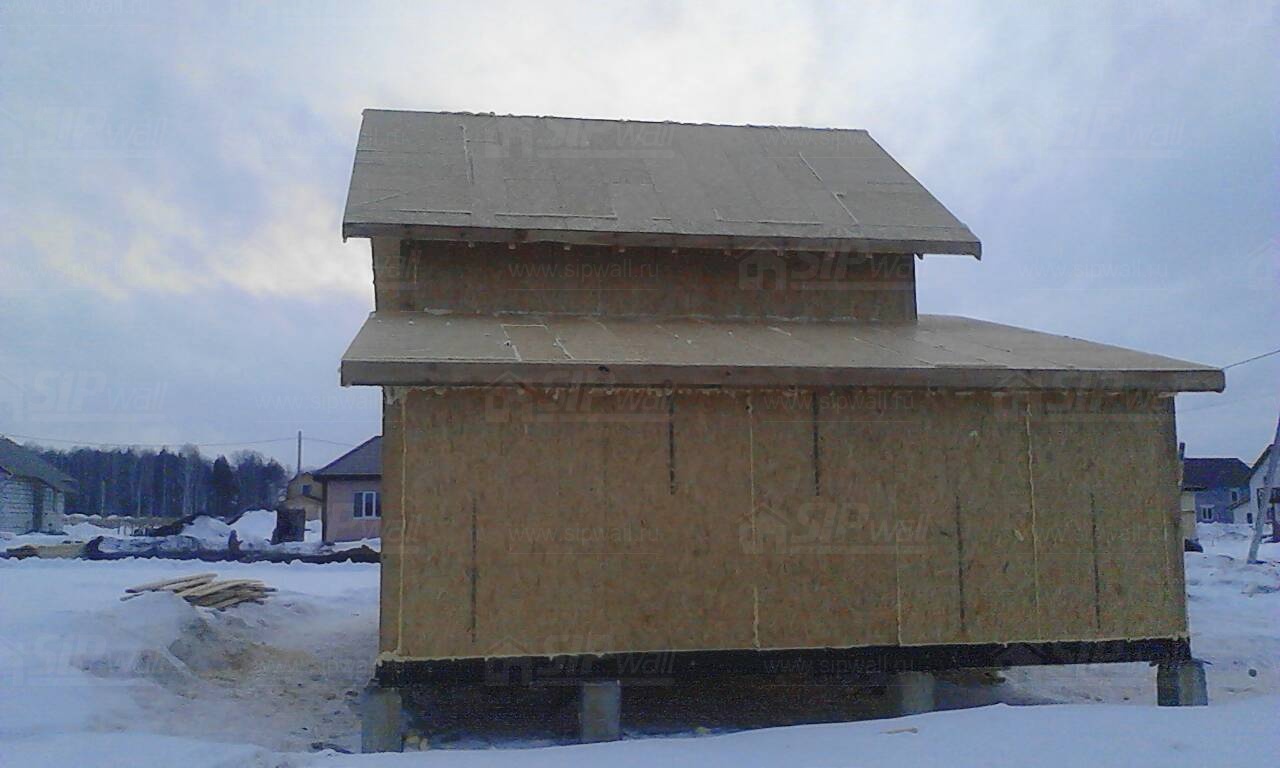 Комплектация домокомплекта: перекрытие на отметке +0.000 - СИП 224У мм., несущие стены дома выполнены из СИП панелей 174 мм., внутренние несущие стены выполнены из СИП панелей 174 мм. и внутренние не несущие перегородки выполнены из СИП панелей 124 мм.. Перекрытие межэтажное - выполнены из СИП панелей 174 мм.. Кровля выполнена из СИП 224У мм..