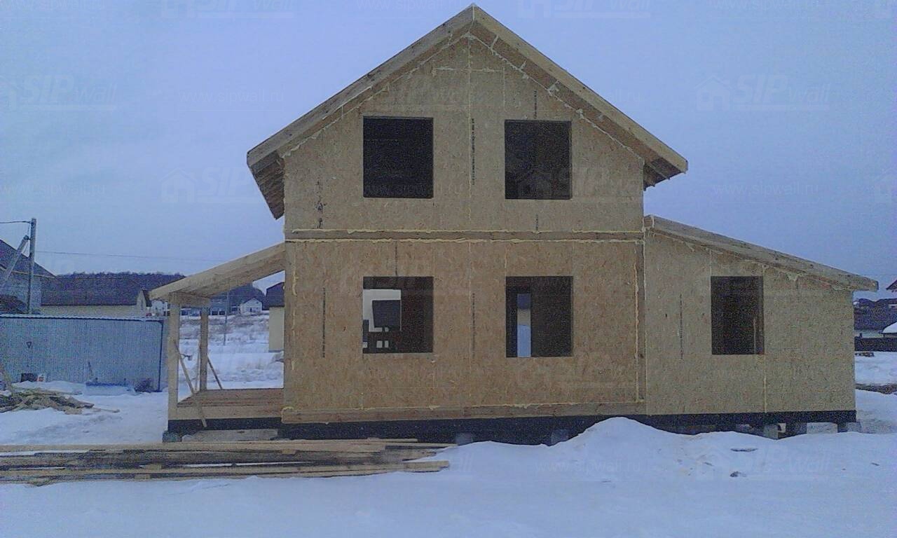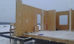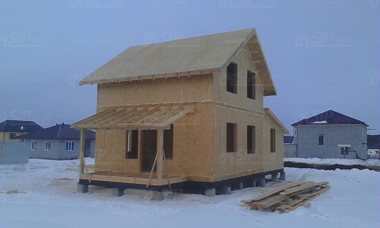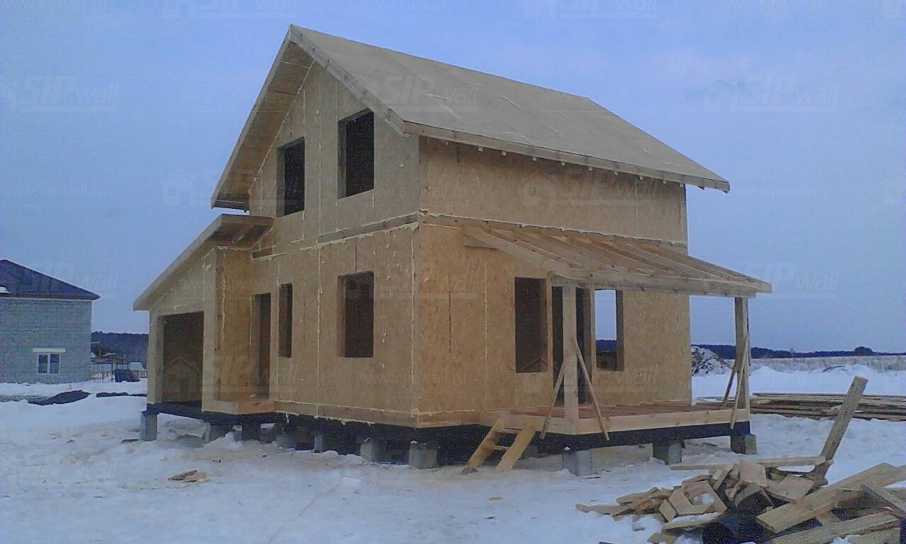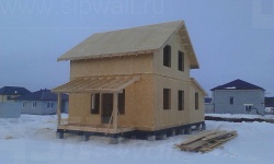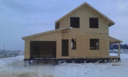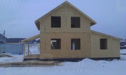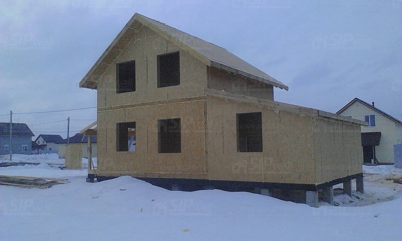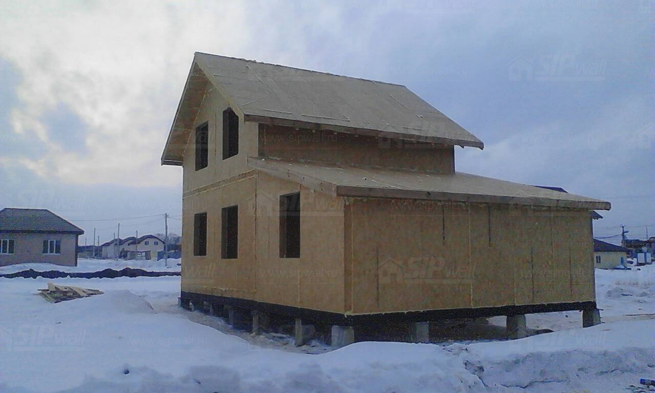 Комплектация домокомплекта: перекрытие на отметке +0.000 - СИП 224У мм., несущие стены дома выполнены из СИП панелей 174 мм., внутренние несущие стены выполнены из СИП панелей 174 мм. и внутренние не несущие перегородки выполнены из СИП панелей 124 мм.. Перекрытие межэтажное - выполнены из СИП панелей 174 мм.. Кровля выполнена из СИП 224У мм..