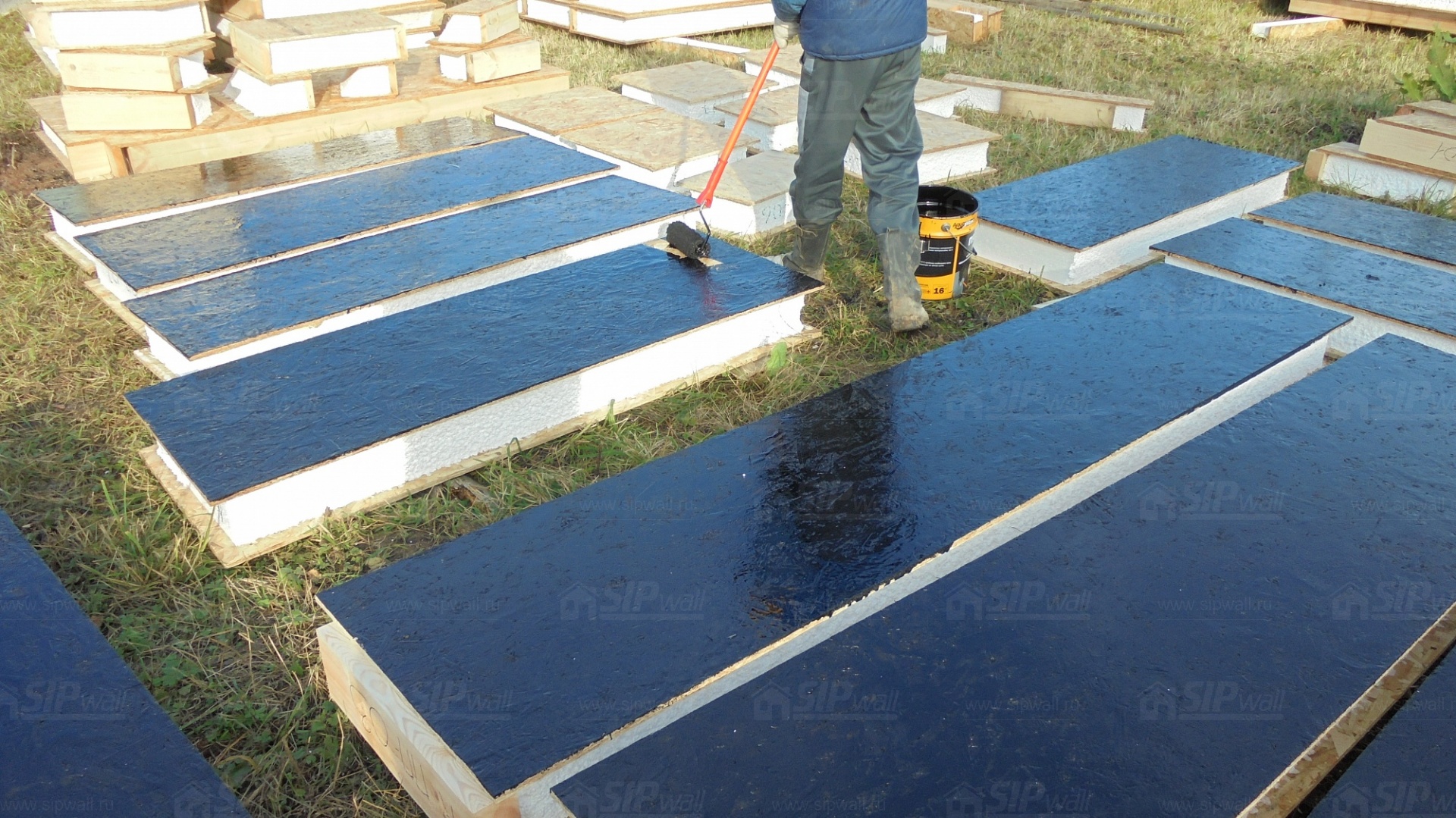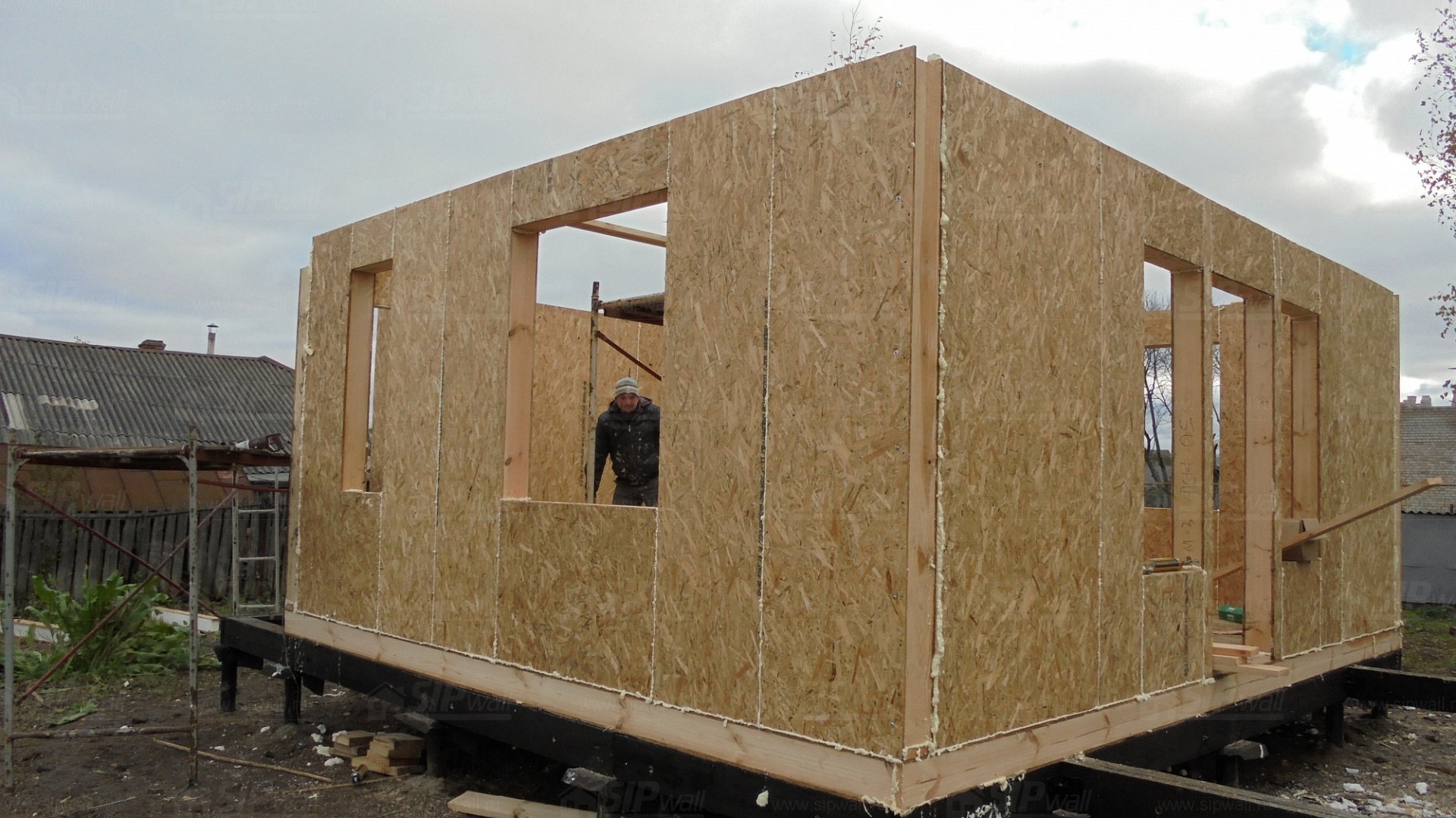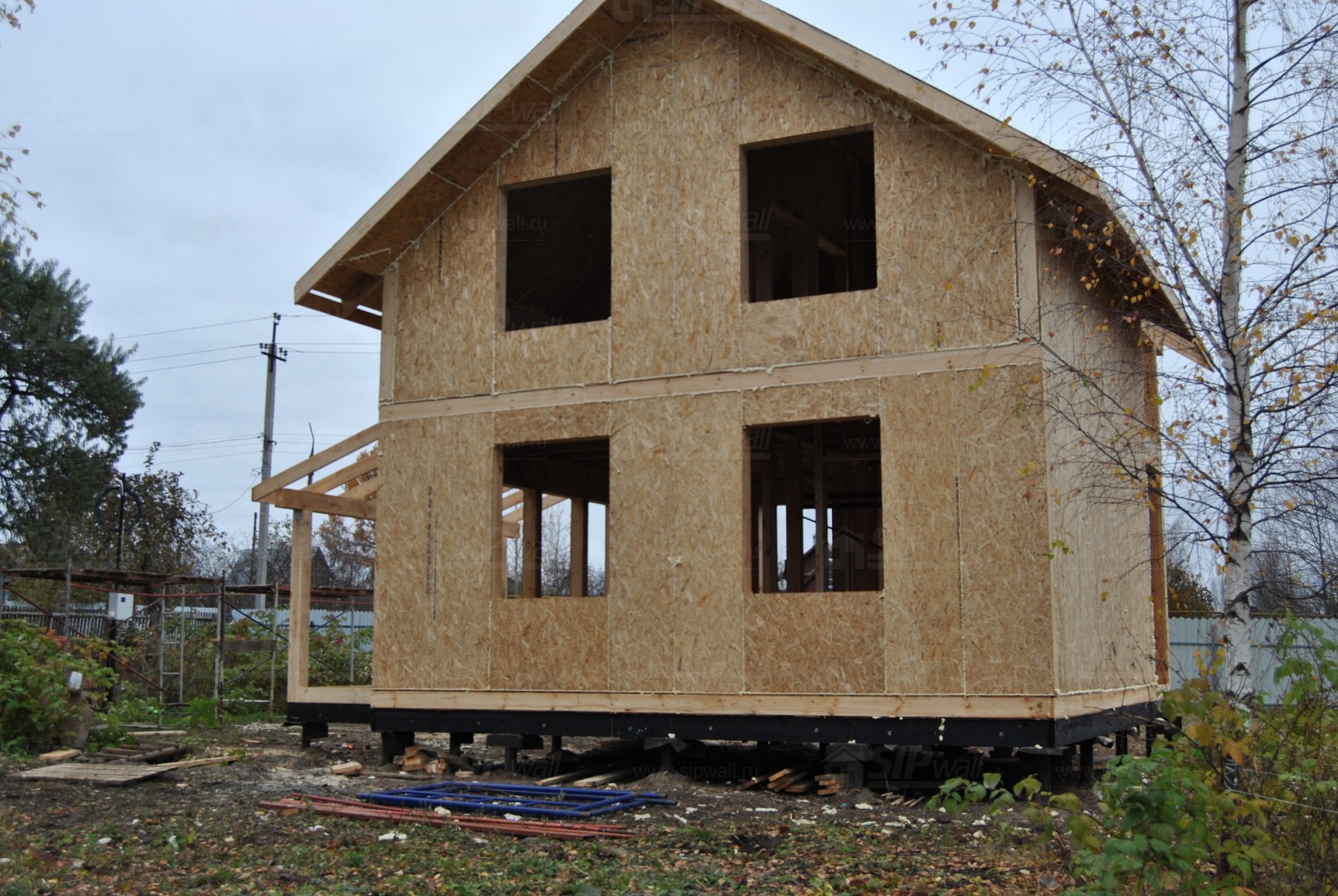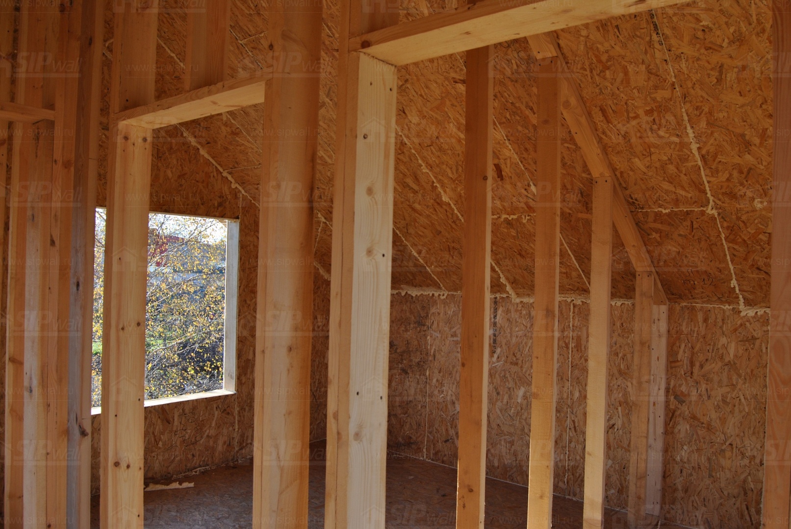 Все СИП панели SIPwall толщиной 224/174/124 мм (плиты OSB-3 толщиной 12 мм "Калевала" Россия и фасадный пенополистирол ПСБ-С 25 по ГОСТ 15588-14 толщиной 200/150/100 мм производства завода "PolarPlast", Россия) нарезаны и обрусованы сухим строганным брусом в соответствии с проектной документацией.