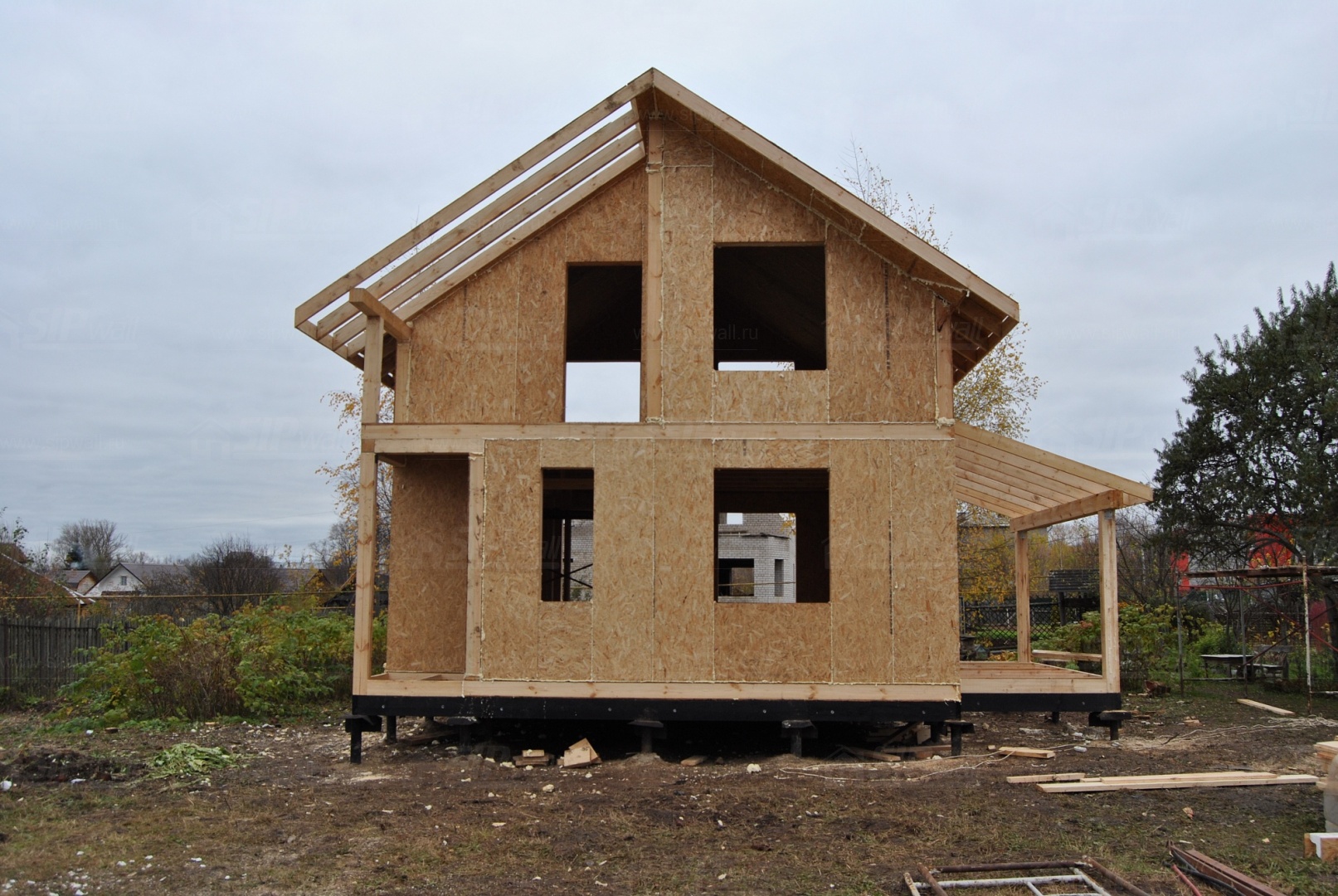 Комплектация домокомплекта: нулевое перекрытие -выполнены из СИП панелей 174 мм, несущие стены дома выполнены из СИП панелей 174 мм., внутренние несущие стены и внутренние не несущие перегородки выполнены по каркасной технологии. Перекрытие межэтажное - выполнено по каркасной технологии с настилом из OSB-3 толщиной 22 мм. Кровля - из СИП панелей - 174 мм производства компании СИПВОЛЛ.
