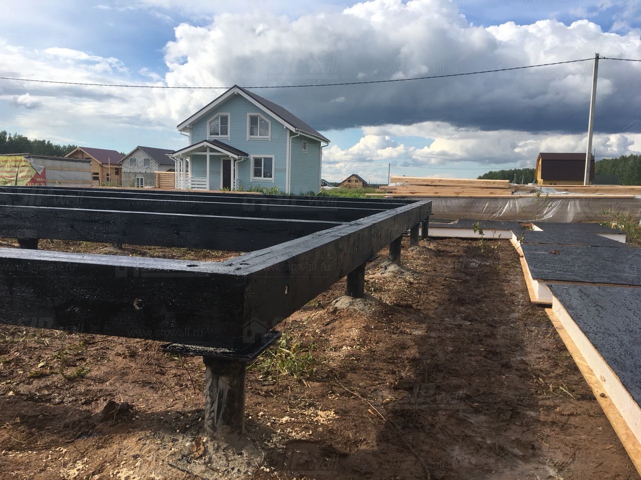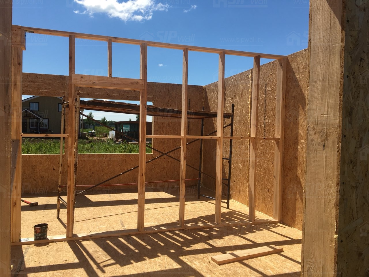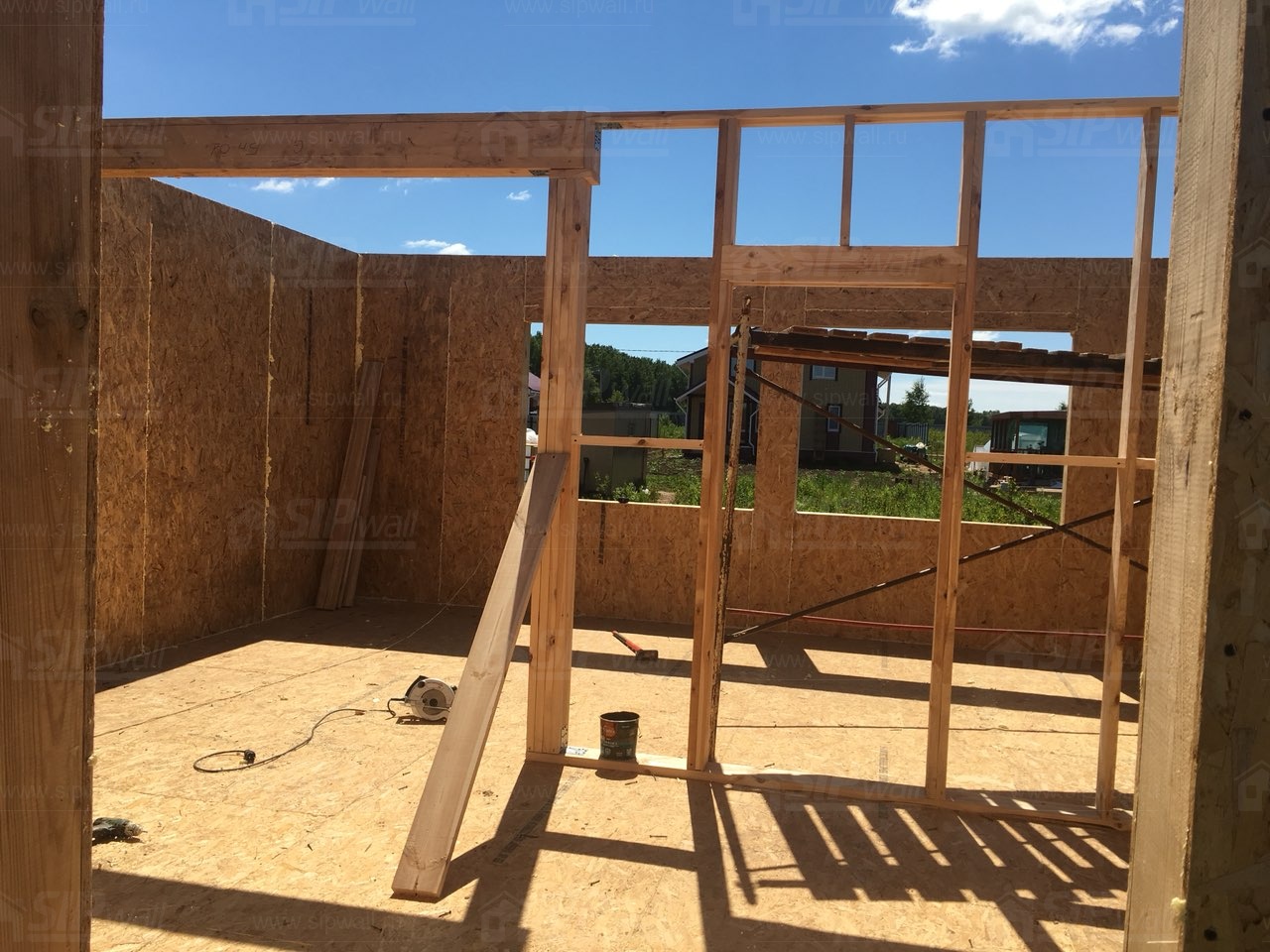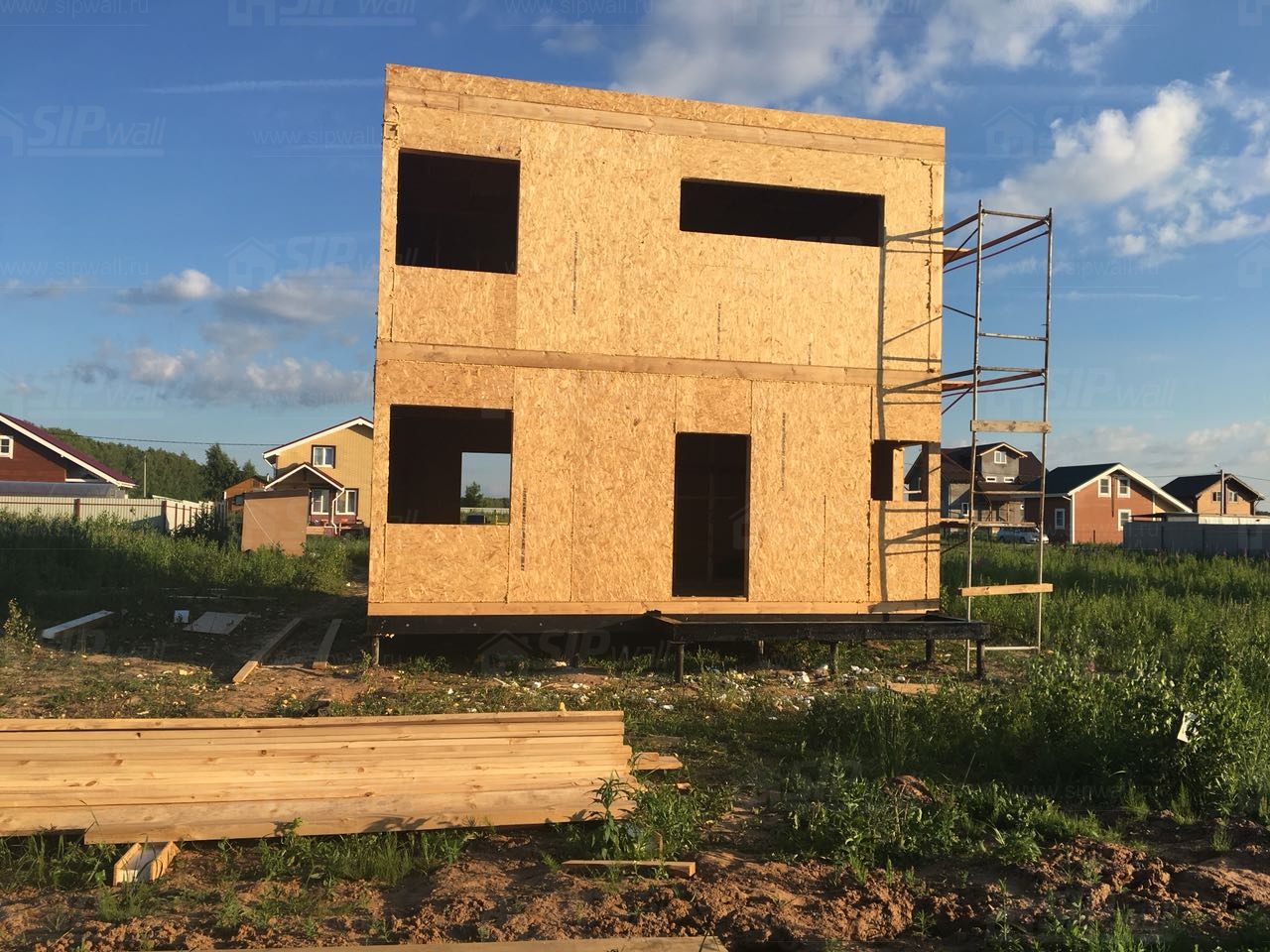 Все СИП панели SIPwall толщиной 224/174/124 мм (плиты OSB-3 толщиной 12 мм "Калевала" Россия и фасадный пенополистирол ПСБ-С 25 по ГОСТ 15588-14 толщиной 200/150/100 мм производства завода "PolarPlast", Россия) нарезаны и обрусованы сухим строганным брусом камерной сушки в соответствии с проектной документацией.