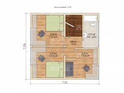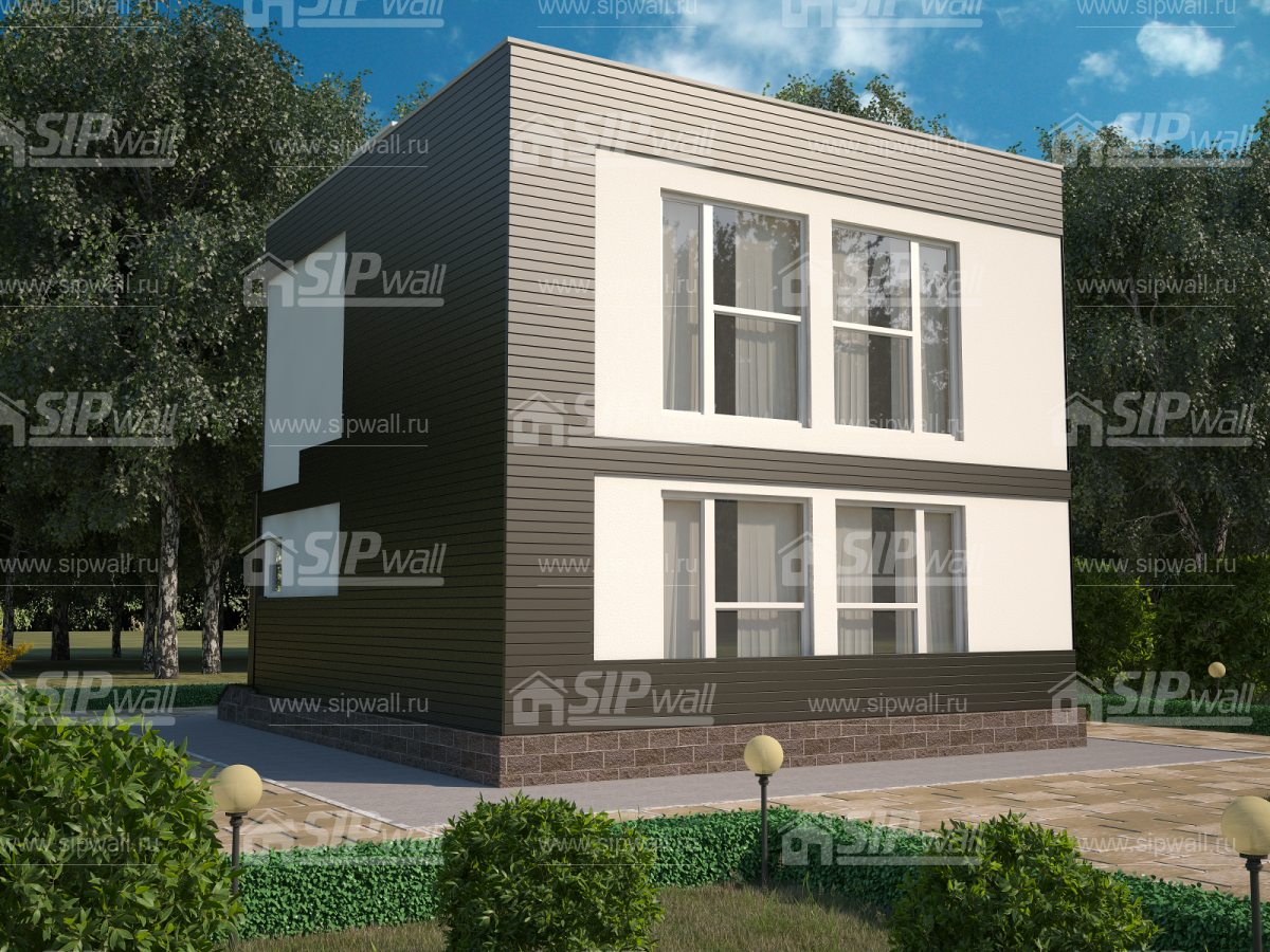 Комплектация домокомплекта: перекрытие на отметке +0.000 - СИП 174 мм., несущие стены дома выполнены из СИП панелей 174 мм., внутренние несущие стены выполнены из СИП панелей 174 мм, и внутренние не несущие перегородки выполнены из СИП панелей 124 мм. Межэтажное перекрытие - СИП панели 224У мм. Кровля - СИП панели 224У мм.
