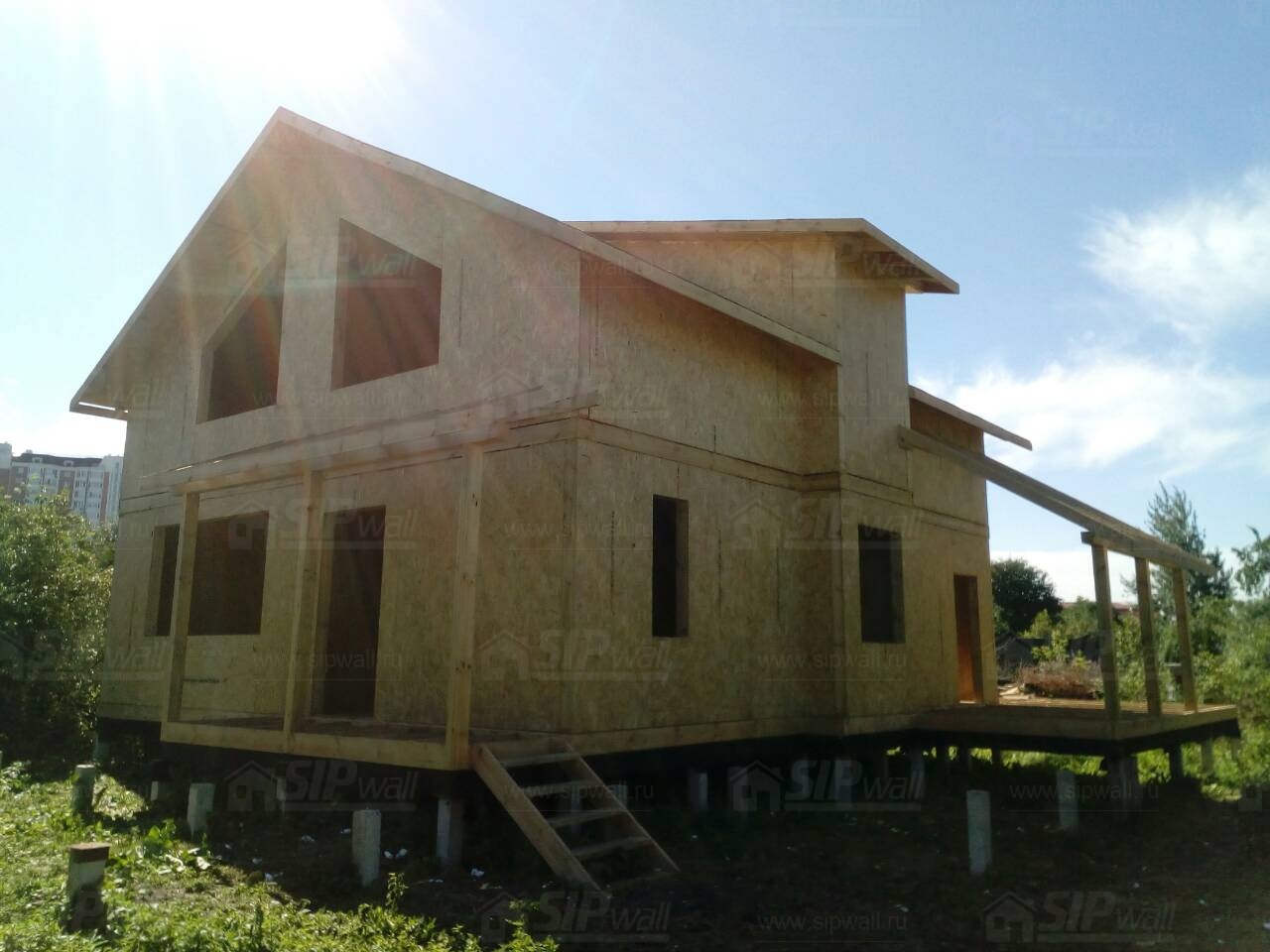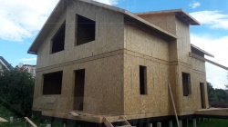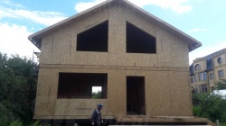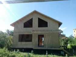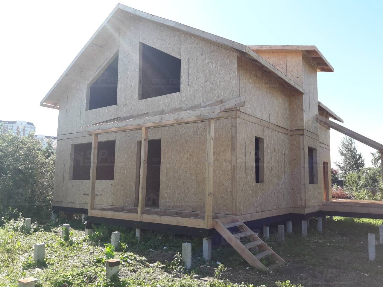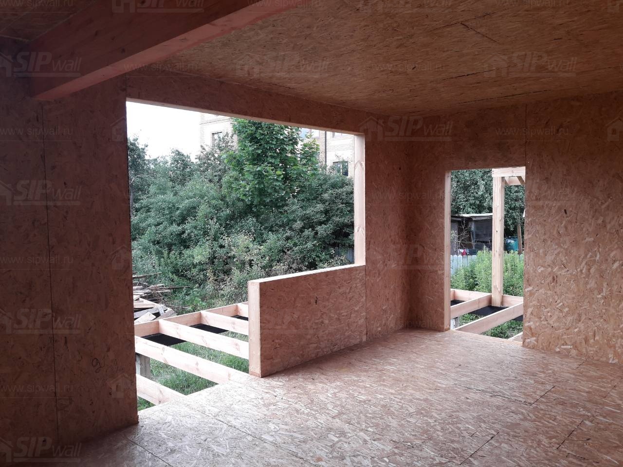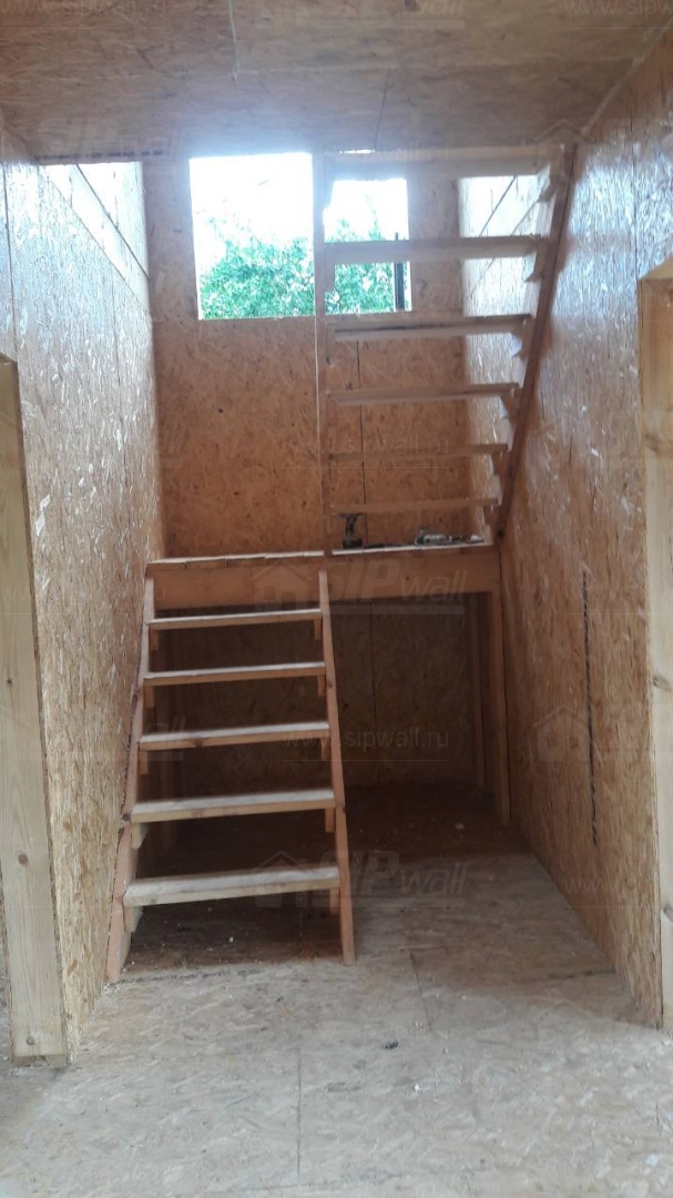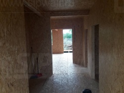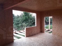 Комплектация домокомплекта: перекрытие на отметке +0.000 - СИП - 224У мм., несущие стены дома выполнены из СИП панелей 174 мм., внутренние несущие стены выполнены из СИП панелей 174 мм., внутренние не несущие перегородки выполнены из СИП панелей 124 мм.. Перекрытие межэтажное - выполнено из СИП панелей 224У мм. Кровля - выполнена из СИП панелей 174У мм.