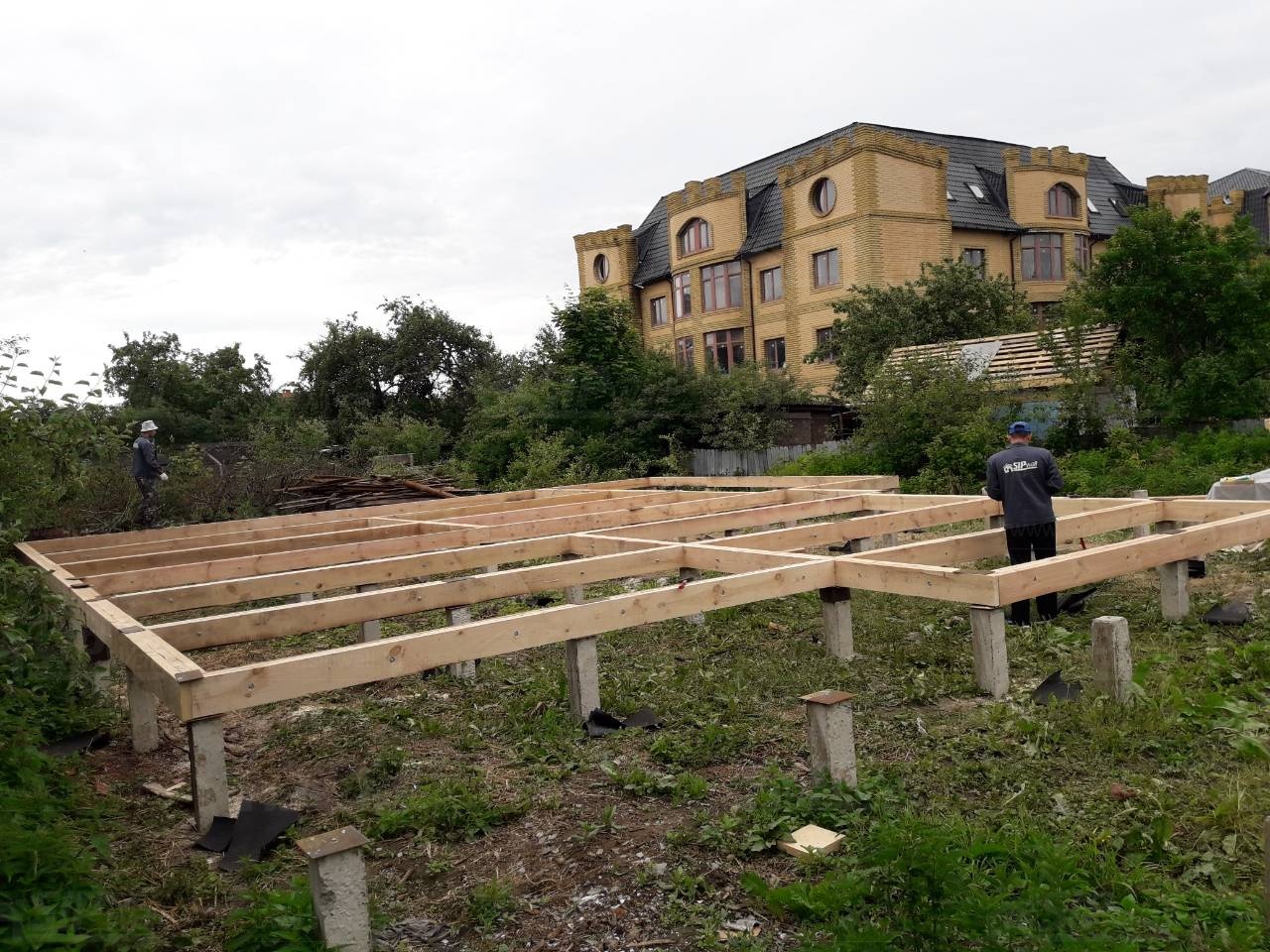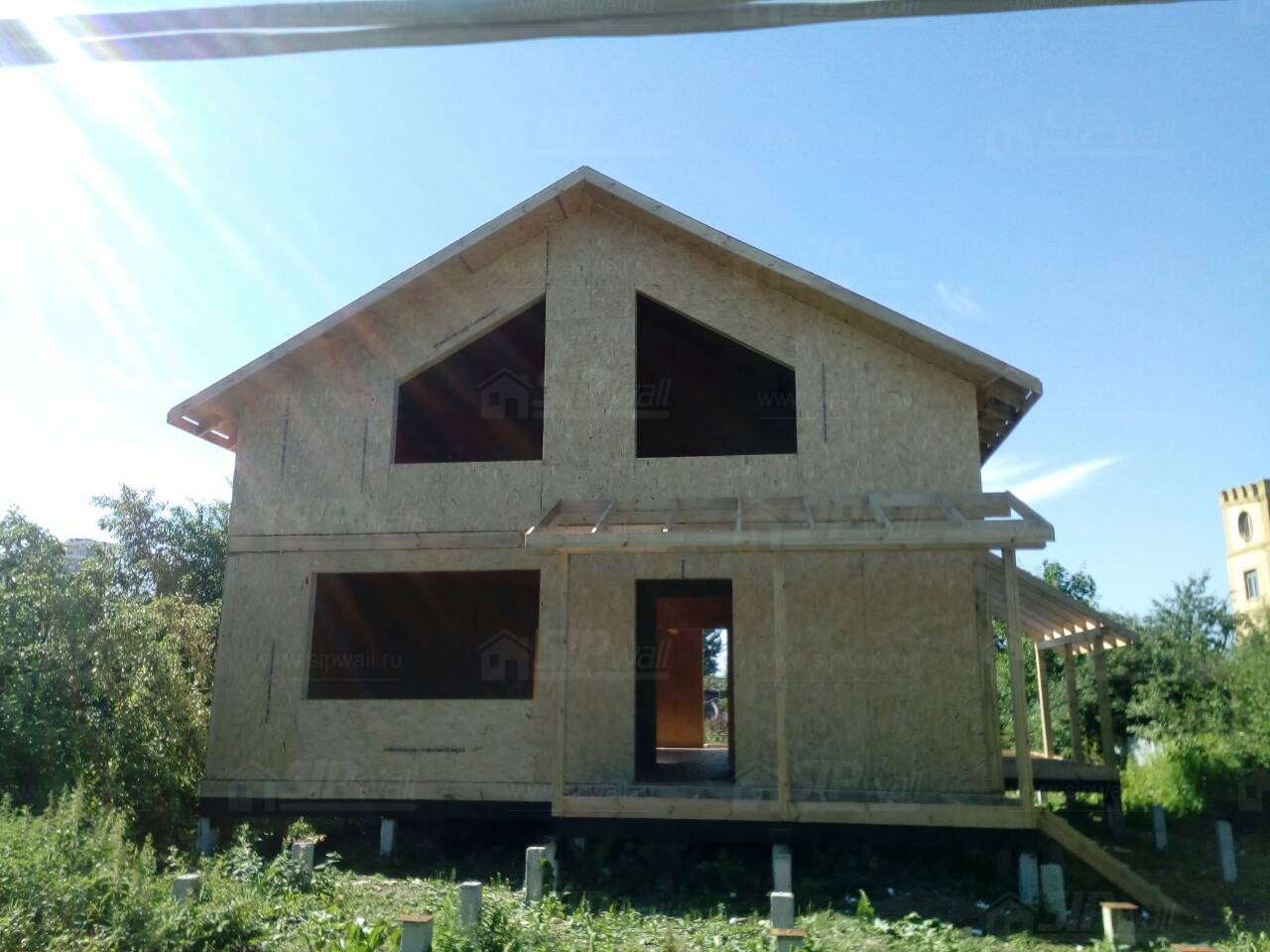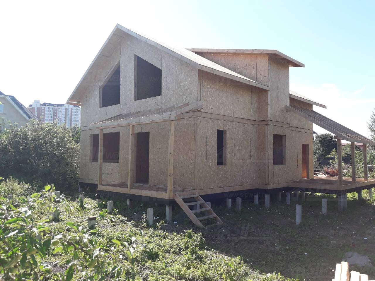 Комплектация домокомплекта: перекрытие на отметке +0.000 - СИП - 224У мм., несущие стены дома выполнены из СИП панелей 174 мм., внутренние несущие стены выполнены из СИП панелей 174 мм., внутренние не несущие перегородки выполнены из СИП панелей 124 мм.. Перекрытие межэтажное - выполнено из СИП панелей 224У мм. Кровля - выполнена из СИП панелей 174У мм.