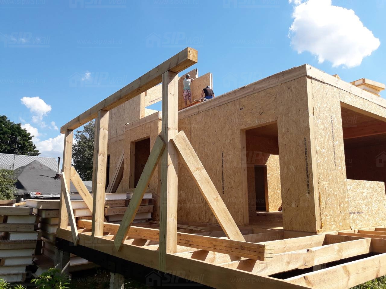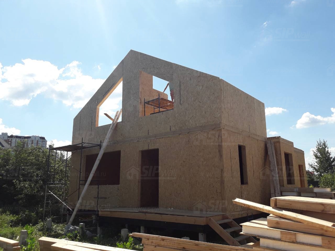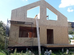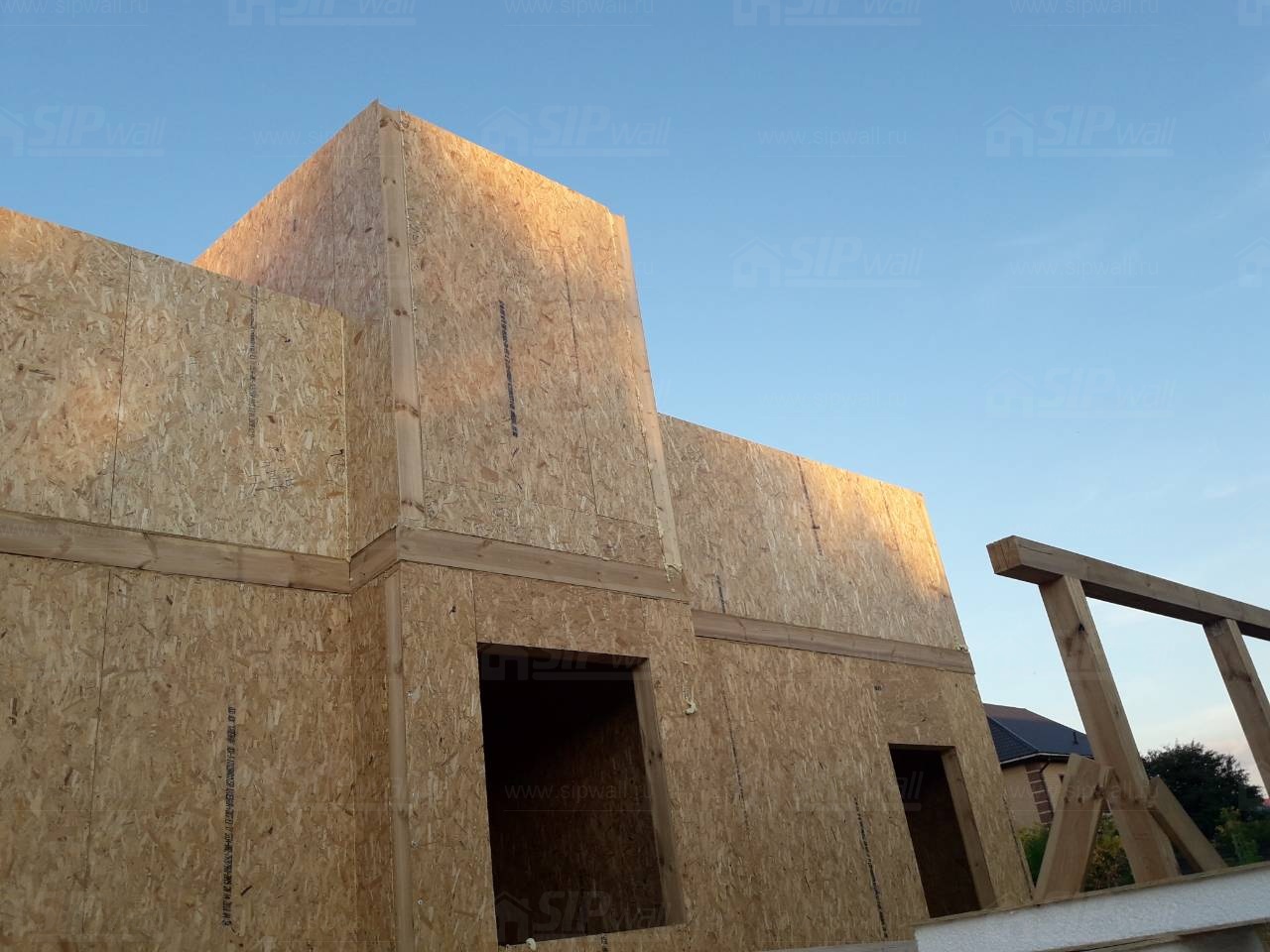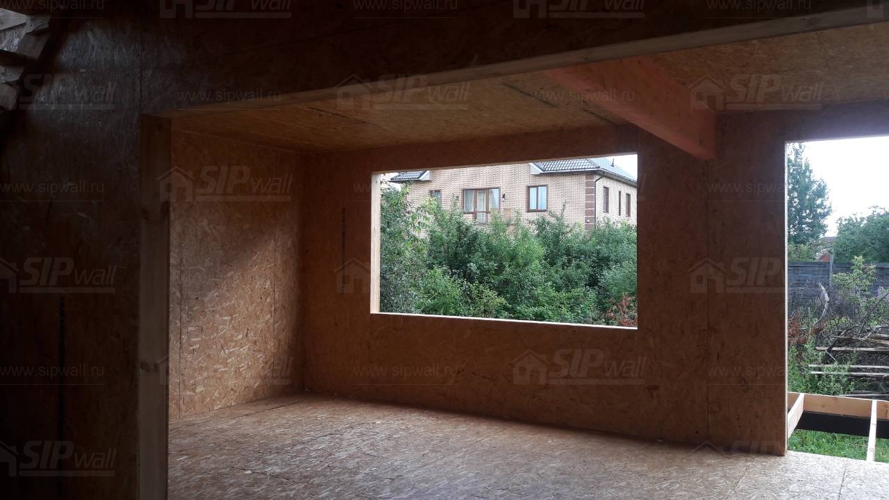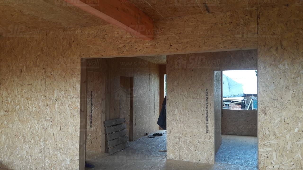 Все СИП панели SIPwall толщиной 224/174/124 мм (плиты OSB-3 толщиной 12 мм "Калевала" Россия и фасадный пенополистирол ПСБ-С 25 по ГОСТ 15588-14 толщиной 200/150/100 мм производства завода "PolarPlast", Россия) нарезаны и обрусованы сухим строганным брусом камерной сушки в соответствии с проектной документацией.