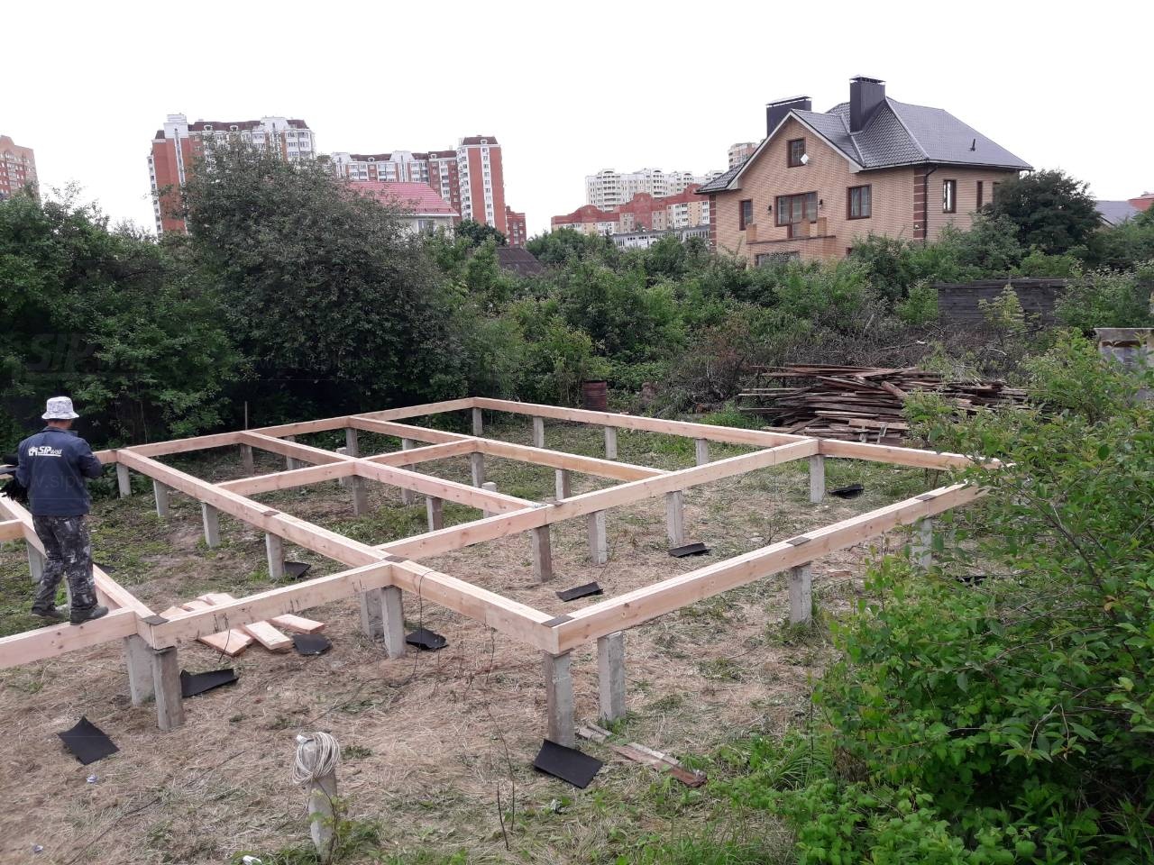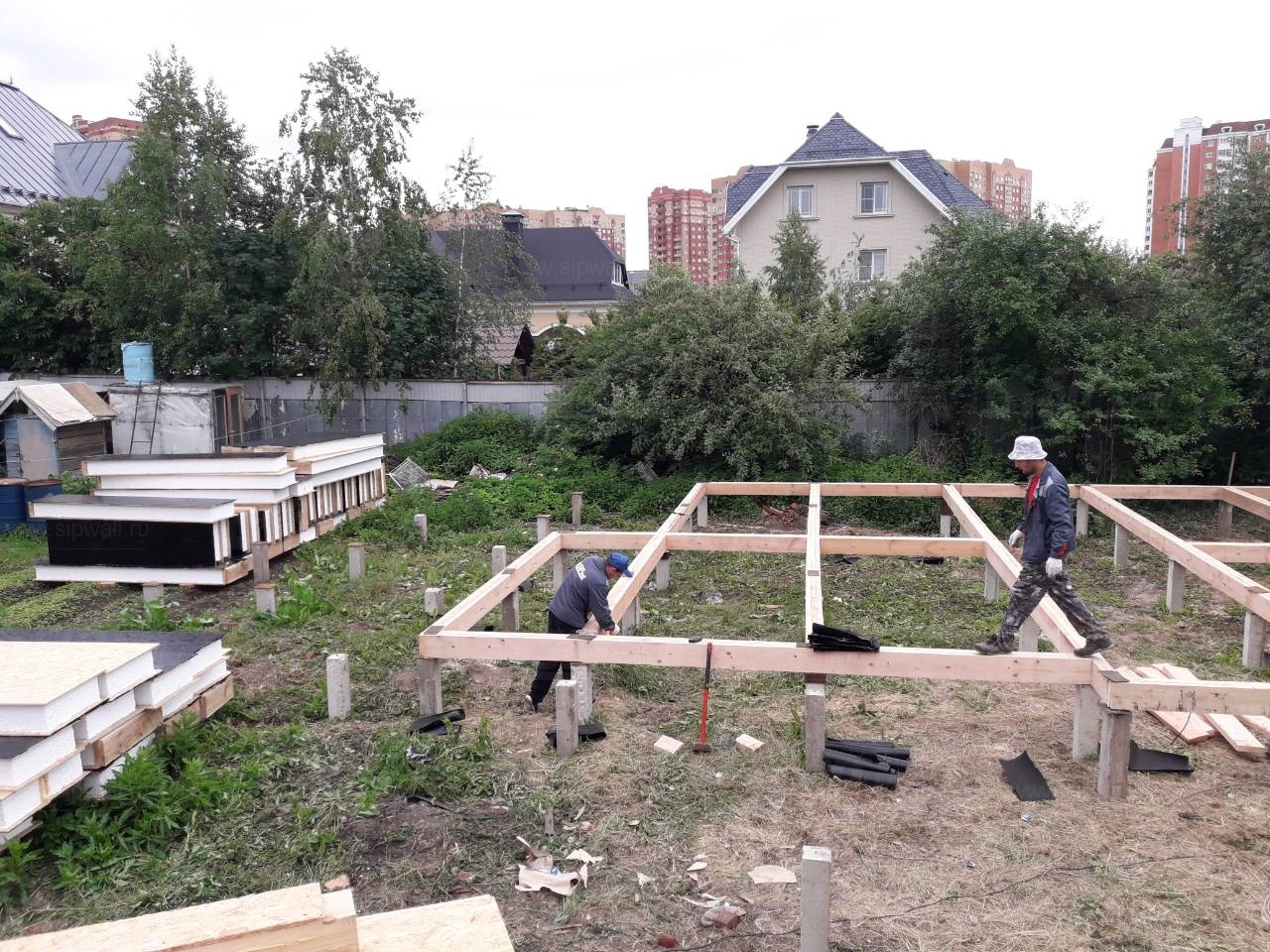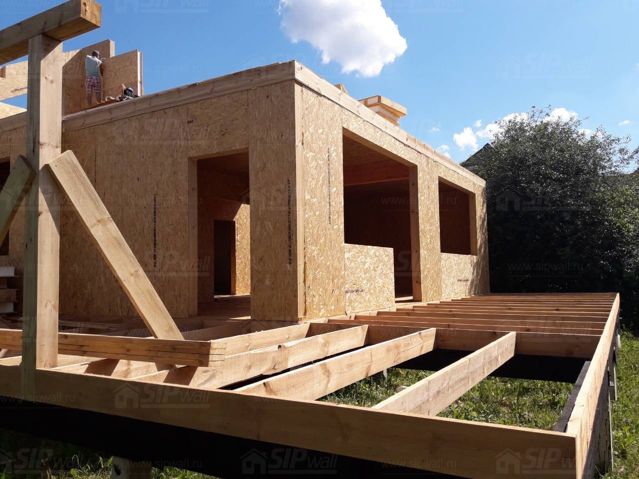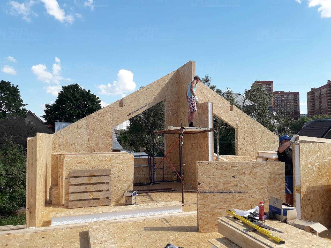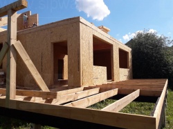 Все СИП панели SIPwall толщиной 224/174/124 мм (плиты OSB-3 толщиной 12 мм "Калевала" Россия и фасадный пенополистирол ПСБ-С 25 по ГОСТ 15588-14 толщиной 200/150/100 мм производства завода "PolarPlast", Россия) нарезаны и обрусованы сухим строганным брусом камерной сушки в соответствии с проектной документацией.