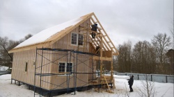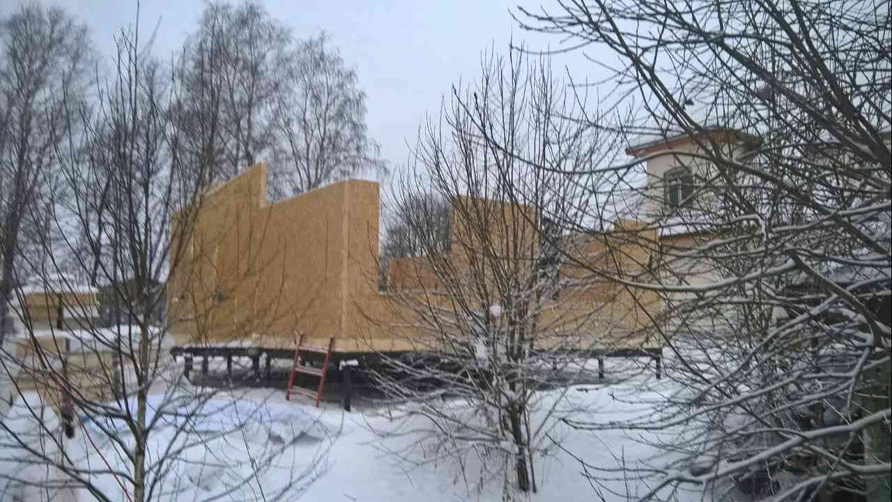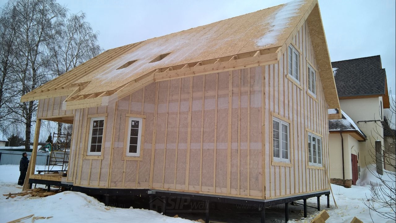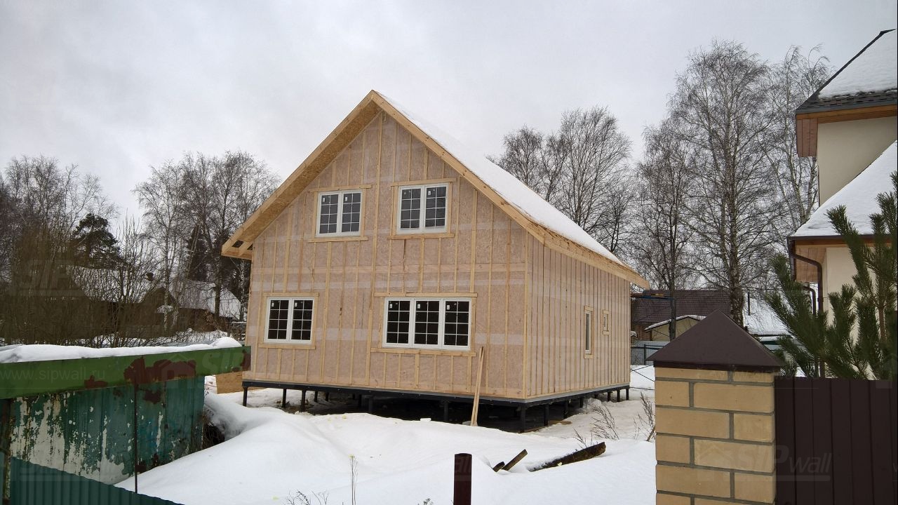 Все СИП панели SIPwall толщиной 224/174/124 мм (плиты OSB-3 толщиной 12 мм "Калевала" Россия и фасадный пенополистирол ПСБ-С 25 по ГОСТ 15588-14 толщиной 200/150/100 мм производства завода "PolarPlast", Россия) нарезаны и обрусованы сухим строганным брусом в соответствии с проектной документацией.