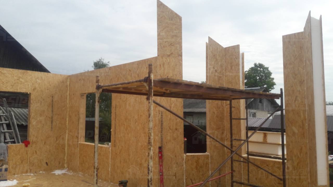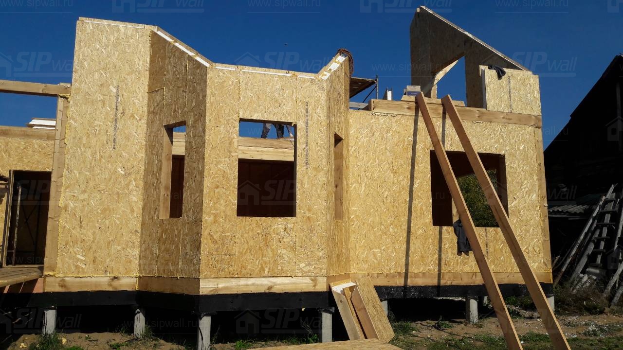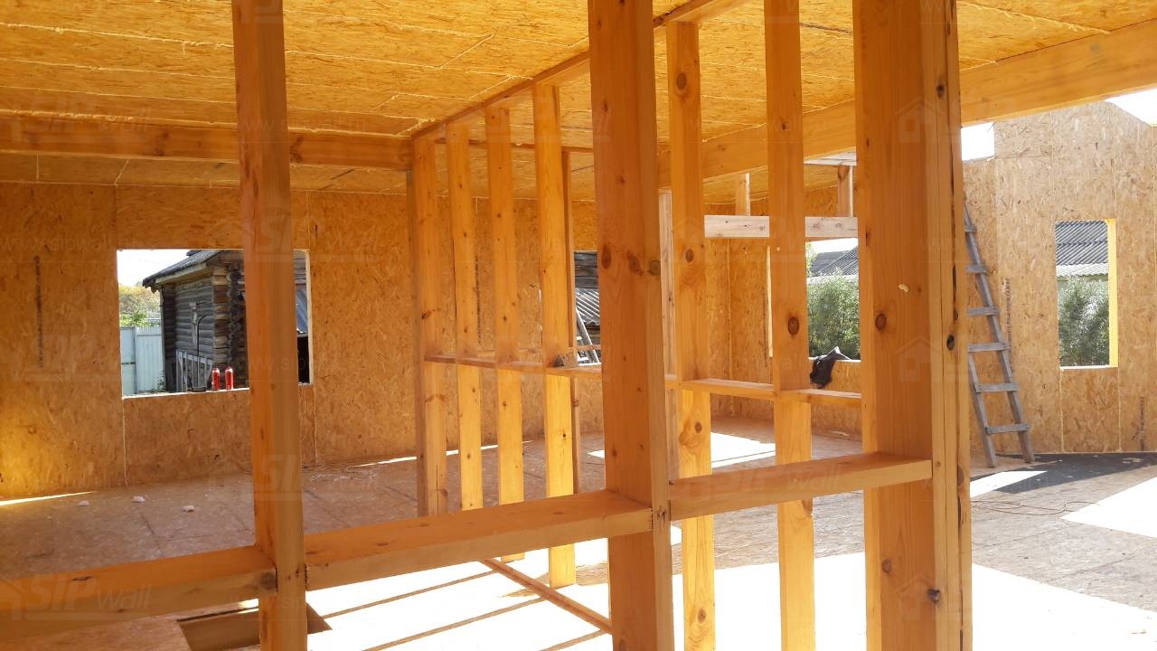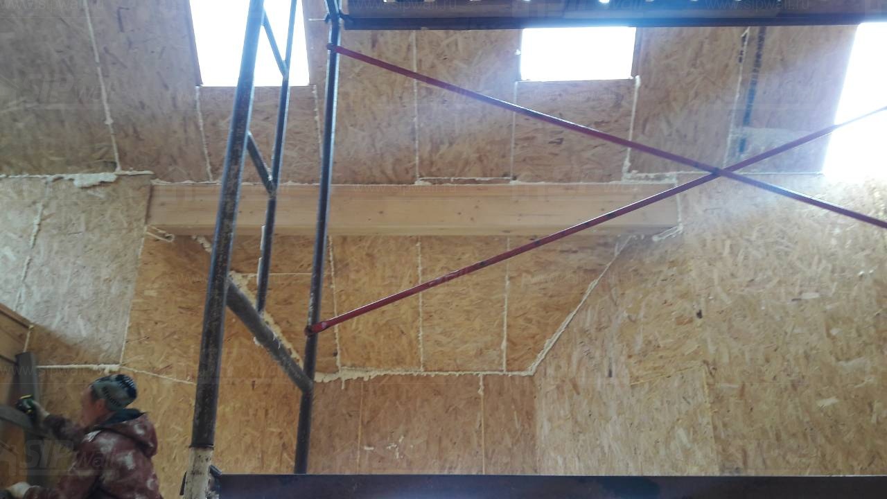 Все СИП панели SIPwall толщиной 224/174/124 мм (плиты OSB-3 толщиной 12 мм "Калевала" Россия и фасадный пенополистирол ПСБ-С 25 по ГОСТ 15588-14 толщиной 200/150/100 мм производства завода "PolarPlast", Россия) нарезаны и обрусованы сухим строганным брусом камерной сушки в соответствии с проектной документацией.
