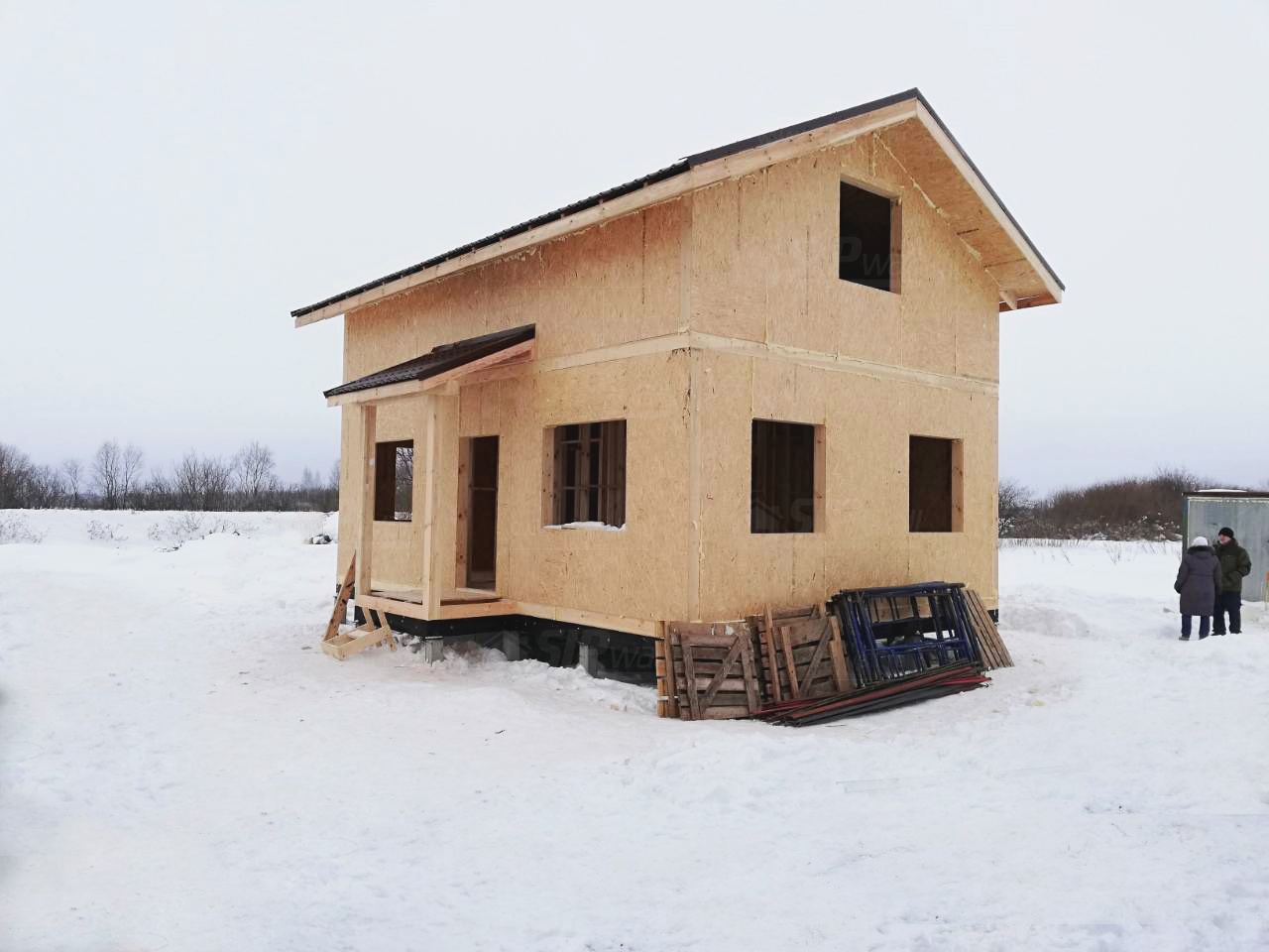 Домокомплект - изготовлен по проекту из СИП панелей произведенный по технологии SIPwall (ЭКОПАН) на собственном заводе расположенном в г. Шуя, Ивановской области. При изготовлении домокомплекта панельно каркасного дома используется только сухой строганный брус камерной сушки, обработанный огнебиозащитным составом.