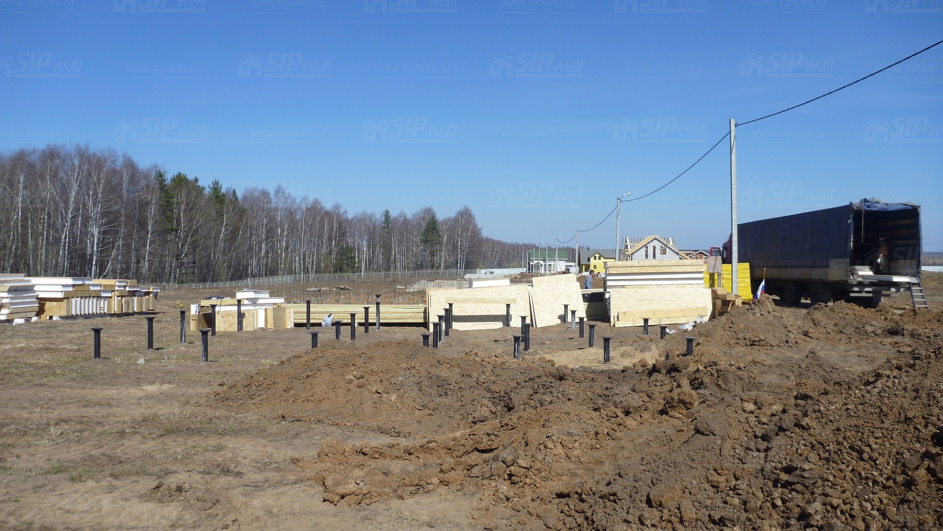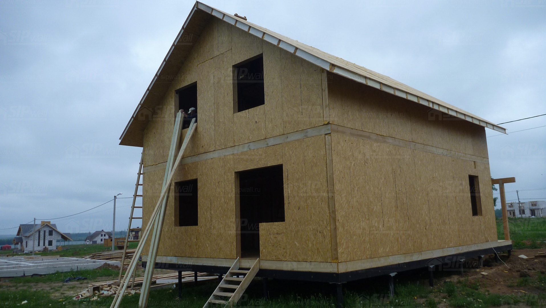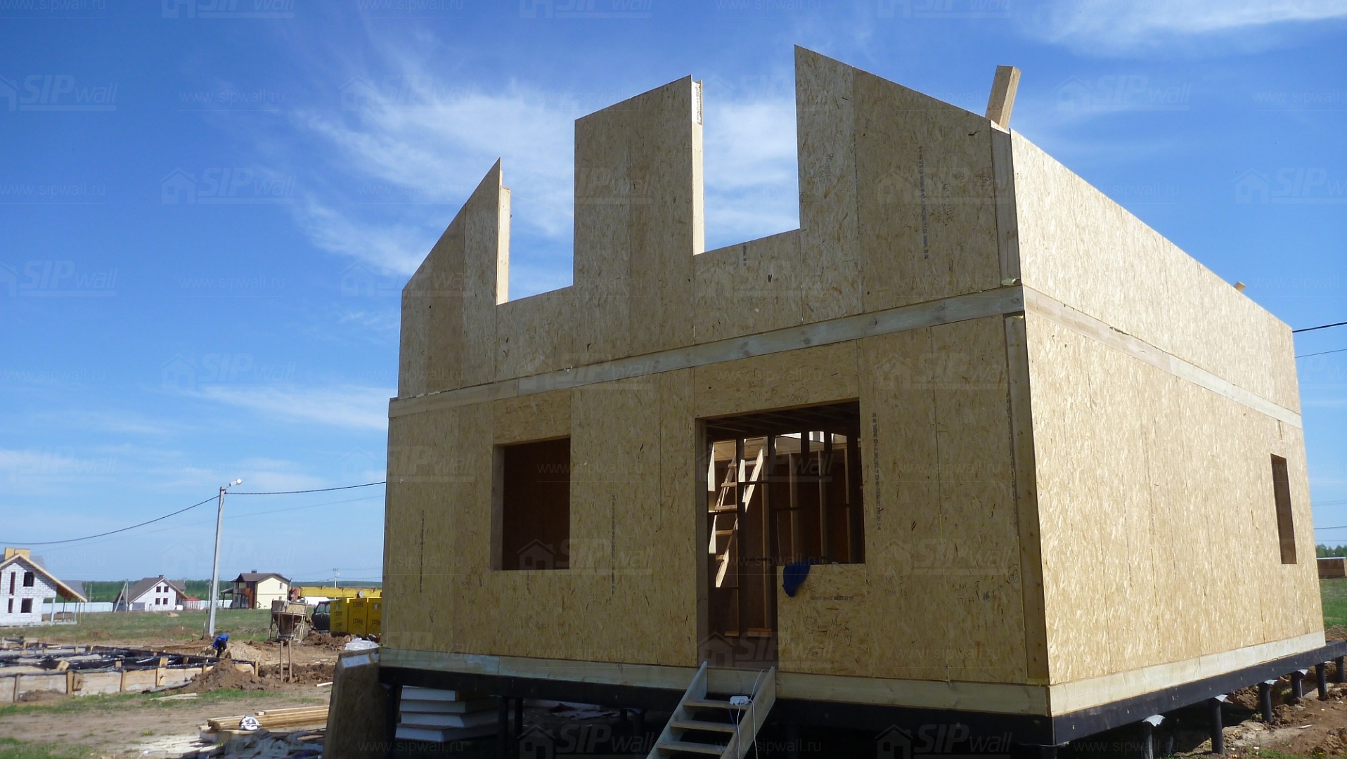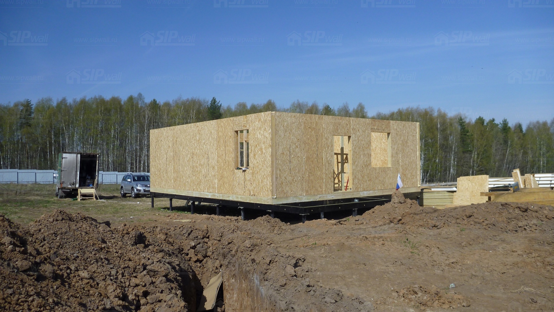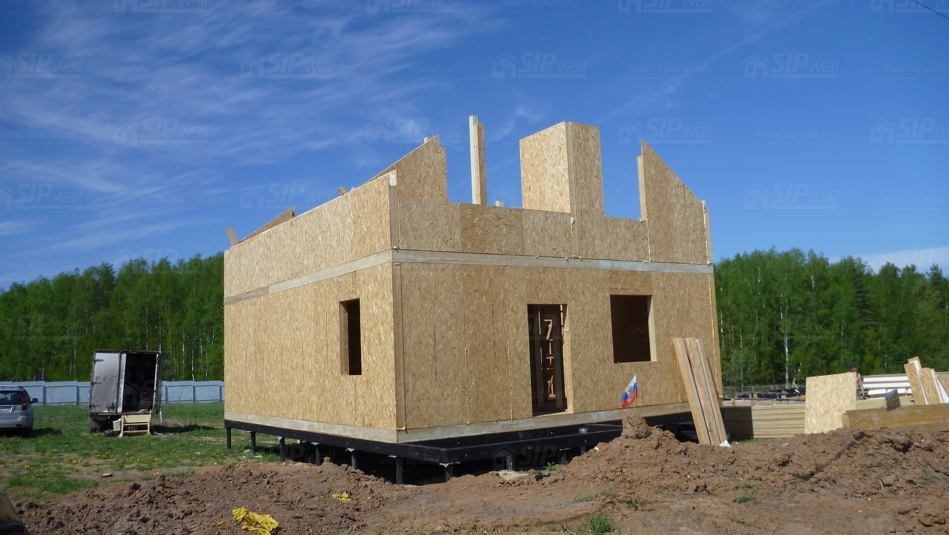 Все СИП панели SIPwall толщиной 224/174/124 мм (плиты OSB-3 толщиной 12 мм "Калевала" Россия и фасадный пенополистирол ПСБ-С 25 по ГОСТ 15588-14 толщиной 200/150/100 мм производства завода "PolarPlast", Россия) нарезаны и обрусованы сухим строганным брусом в соответствии с проектной документацией.
