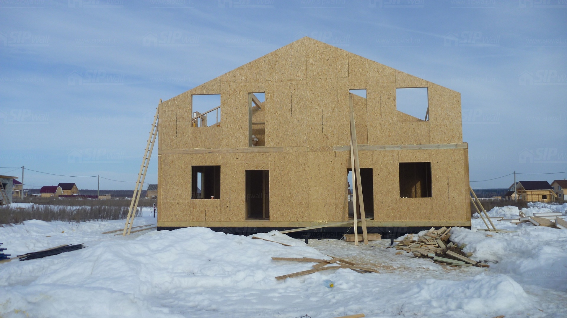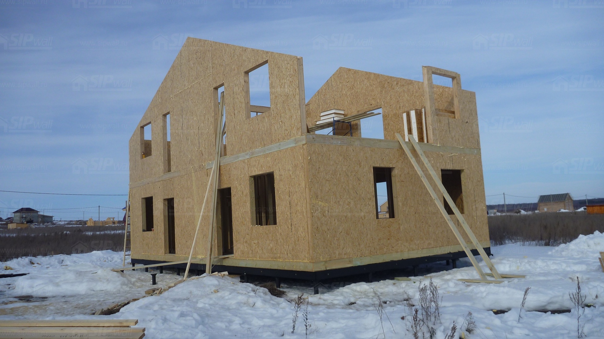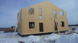 Все СИП панели SIPwall толщиной 224/174/124 мм (плиты OSB-3 толщиной 12 мм "Калевала" Россия и фасадный пенополистирол ПСБ-С 25 по ГОСТ 15588-14 толщиной 200/150/100 мм производства завода "PolarPlast", Россия) нарезаны и обрусованы сухим строганным брусом в соответствии с проектной документацией.