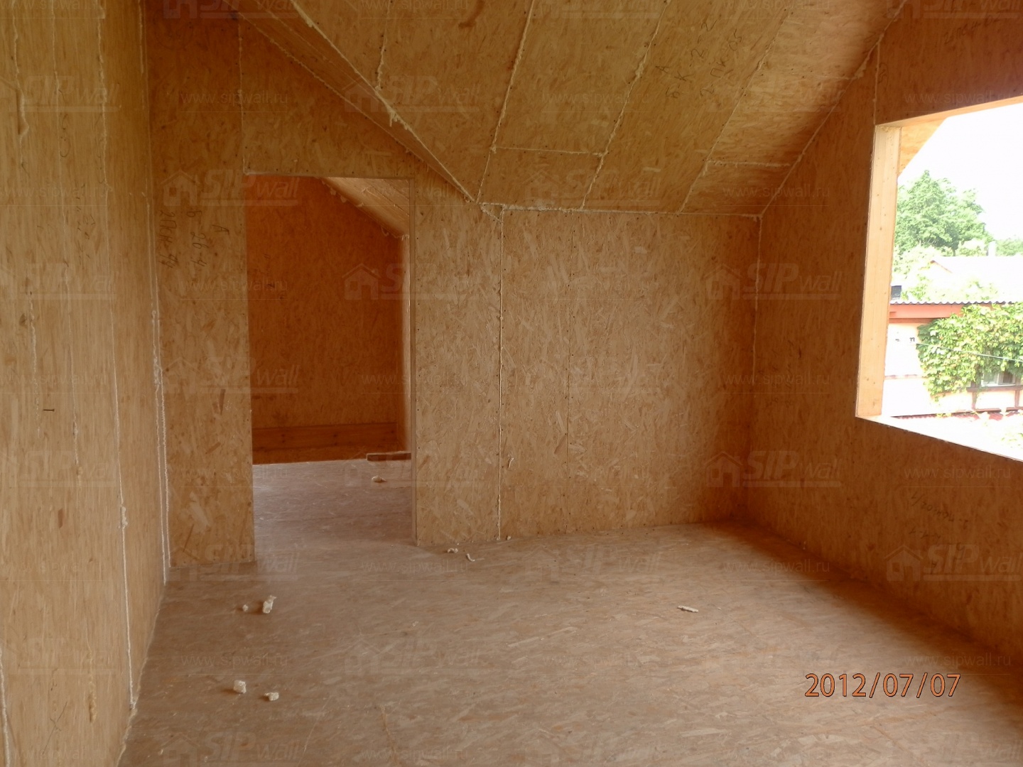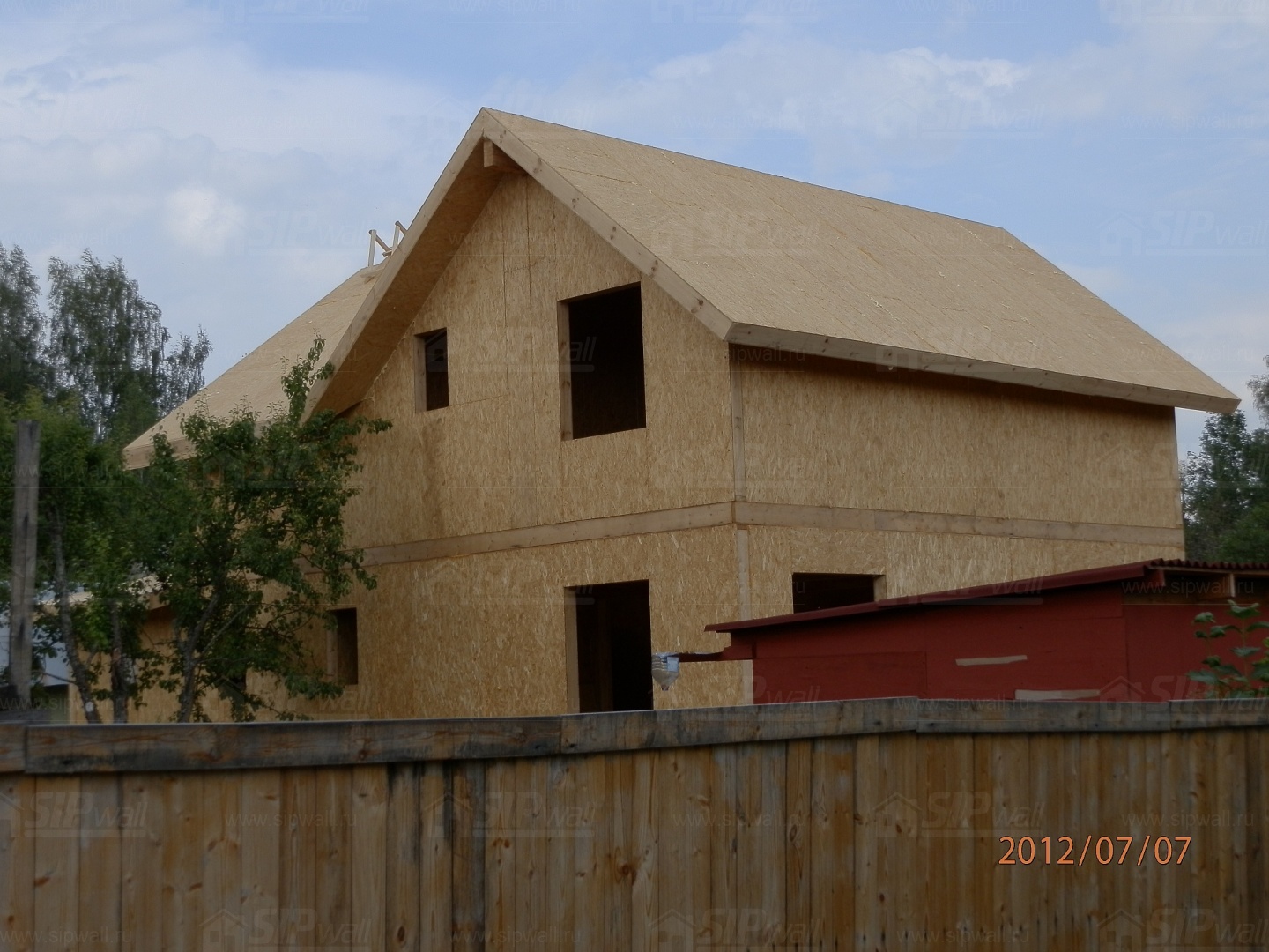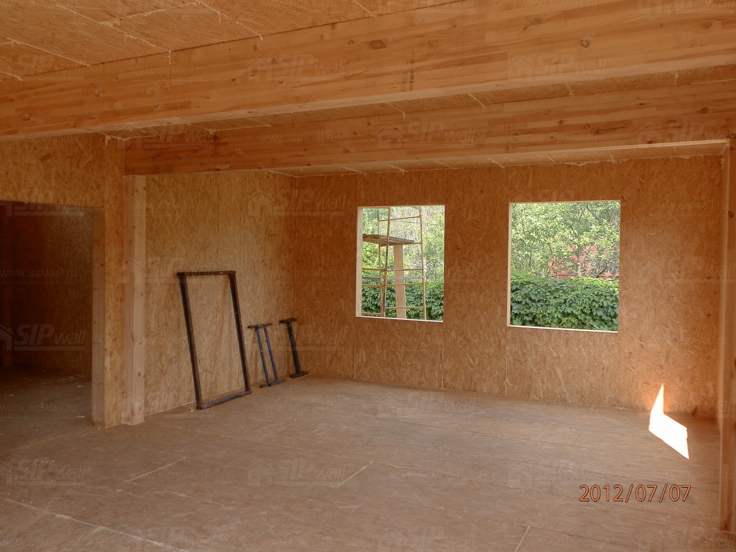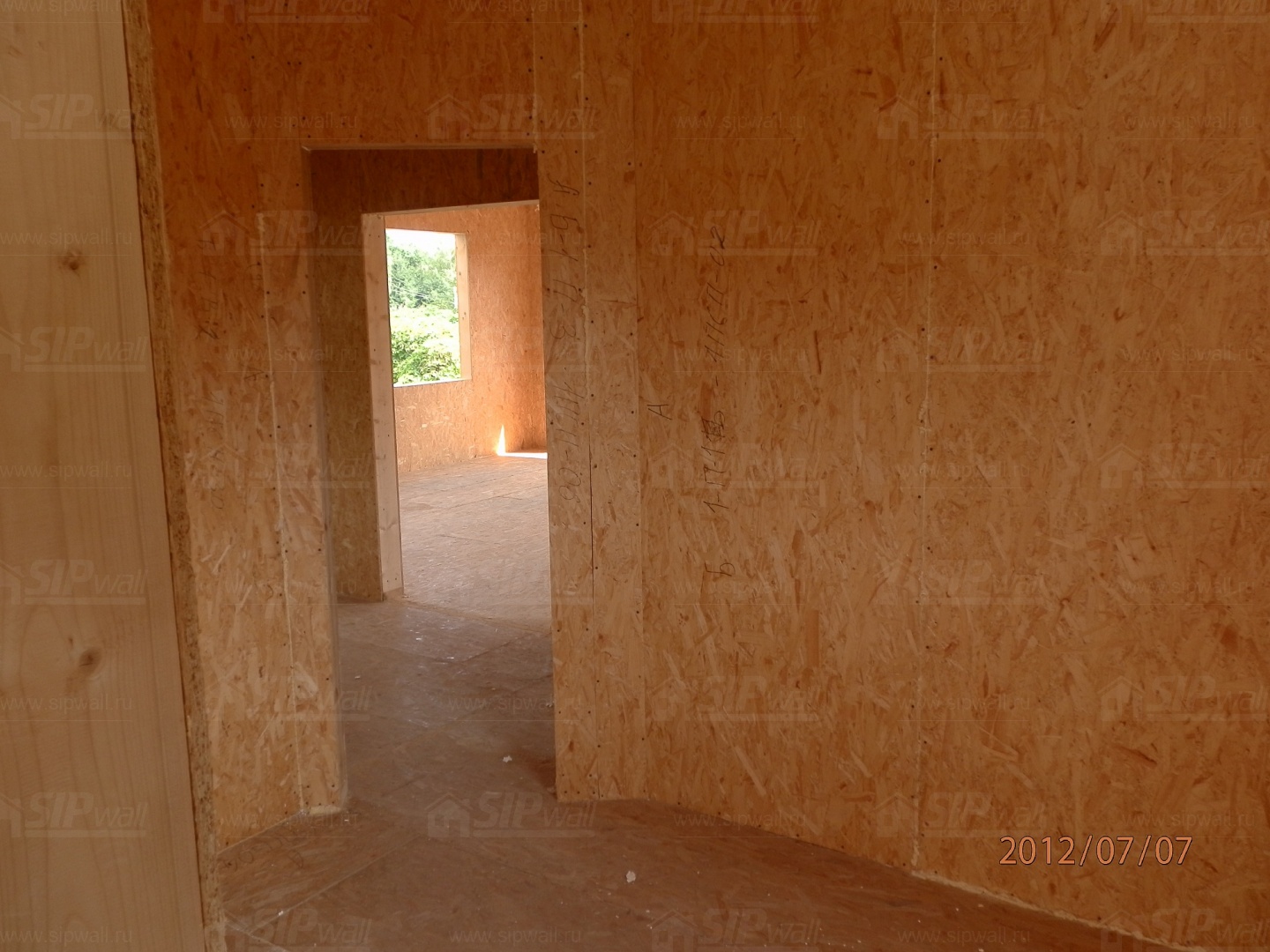 Все СИП панели SIPwall толщиной 224/174/124 мм (плиты OSB-3 толщиной 12 мм "Калевала" Россия и фасадный пенополистирол ПСБ-С 25 по ГОСТ 15588-14 толщиной 200/150/100 мм производства завода "PolarPlast", Россия) нарезаны и обрусованы сухим строганным брусом в соответствии с проектной документацией.